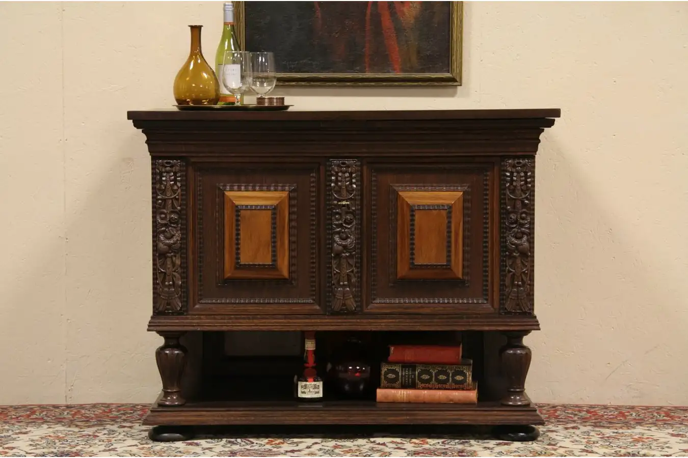 This distinctive Dutch design with deeply molded panels and large bun feet is a variation of the traditional "Kas" or dowry armoire that descended with the daughter of a family. The design dates from the 1600's, and this server would have been a part of a lavish dowry from an affluent family.