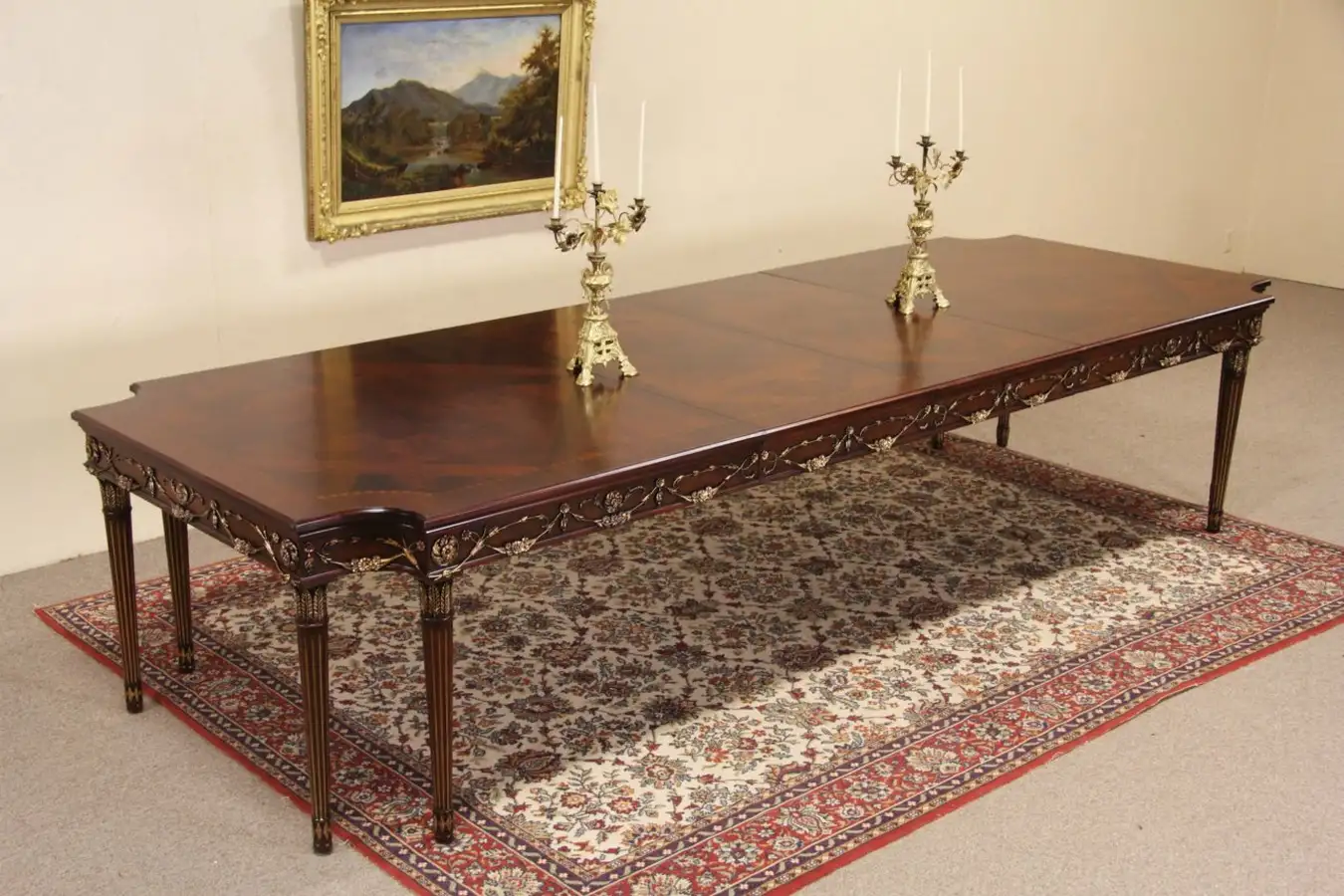 We recognize this lavish dining table with a banded and inlaid top and a carved base accented with bronze painting as by famous designer, "E. J. Victor," from the "Newport Mansions Italian Neo-Classical" collection, but the signature is lost so there is no proof.