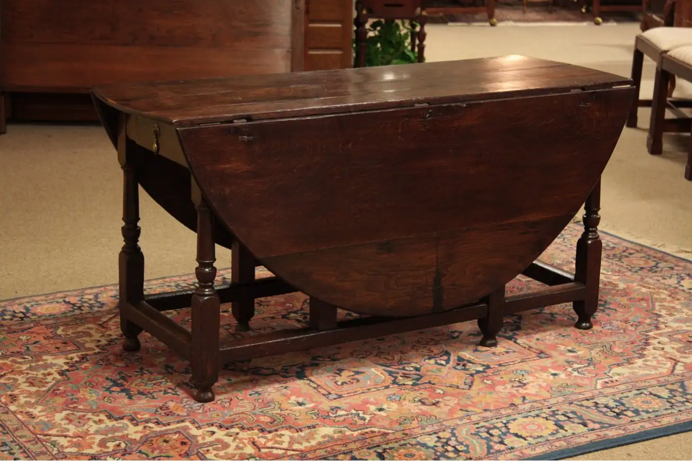 Authentic early 1700's hand-made antique furniture, this oak oval dining table has drop leaves supported by gate legs, and a drawer at one end. There have been many repairs and restorations over the centuries - see photos.