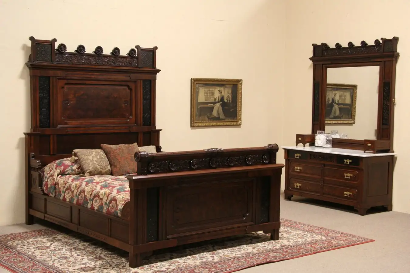 A magnificent 2 pc. bedroom set includes a queen size bed and dresser or chest with marble top and mirror, carved in the late Victorian or Eastlake style about 1880.