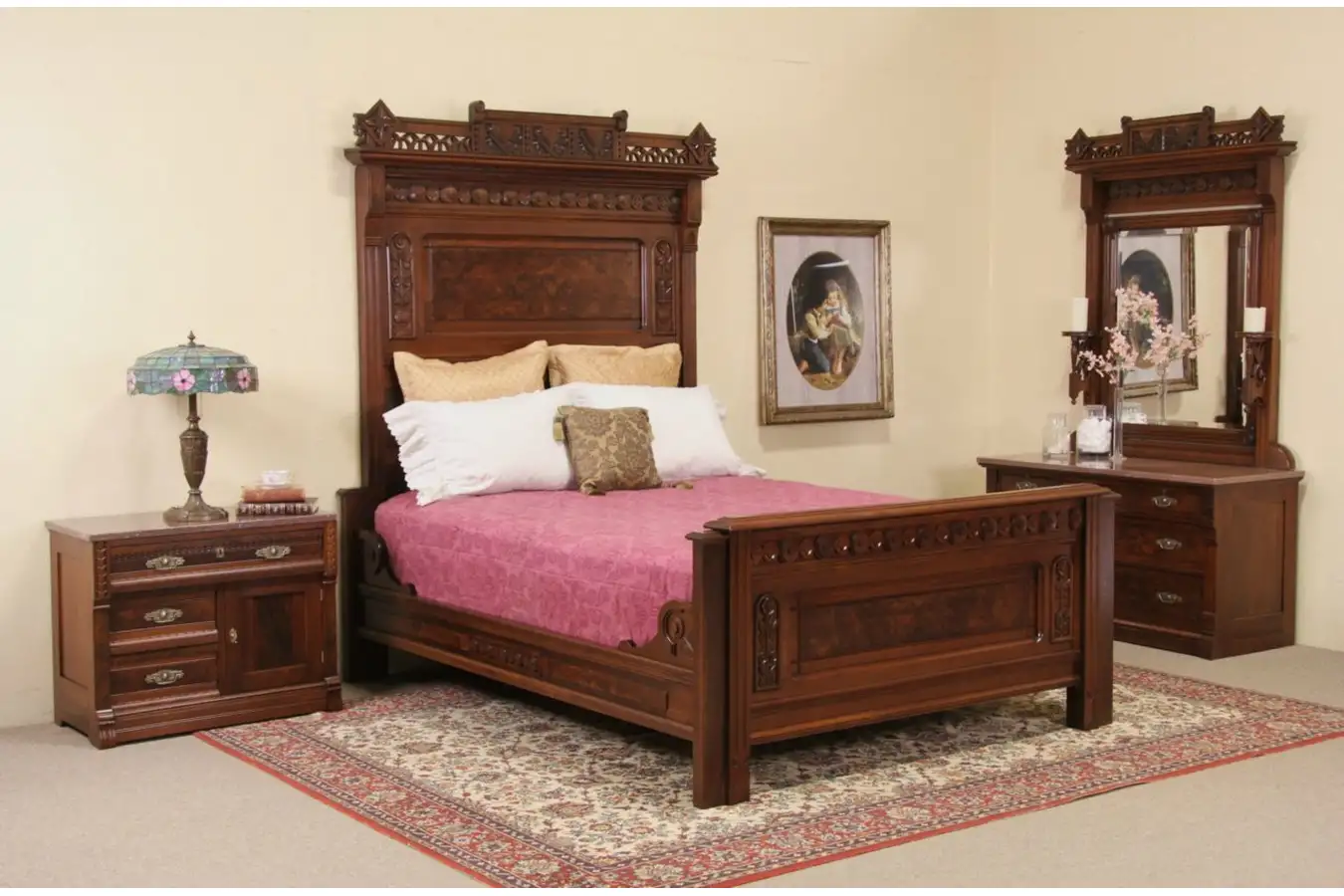 A magnificent 3 pc. bedroom set includes a queen size bed, dresser with mirror and a nightstand or commode with marble tops, carved in the late Victorian or Eastlake style about 1880.