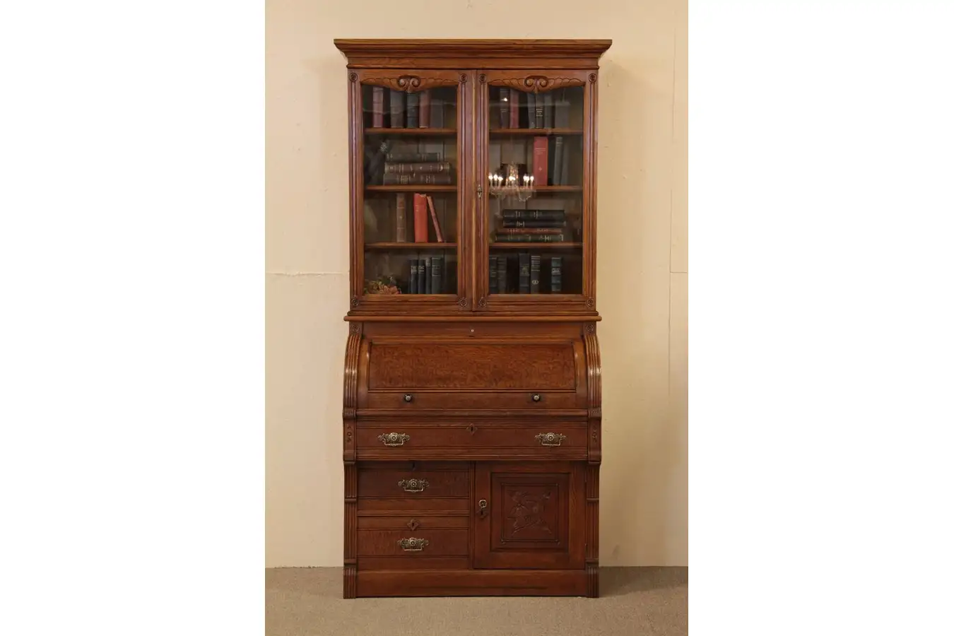 This classic Eastlake or late Victorian secretary desk has a barrel or cylinder roll top. Carved of solid oak with ash burl panels about 1885, the warm finish is superb with wonderful golden patina and very little wear. Incised or "spoon" carving is characteristic of the period.