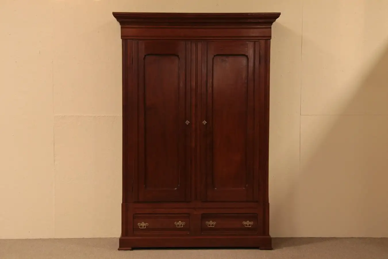 The rich reddish-brown finish is excellent. On the left side are tiny chips and shrinkage separations from age, see photos. The interior of this antique furniture is empty, it could be fitted with a closet pole or shelves if desired.