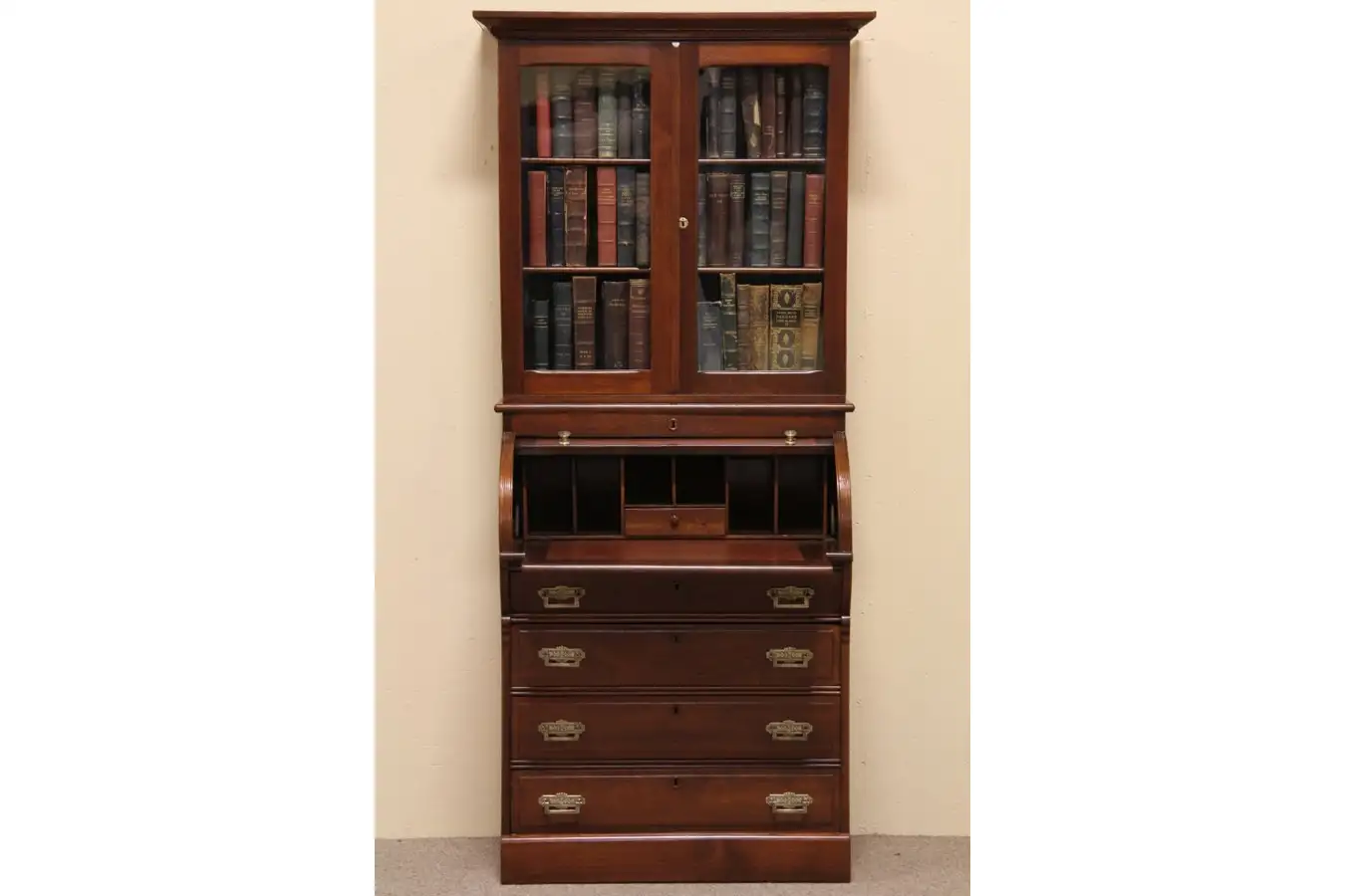 This late Victorian or Eastlake period cylinder or barrel rolltop secretary desk with bookcase top dates from the 1880's.