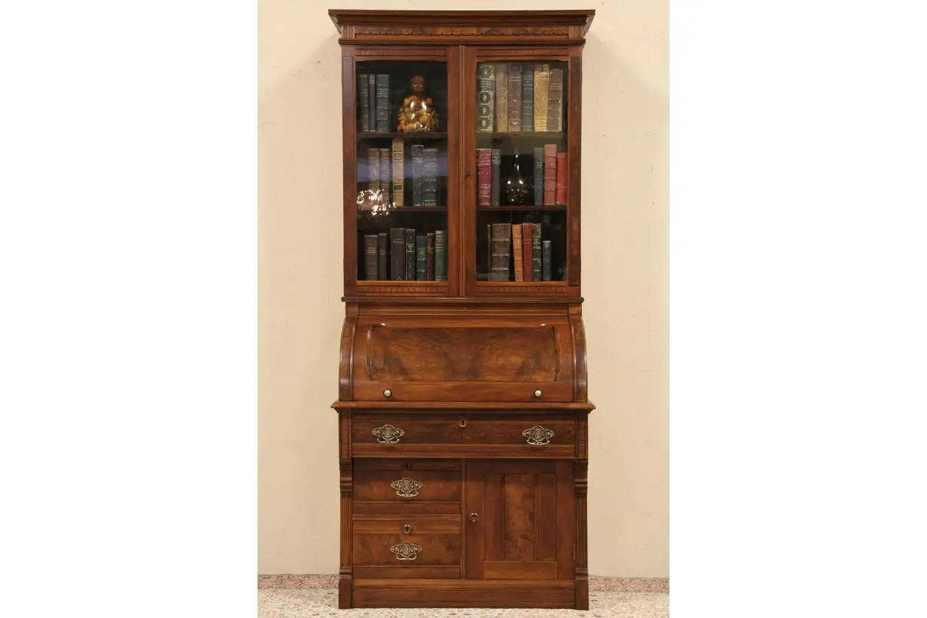 Very well-proportioned, it is made of solid walnut with a smooth gliding cylinder or barrel roll top of beautiful matched burl. The finish is excellent with warm patina, and behind original wavy glass doors are adjustable bookshelves. Both door locks and keys are working.