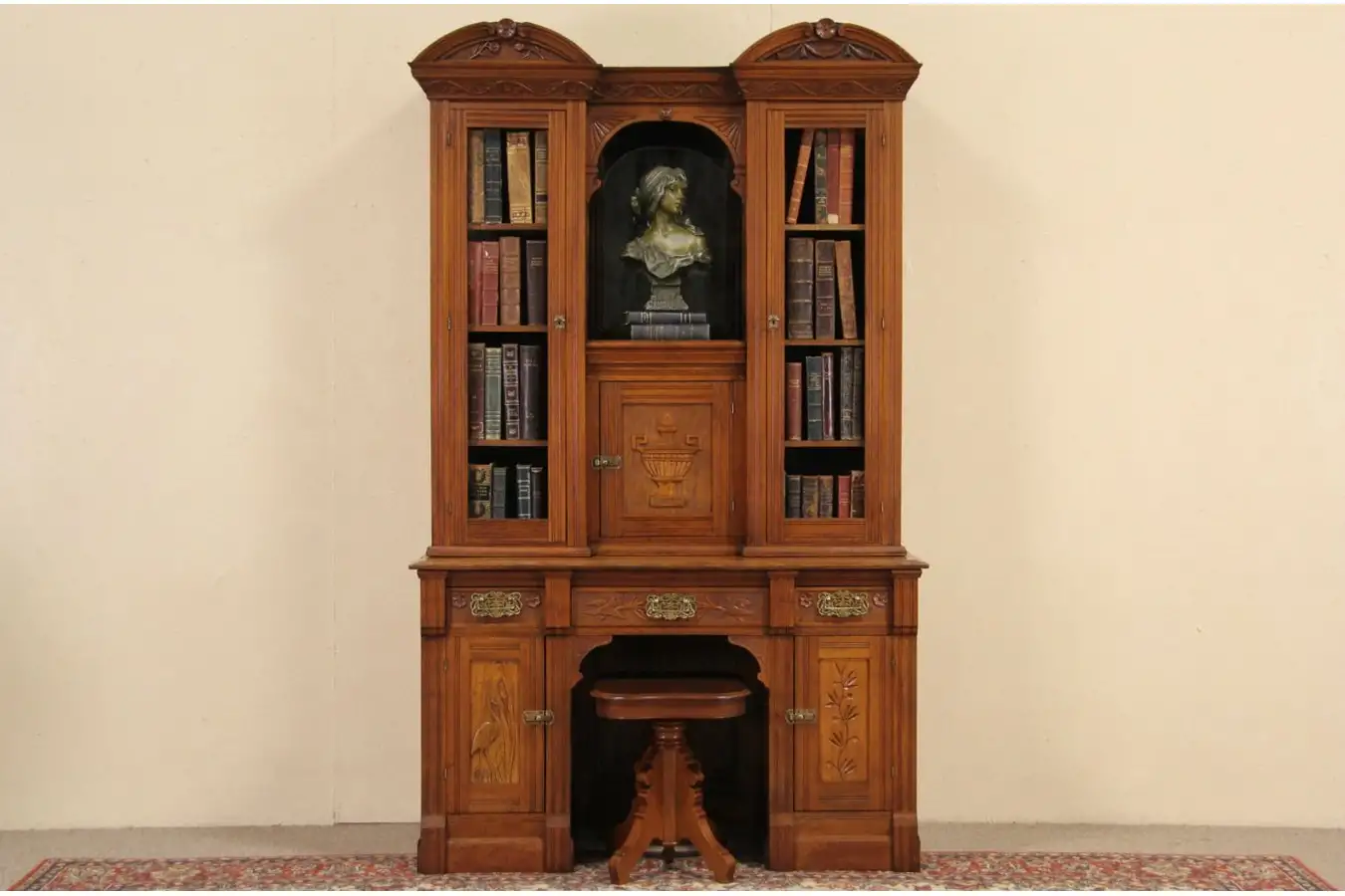 A lovely secretary desk with double bookcases was artfully hand carved by a master with bird and foliage vine motifs about 1870, during the late Victorian or Eastlake period.