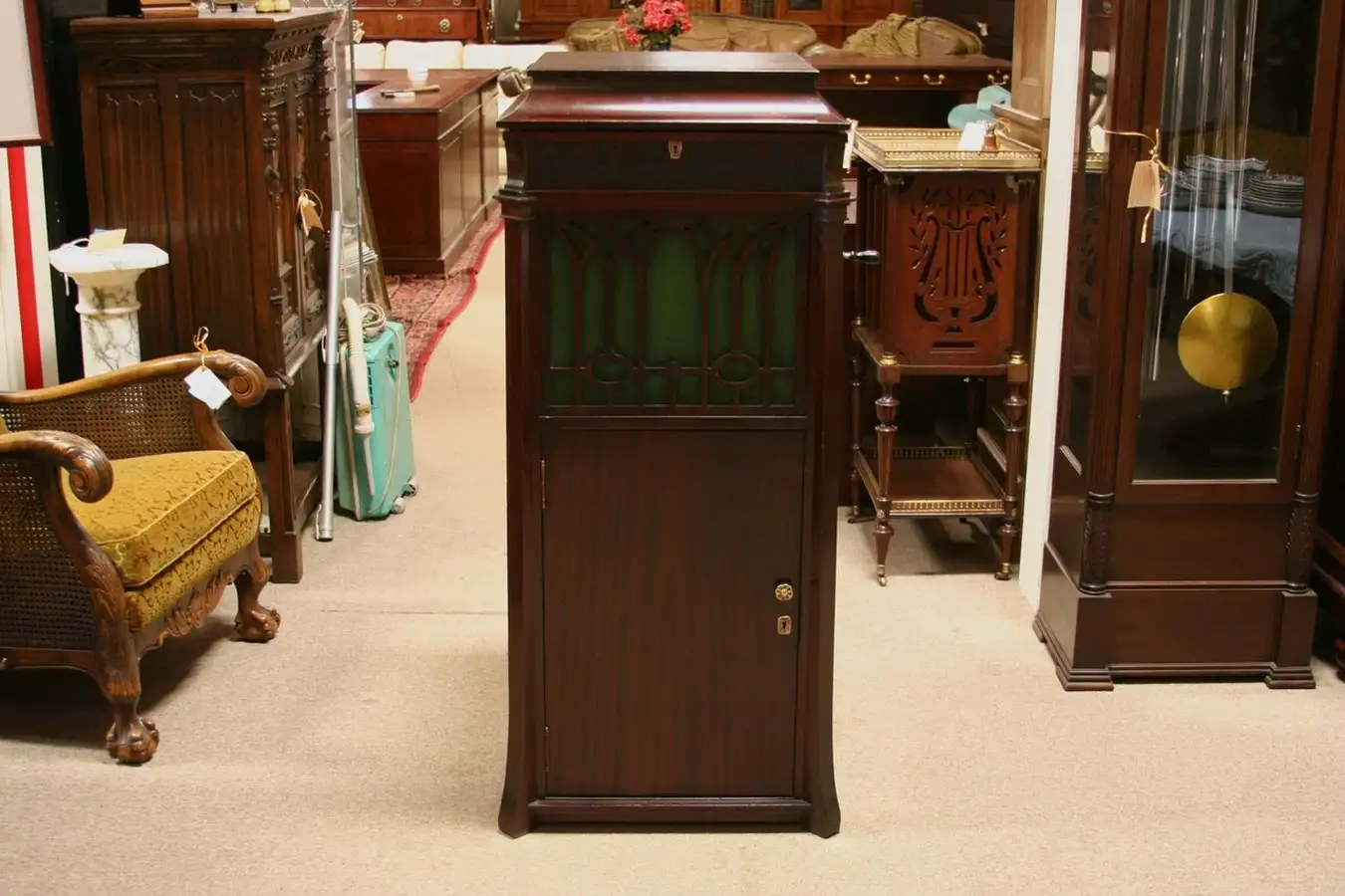 Hardware, fittings and diamond needle are all intact. In the base are 2 drawers and a few Edison records to get started with. The sound quality on this antique phonograph is excellent, the Edison has superior sound compared to the Victrola machines. Size is 24" deep, 22" wide and 50" tall.