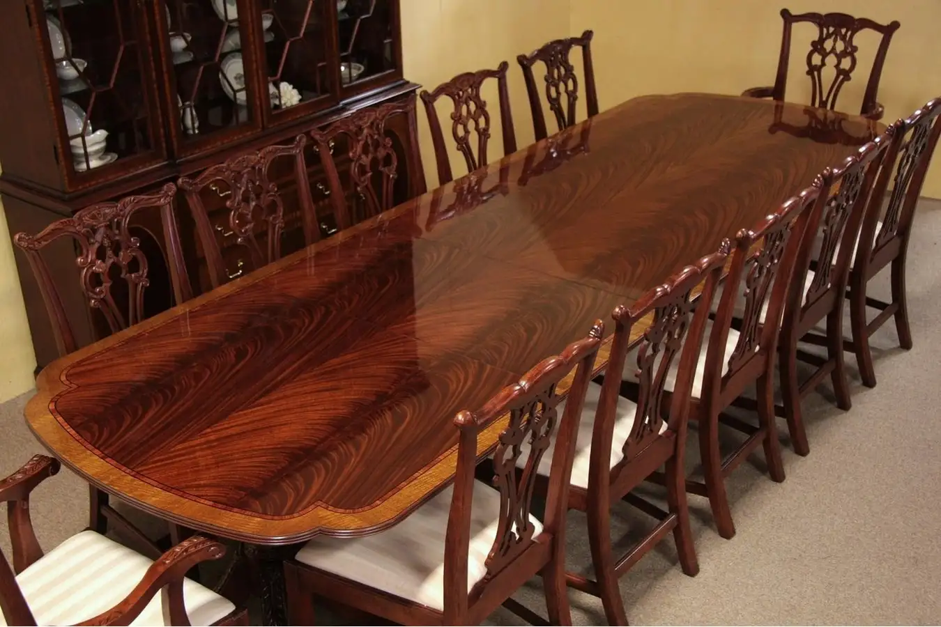 This dining table is a modern reproduction or replica of 18th Century Georgian or Federal Period furniture. These famous designs are prestigious classics, which are new or almost new from famous American table makers. Sometimes they are from designer showrooms, furniture trade shows, or custom order cancellations. Sets are offered at a price far less than furniture stores, and therefore the original signatures are removed by the makers. After carefully inspecting these traditional tables they are polished as needed. There are only very tiny mars or scratches, and we proudly present this historic and impeccable furniture at remarkable savings.