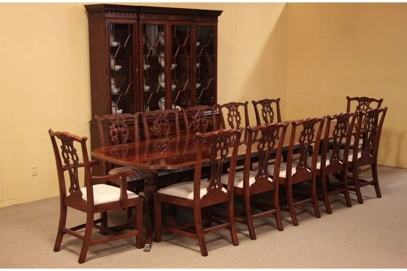 The 12 pierced and hand carved chairs are solid mahogany with graceful lines and soft seats, 21" high, that are easily re-covered if desired. Rungs between the legs are for added strength. The two armchairs are 26" wide, 23" deep and 41" tall, the 10 side chairs measure 22" wide, 23" deep and 41" tall. There are tiny variations and irregularities that show they were truly hand carved, the semi-glossy finish is excellent.
