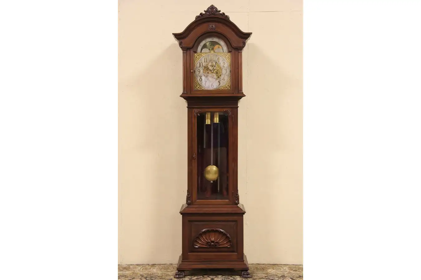 A stately tall case or grandfather clock was hand carved of solid mahogany about 1900, the movement is signed "Elite, Germany."