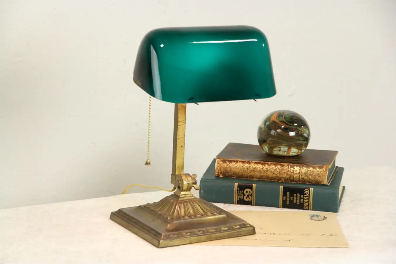 Signed by famous maker, "Emeralite, Pat. Aug. 15, 1916, NY, USA," this marvelous "banker's" desk lamp has an original emerald green glass shade. Another patent on the arm is 1917.