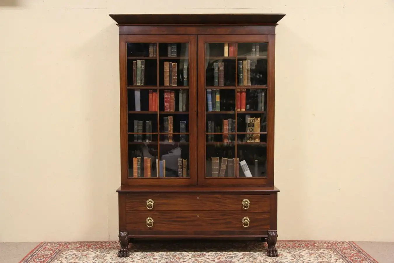 An American Empire period 1830's bookcase has beautiful lines and carved lion paw feet. Antique wavy glass panes are charming, the lock does not work and the key is a handle only. The right door has an original brass rim.