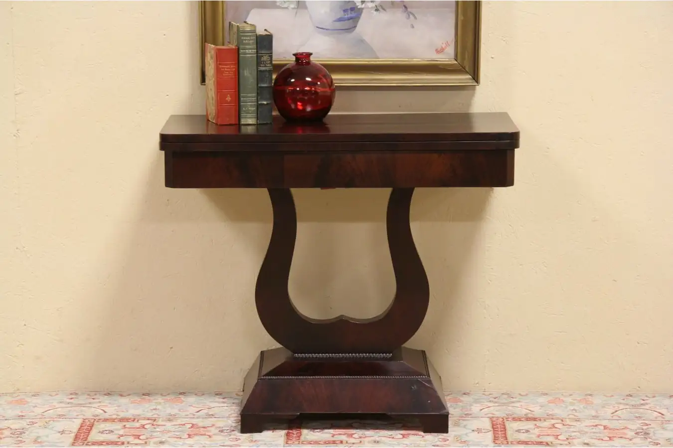 Authentic American Empire period furniture from about 1840, this beautiful wall console table has a flip and swivel top that opens into a game table. Mahogany with matched flame grain, the classical lyre shaped base is well proportioned.