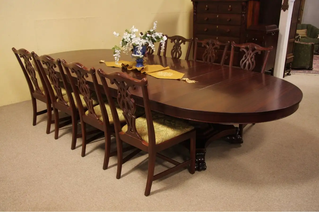 Solid mahogany, the top has gorgeous grain, and the pedestal is matched flame grain mahogany. This historic furniture has a rich deep satiny finish in excellent condition. All four feet are carved solid mahogany lion paws. When extended, the pedestal splits open to reveal a center leg for extra support. The table opens smoothly, the leaves fit and match very well. Six or eight can be seated around the table when closed, and 12 to 14 with all leaves in.