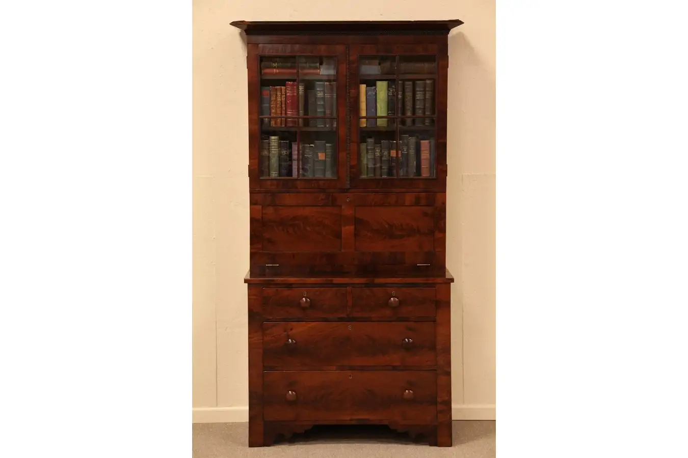 Mahogany with matched flame grain panels, the polished finish is very beautiful with gorgeous patina and antique character - there are touchups and repairs of various ages. Drawers have hand-cut dovetails, the two tiniest drawers above the writing surface have been rebuilt. On the inside of the drop front are old inkstains and a wonderful script signature, "G. Fletcher," the rest is indecipherable. The interior is accented with butternut, ash and pine.
