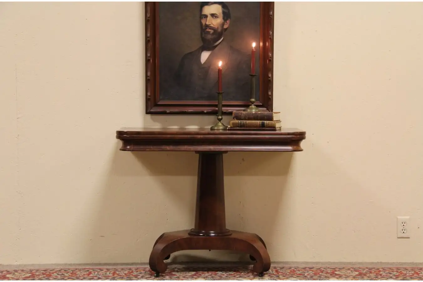 Authentic American Empire furniture from about 1835, this is one of the most graceful and elegantly proportioned console or game tables we have ever seen. The flip and swivel top can be opened against the wall in console position, or it makes a square table for playing games. Underneath is a "secret" compartment for gaming pieces or cards.