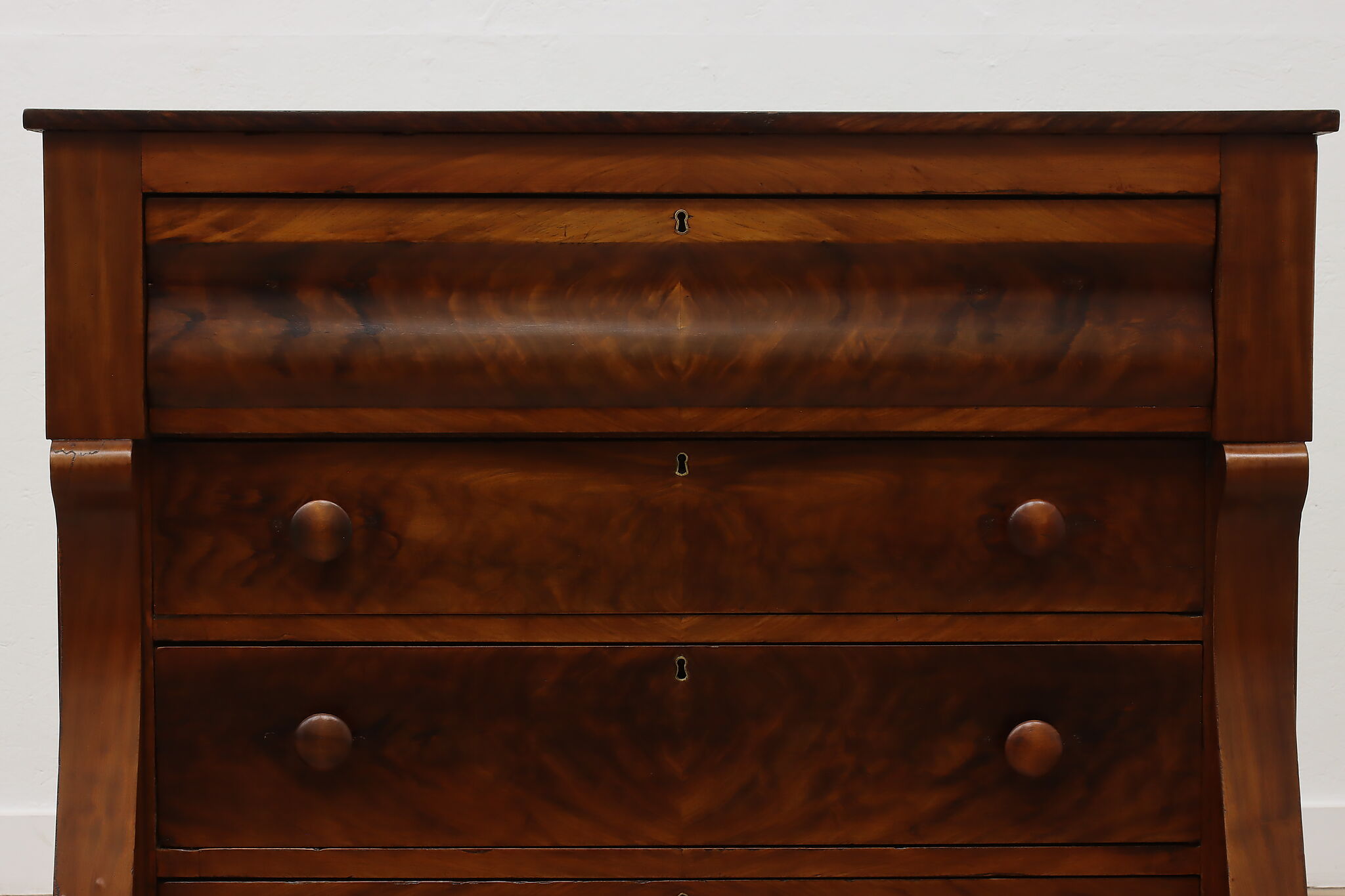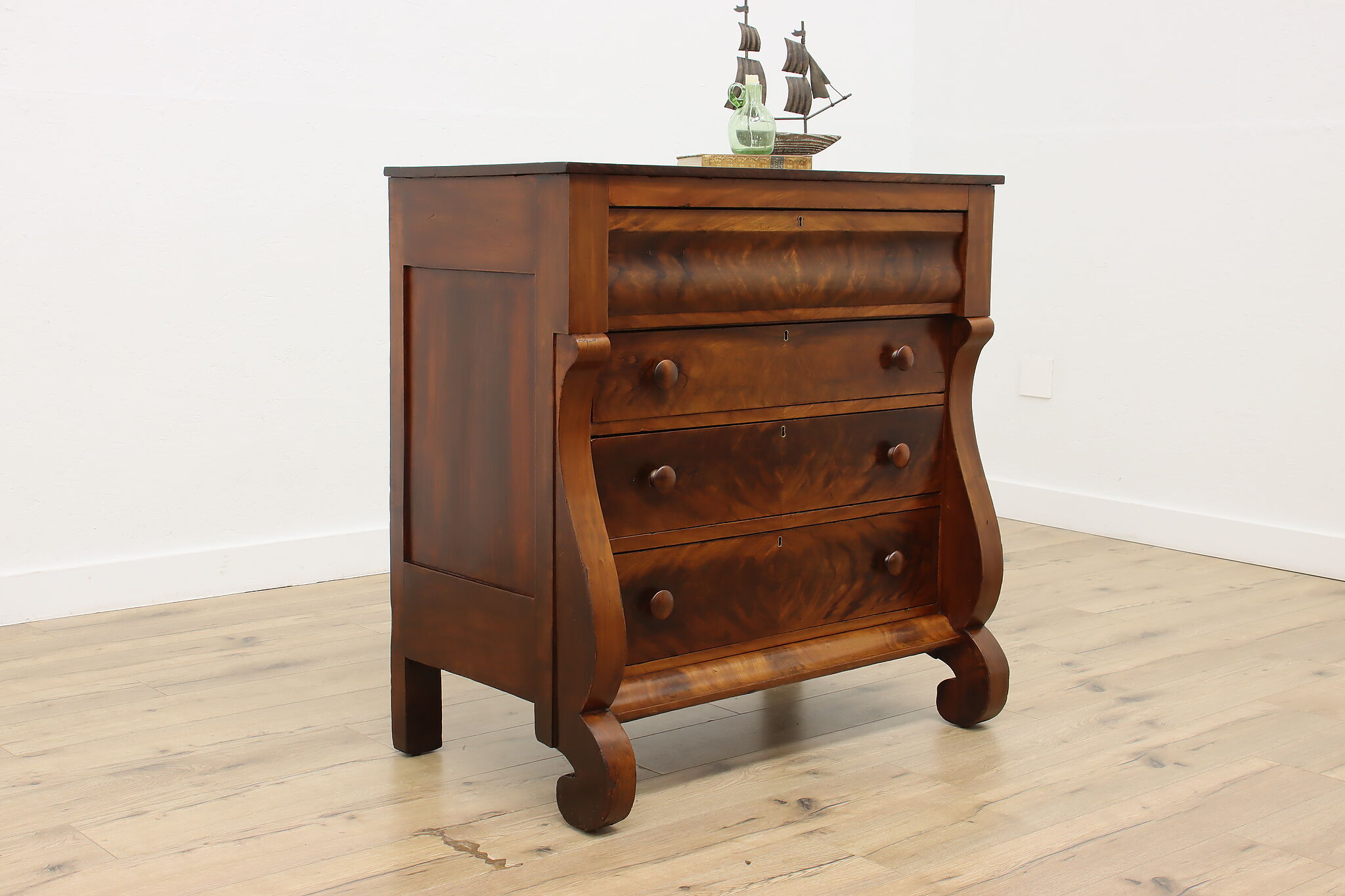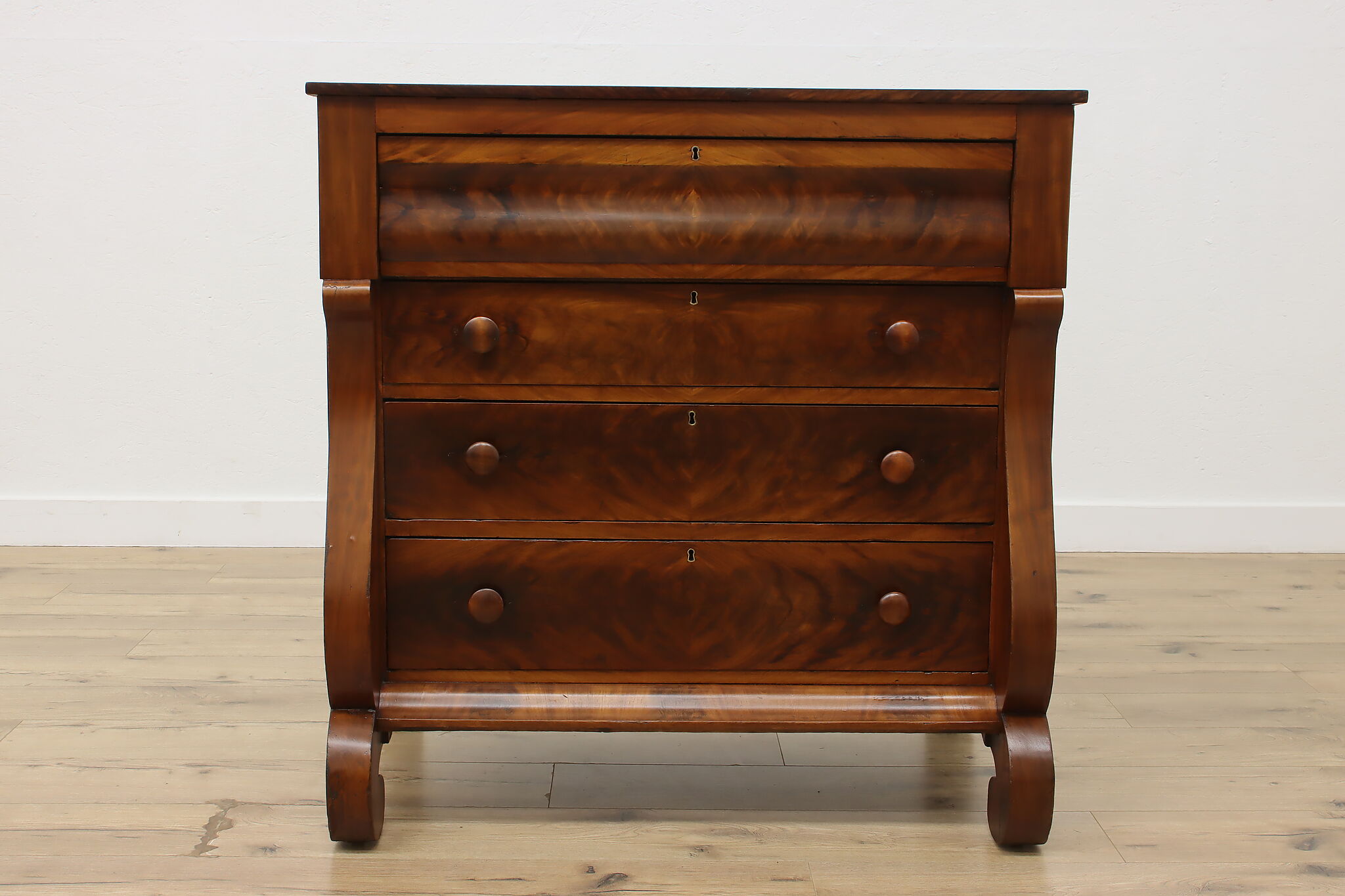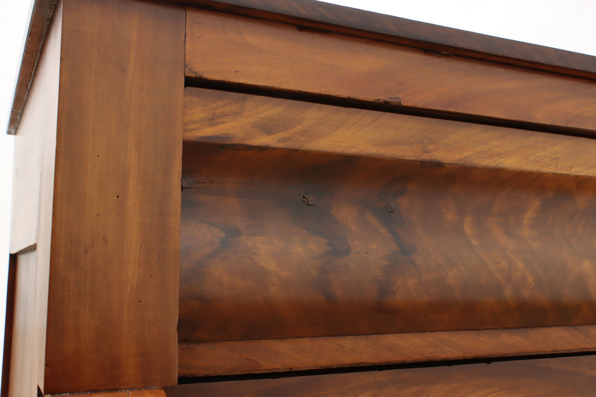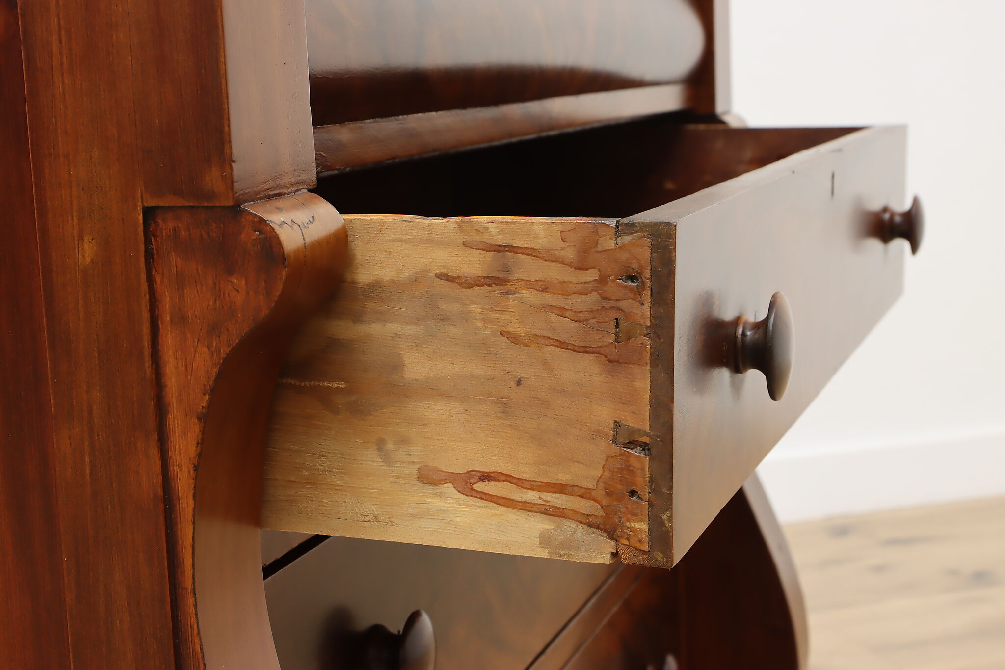 This Empire period dresser or tall chest has gorgeous bookmatched flame grain mahogany drawer fronts.