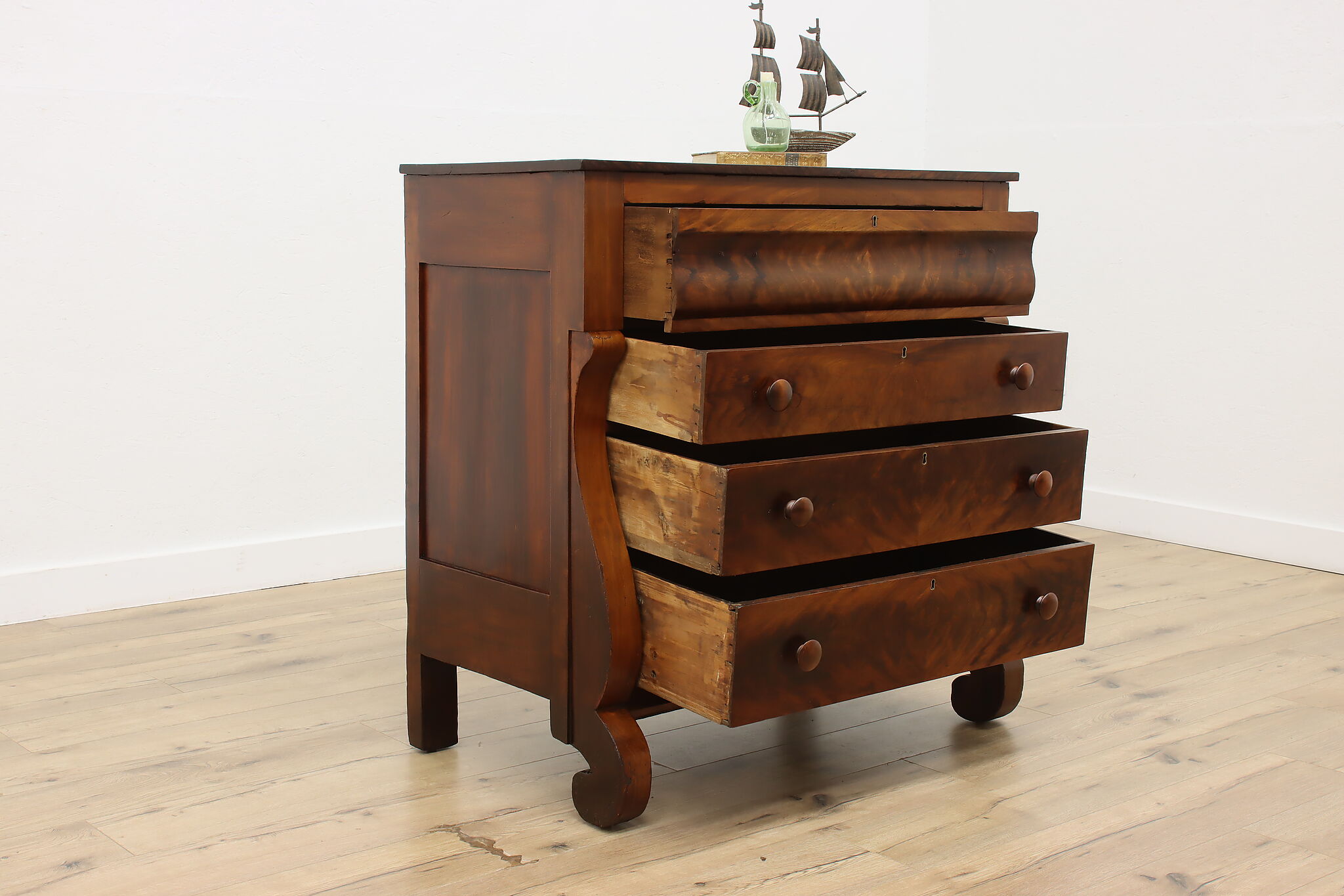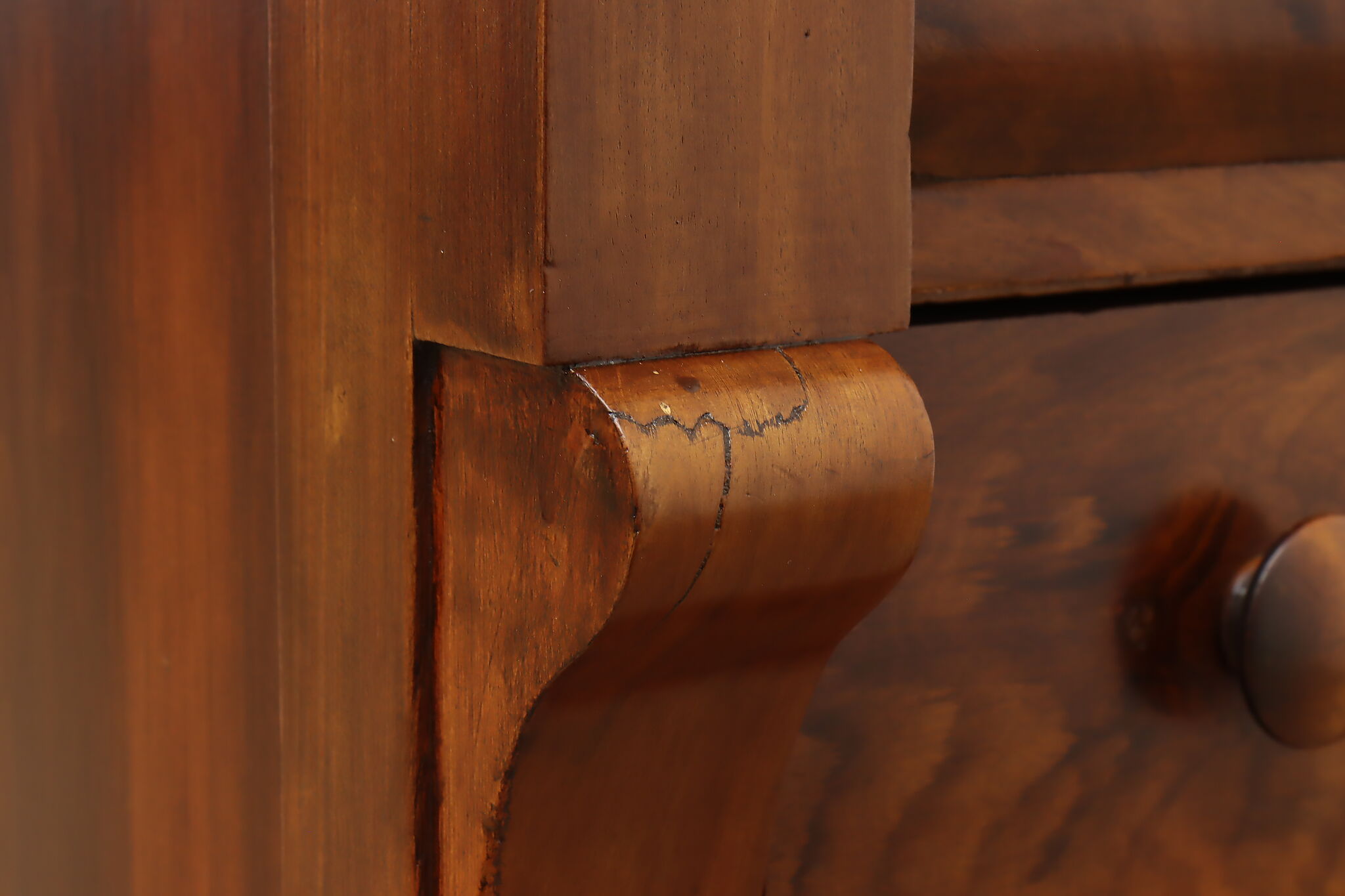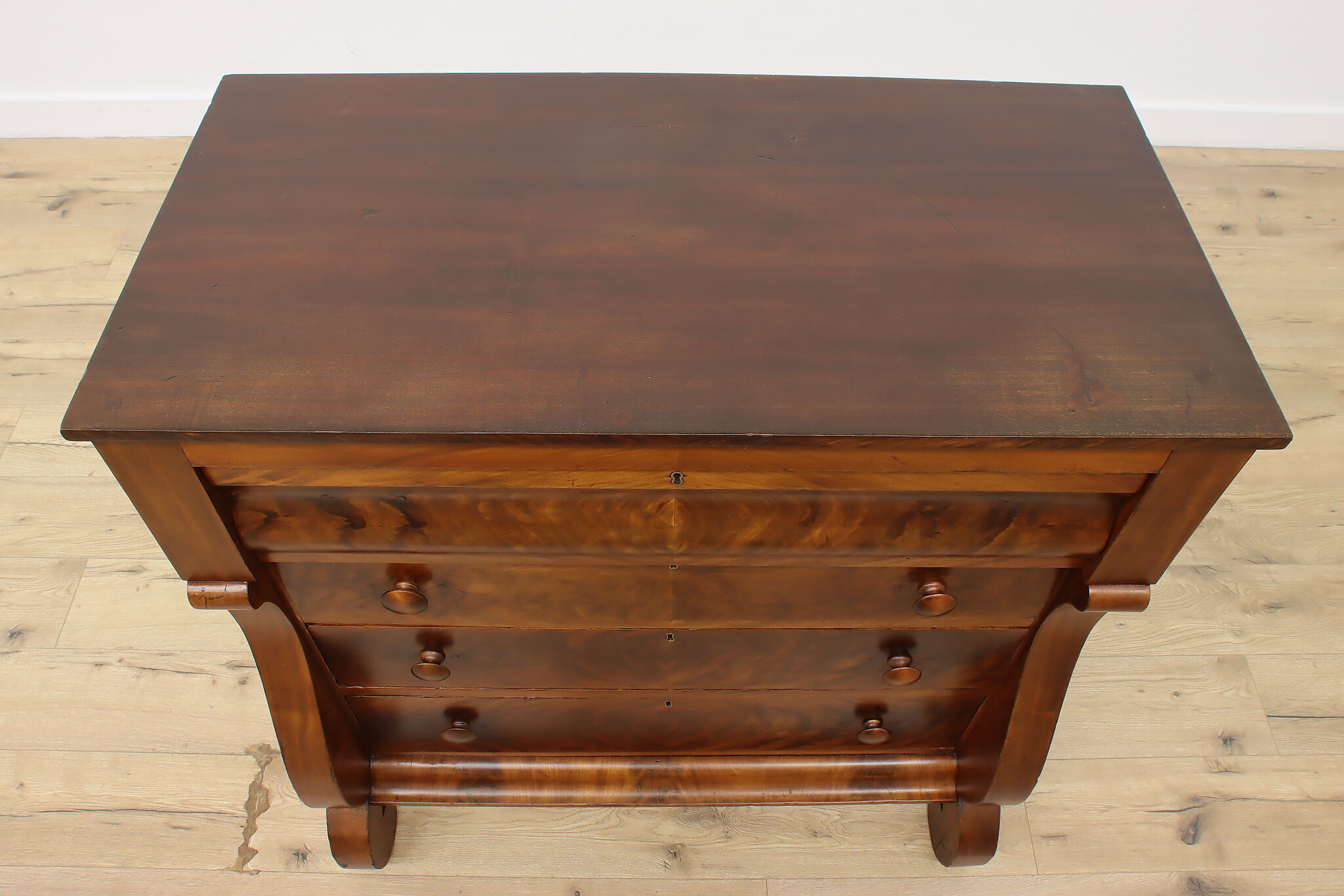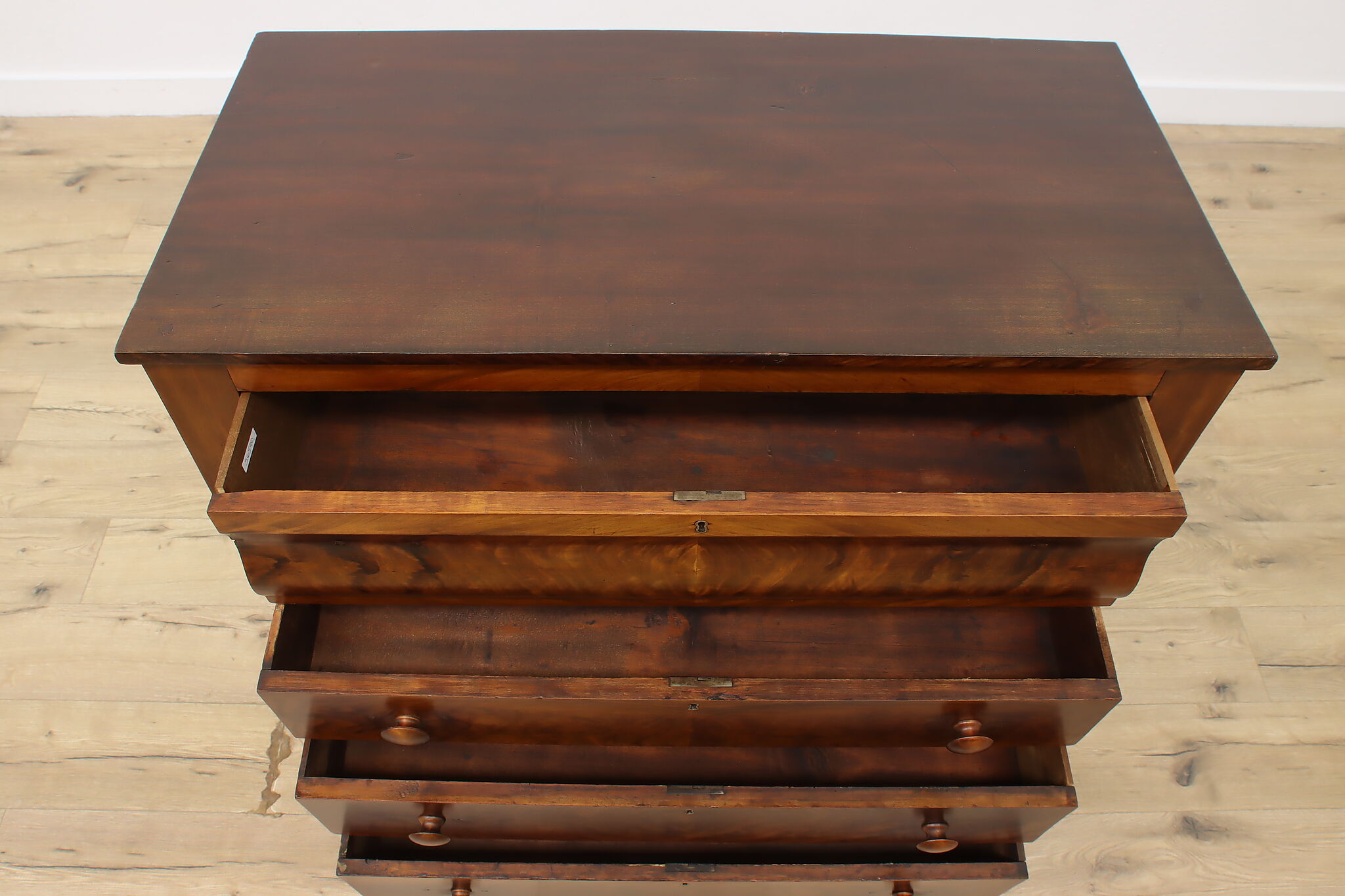 This Empire period dresser or tall chest has gorgeous bookmatched flame grain mahogany drawer fronts.