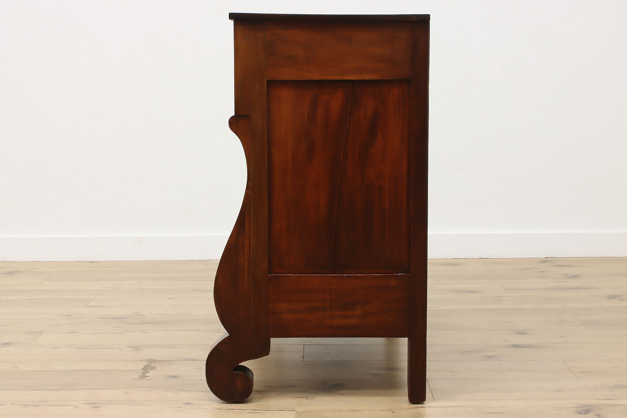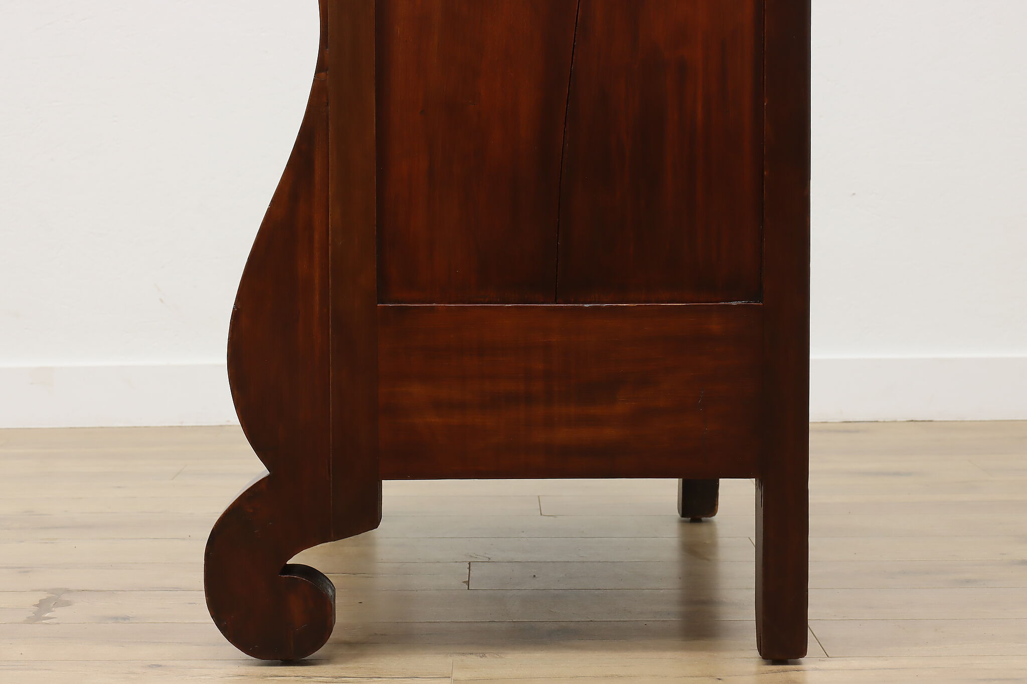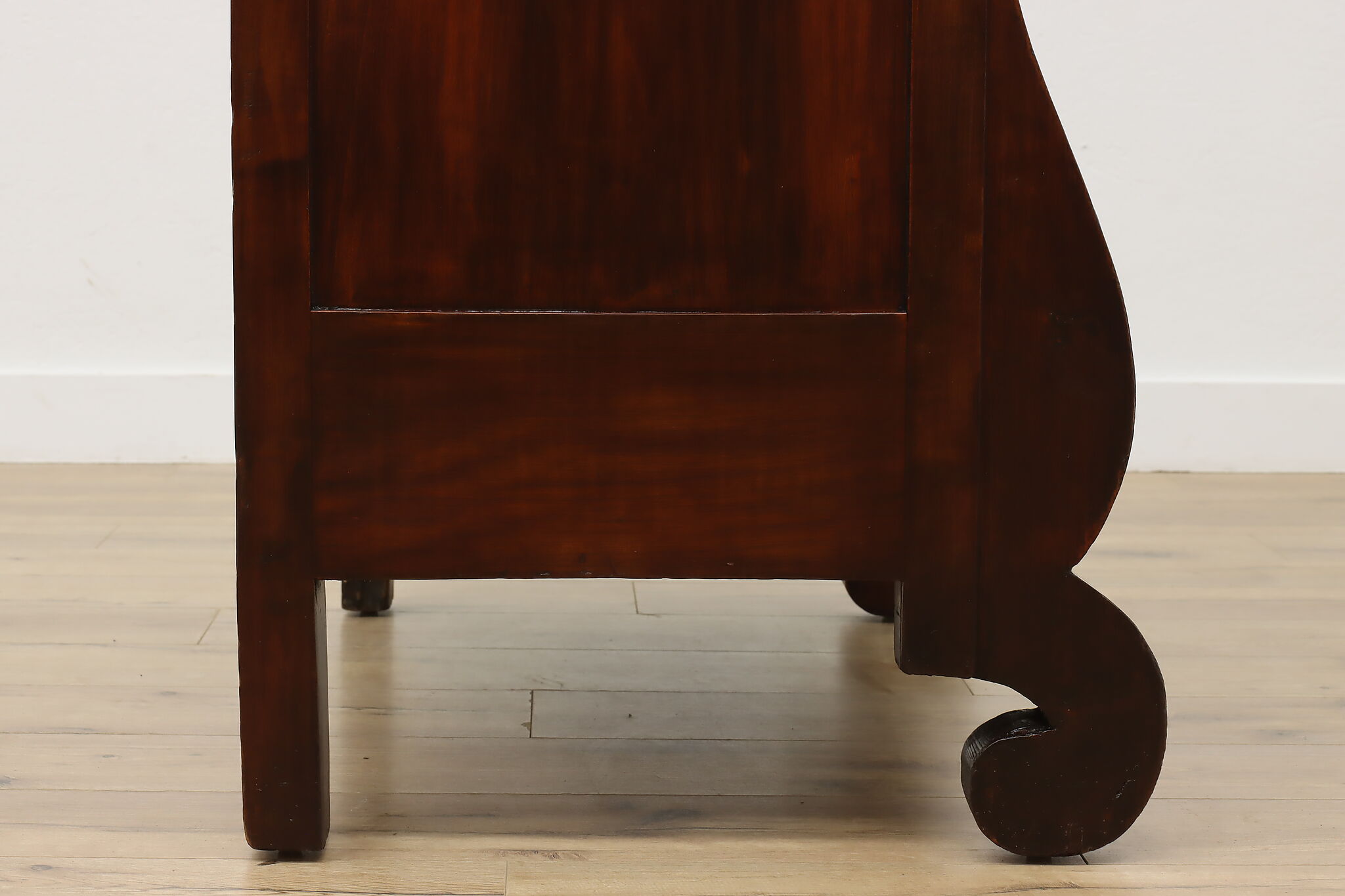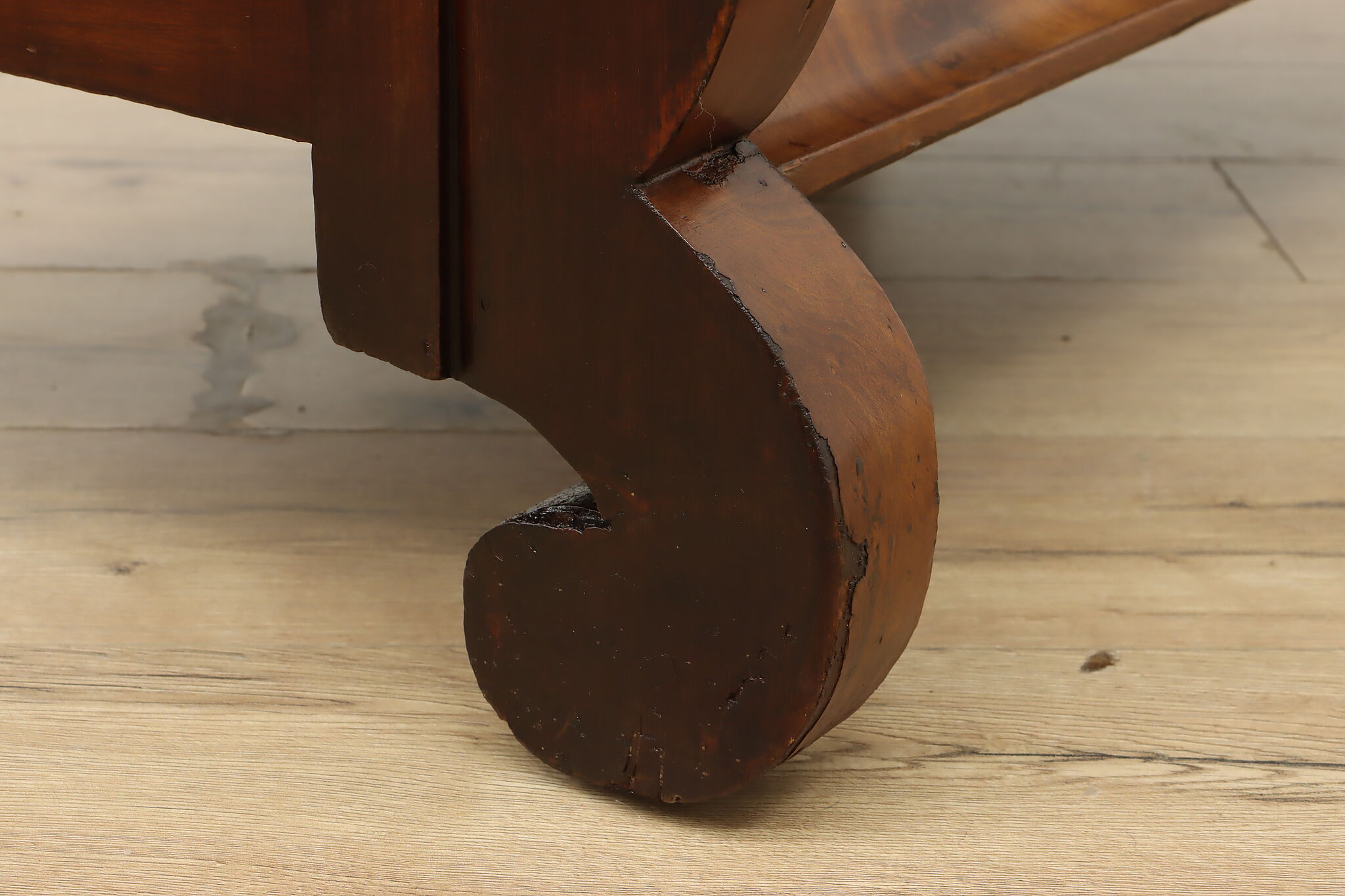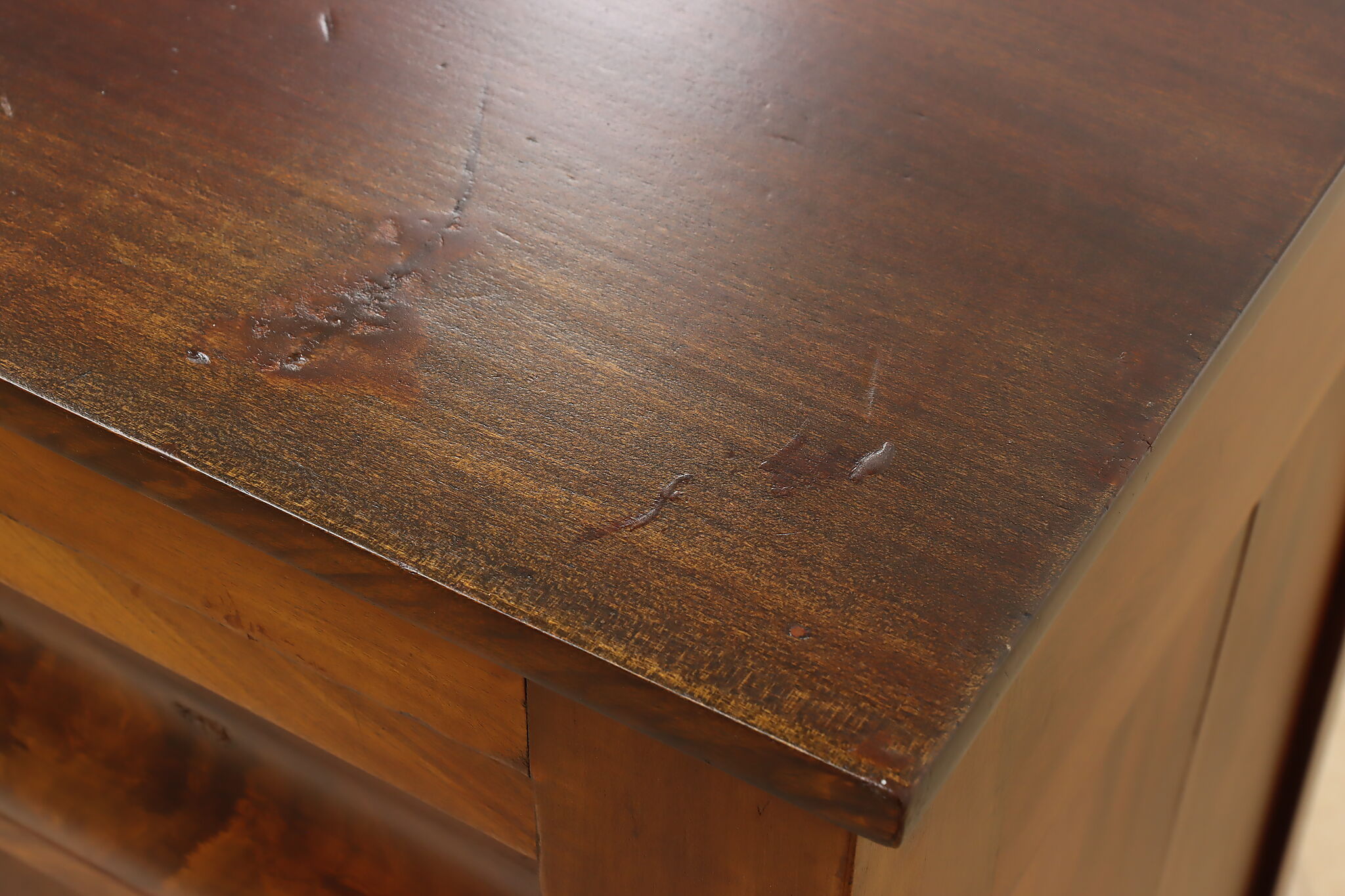 This Empire period dresser or tall chest has gorgeous bookmatched flame grain mahogany drawer fronts.