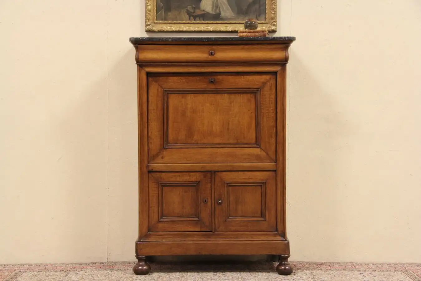 An authentic Biedermeier or Empire period secretary desk from about 1840 has a marble top with natural fossils. Hand crafted of solid oak, every piece is hand planed.