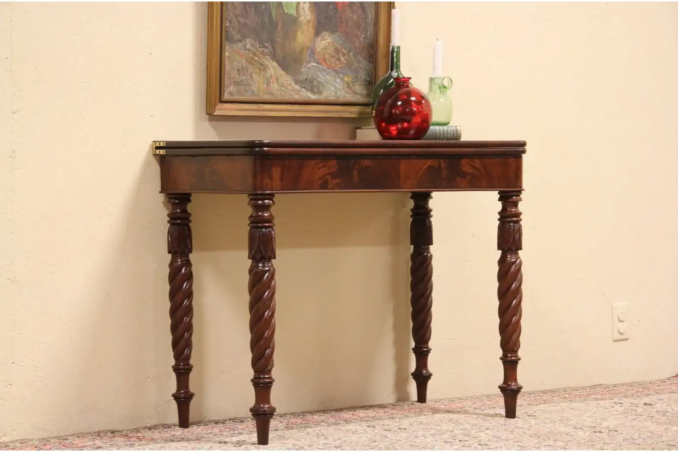 Authentic American Empire period furniture from about 1820, this solid mahogany console table has a flip and swivel top that opens to a square game table.