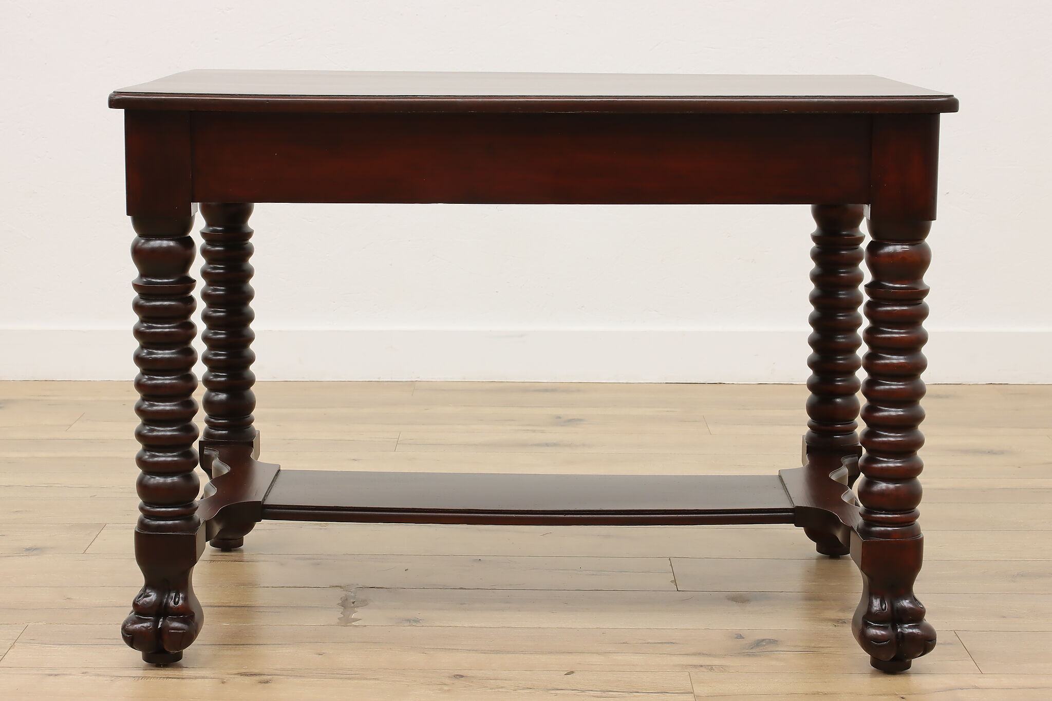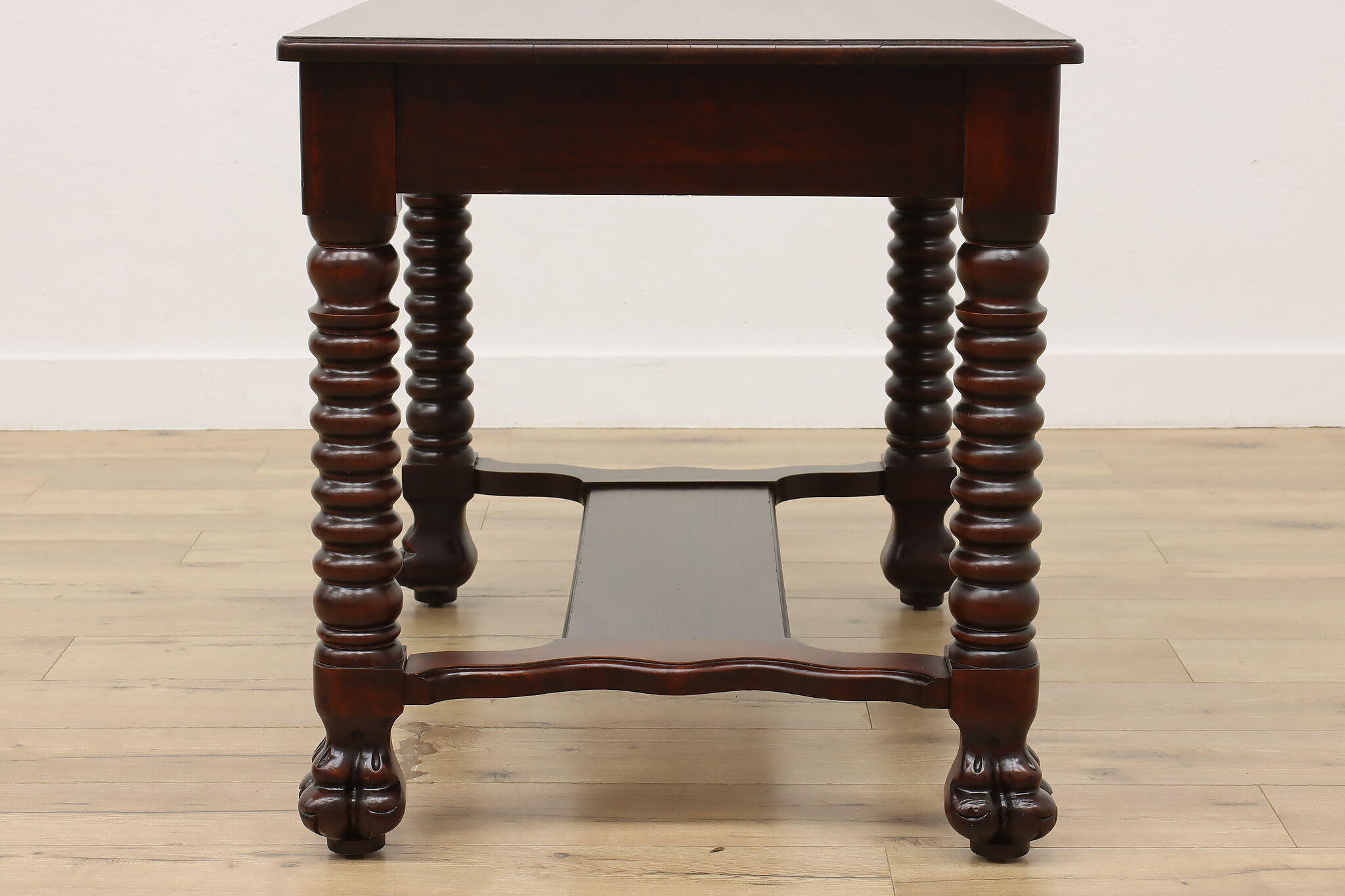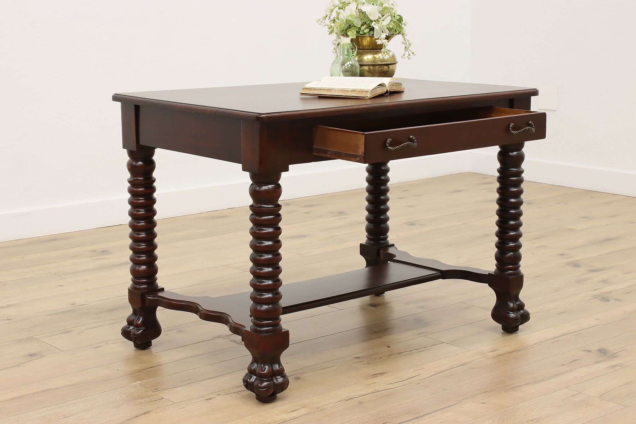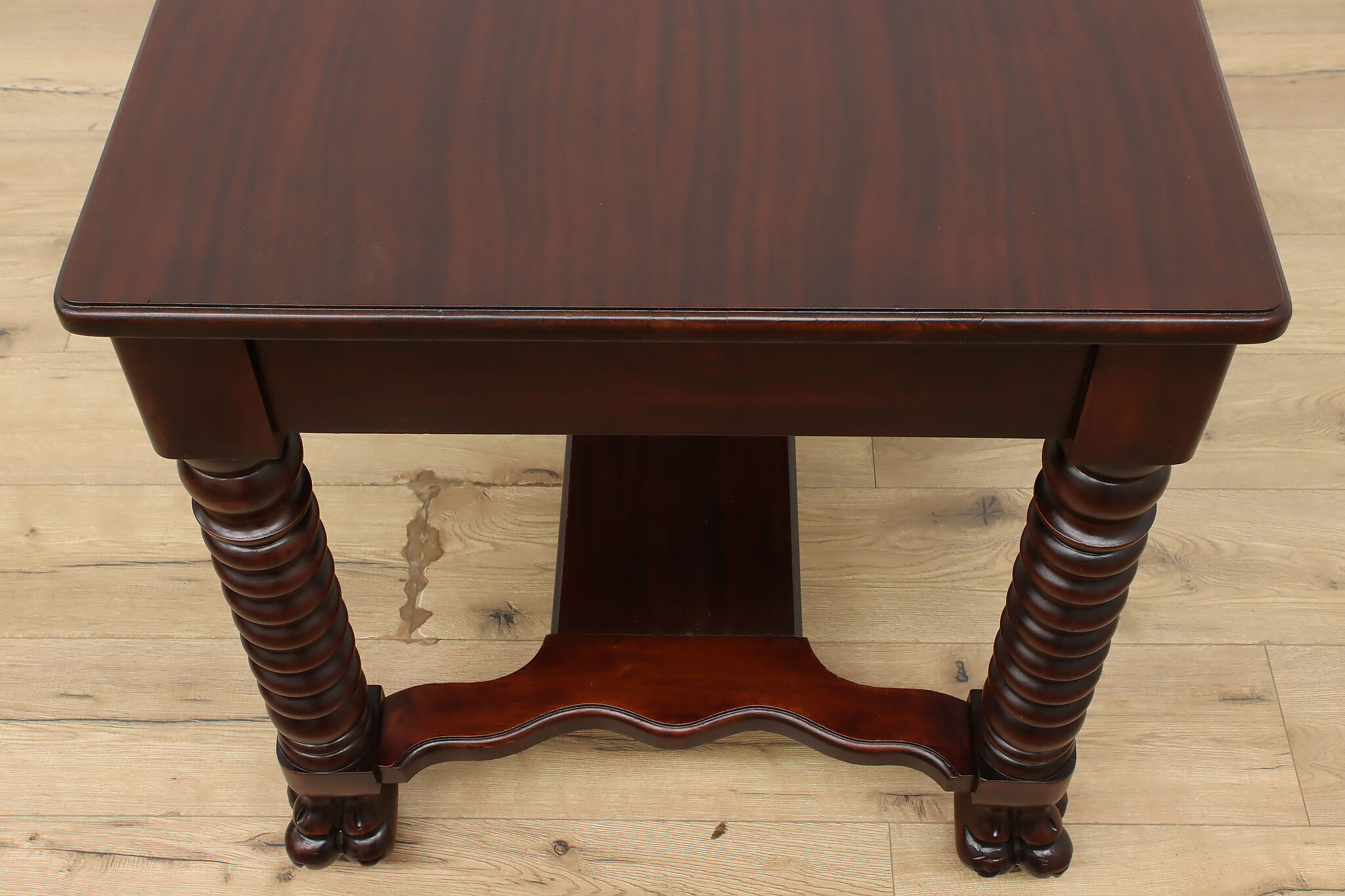Designed after the Empire furniture period, this library desk or table has spiral legs and paw feet for an extra touch of charm.