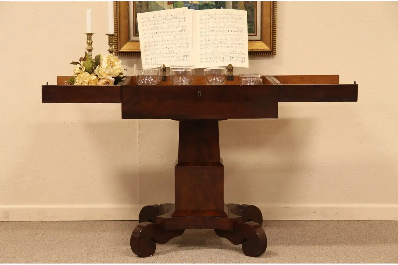 The case is matched flame grain mahogany, there are numerous repairs, restoration, and touchups over the years - see photos. A fold-out stand holds music, and the covers flip shut to make a console table.