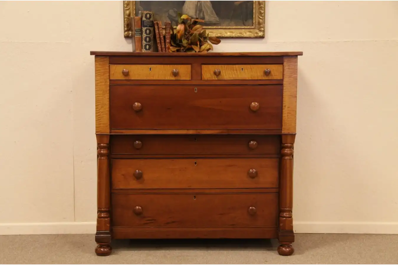 This picturesque antique dates from the American Empire period, and has generous storage space. Measurements are 46" wide, 22" deep and 46" tall.