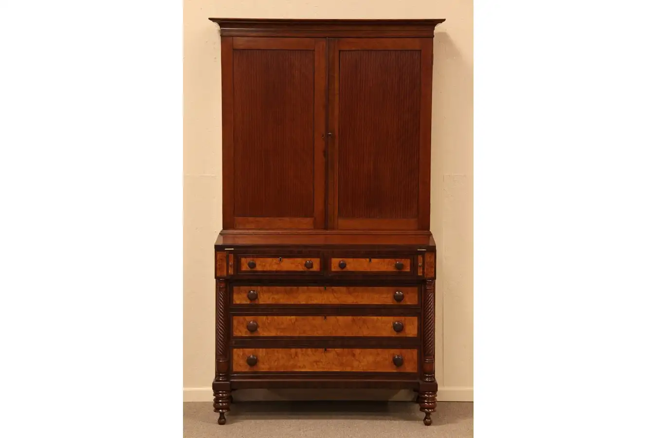 Spiral columns and the graceful crown are well proportioned on this truly radiant American antique furniture. Dimensions are 46" wide, 21" deep, 6' 7" tall, and the desk angles up from 33" high at the front edge when opened.