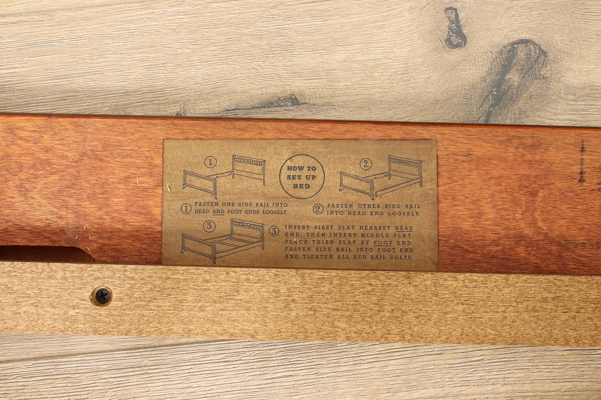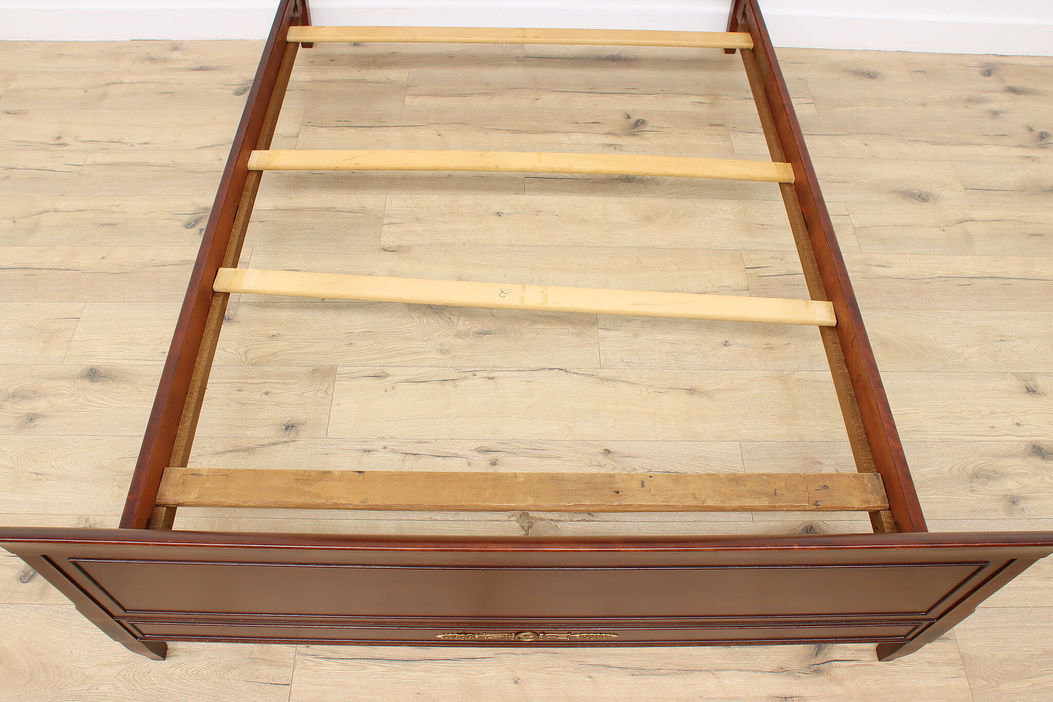 Bed size is 80" long and 57.5" wide. Headboard is 38.5" tall and the footboard is 25" tall. Slats sit 8.5" from ground and the demonstrator mattress is 14" thick. Interior dimensions of the bed frame are 76” long and 52” wide.