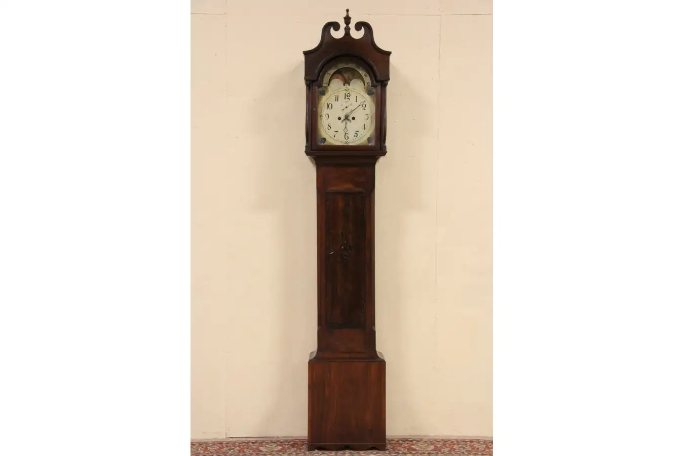 An authentic Georgian period tall case or grandfather clock from about 1810 has a beautiful hand painted dial with a second hand and working calendar. Numerals have been retouched, the marvelous background painting appears original with delicate crazing from age. The moon dial is charming, but doesn't always work.
