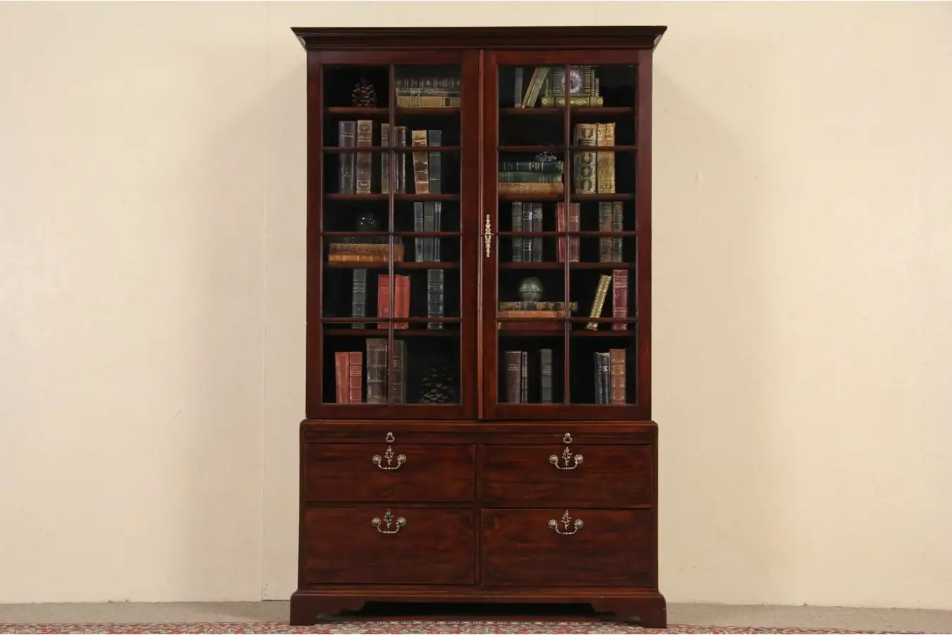 Hand crafted in England about 1870, this mahogany bookcase has old wavy glass panes in the doors. The finish is in excellent condition on figured mahogany with pine sides.