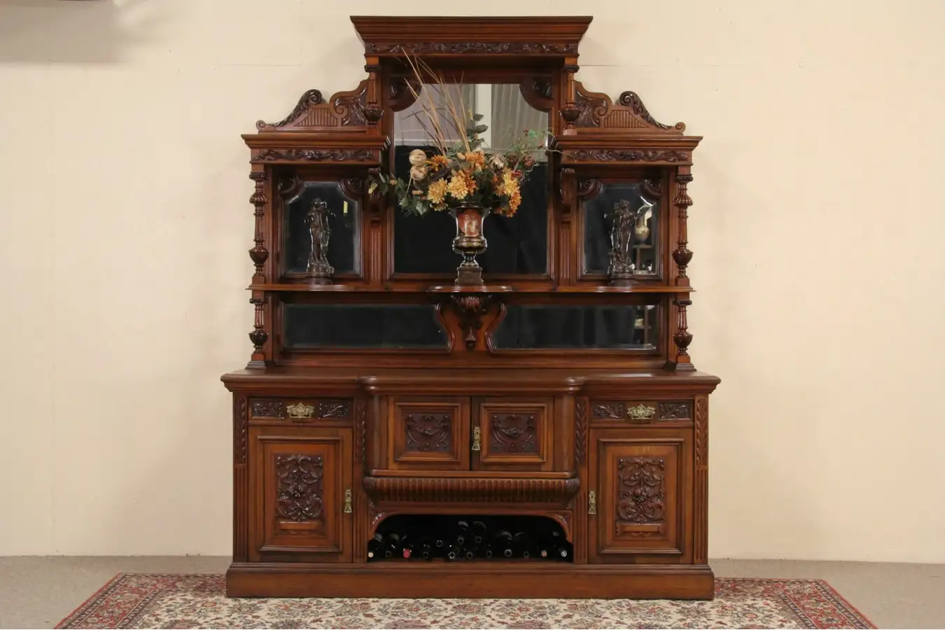 A monumental sideboard or back bar was hand carved of solid mahogany in England about 1890. Three dimensional panels show masterful artistry. Four mirrors are shaped and beveled. The top surface has been revarnished for durability, the rest of the finish is original and extremely well preserved with warm patina.