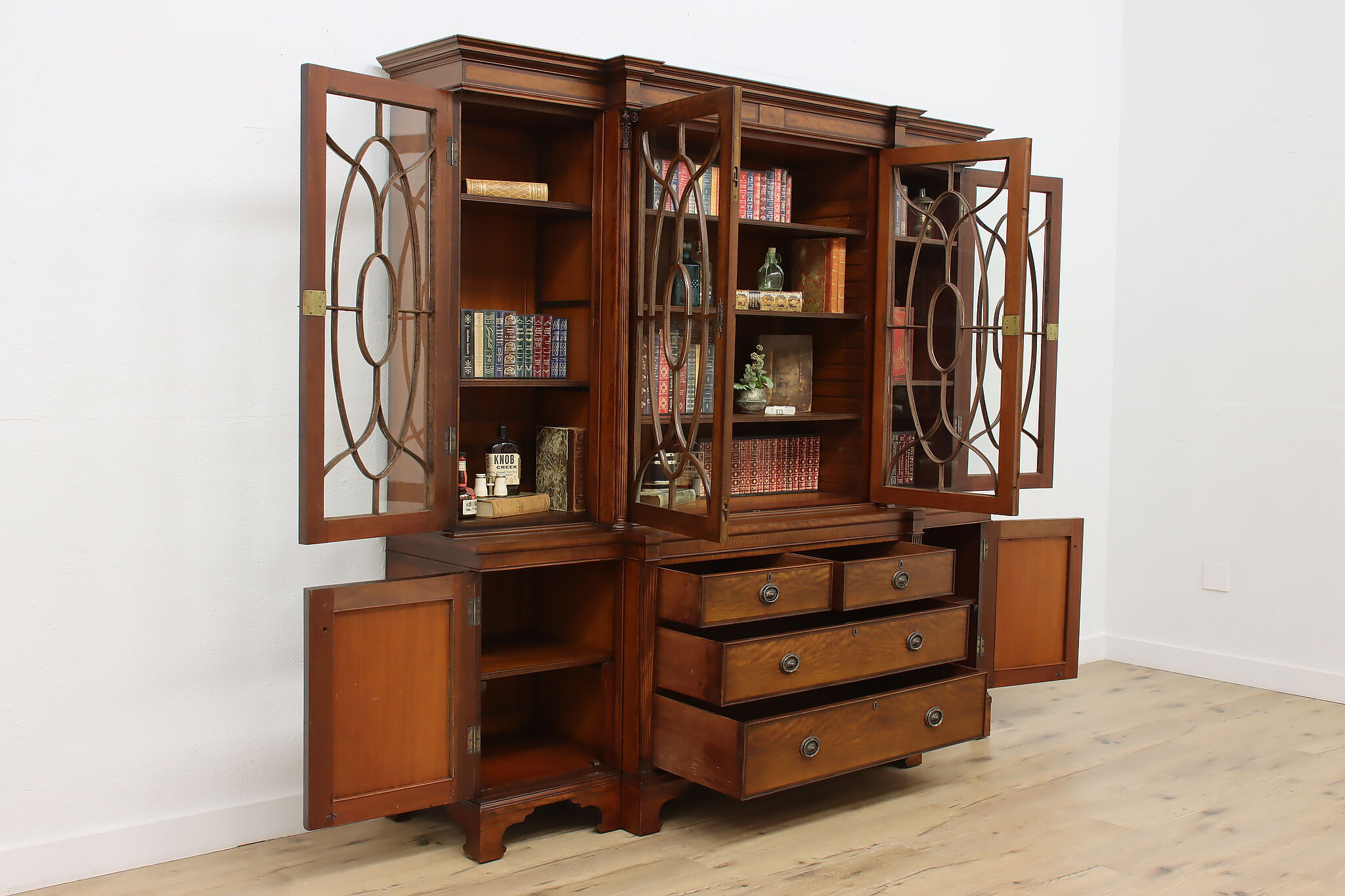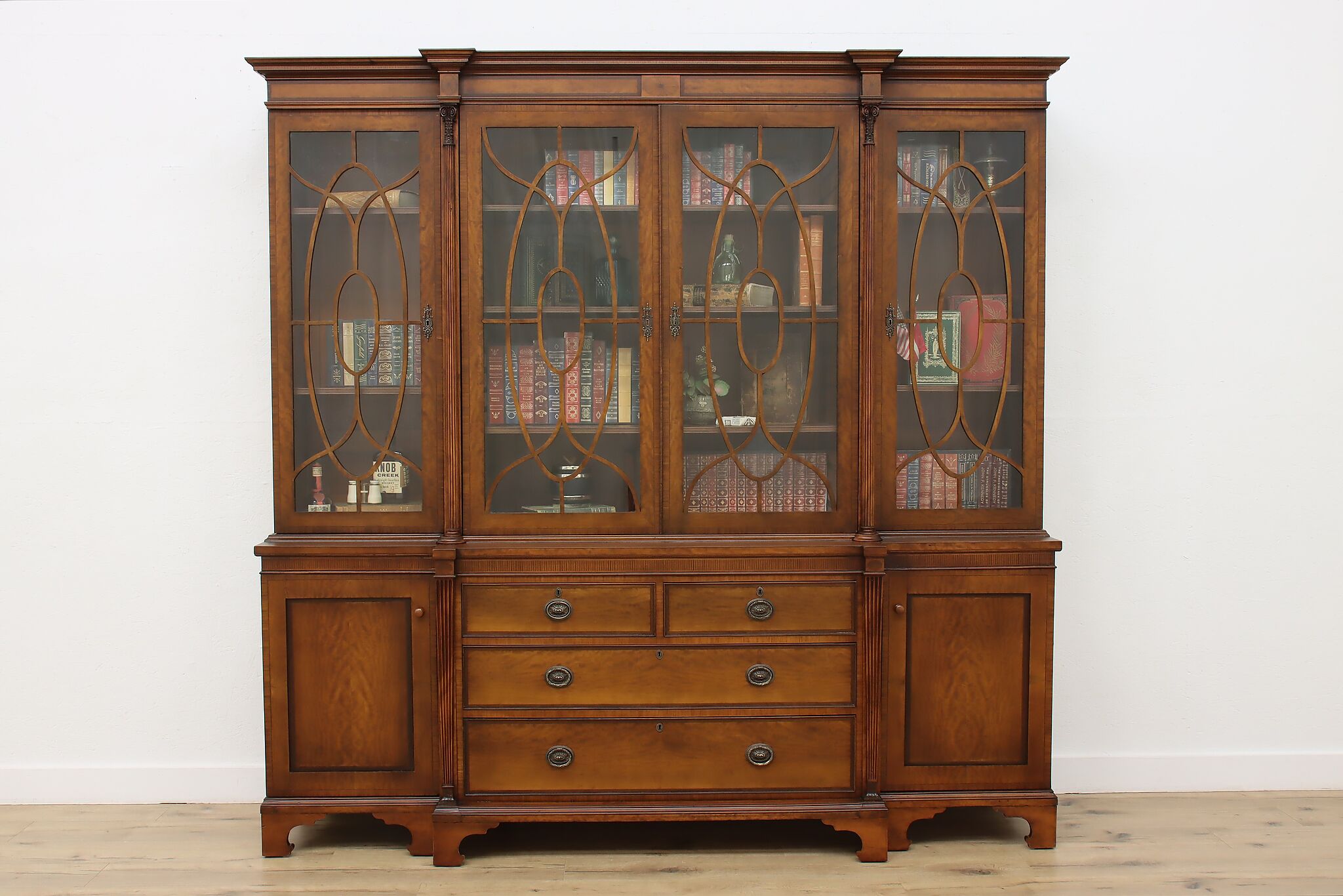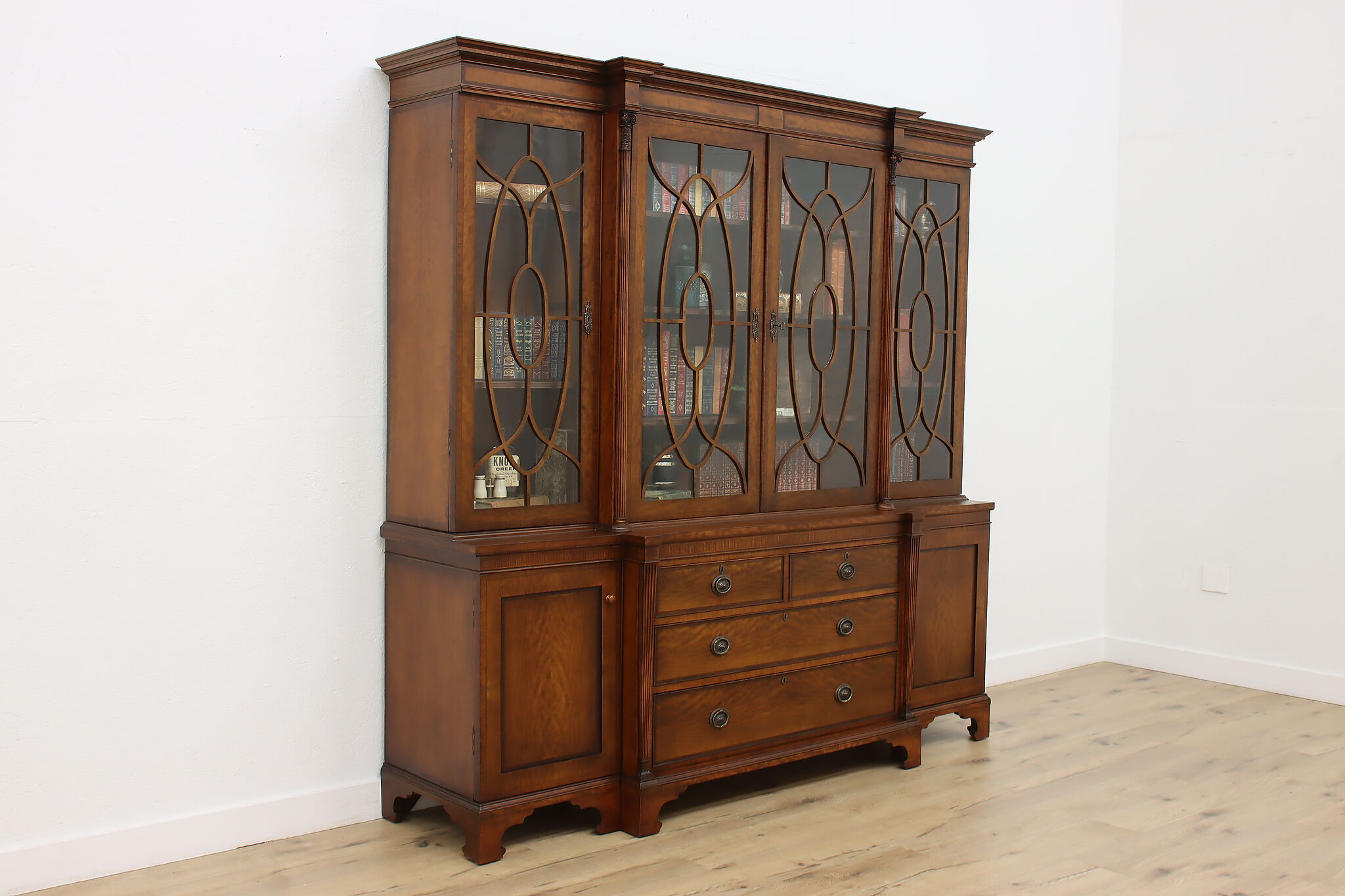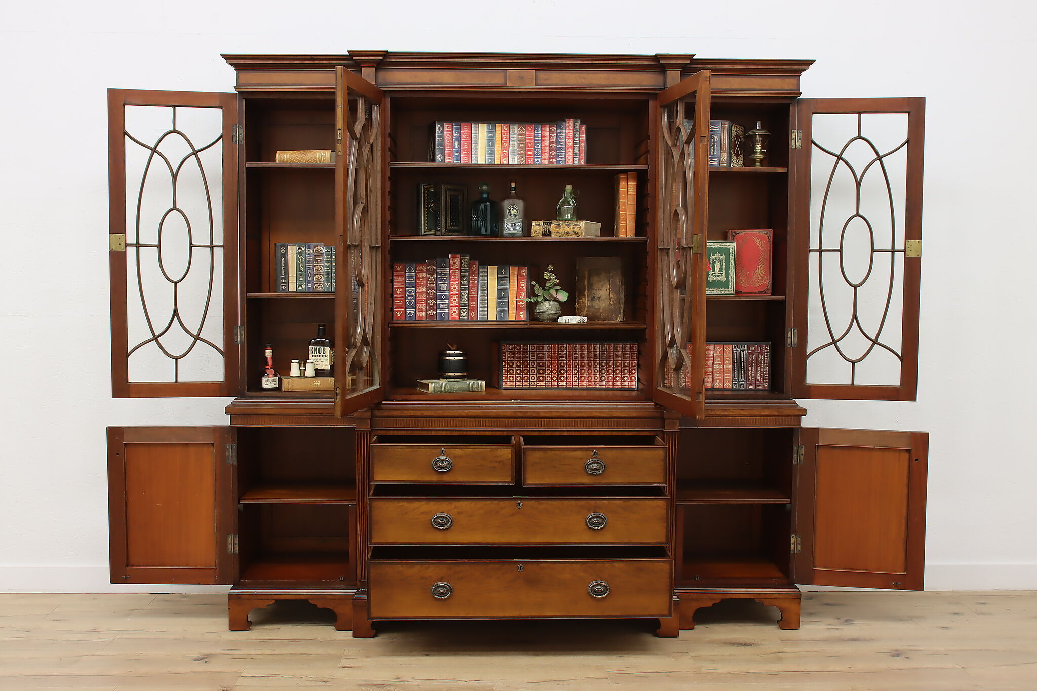Handcrafted in England, this gorgeous classical design breakfront should be filled with favorite novels and family heirloom china!