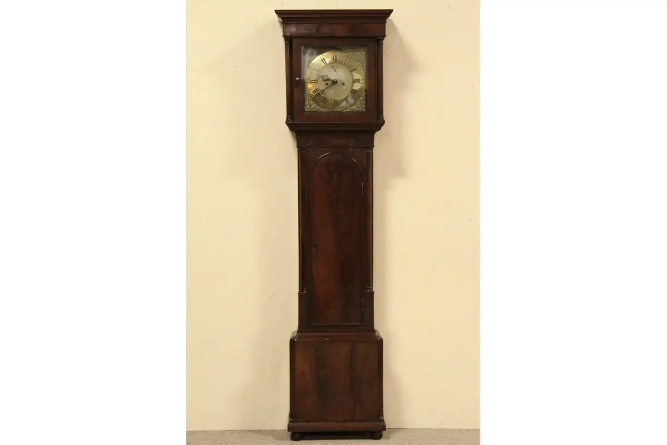The mahogany case has an excellent rich, deep satiny finish with warm antique patina and a few small mars at the edges. There are shrinkage separations and warps from age, see photos. This is fairly characteristic of 200 year old English furniture. The vibrant figured flame grain mahogany is beautiful. There are filigree ornaments in the corners of the engraved brass dial.