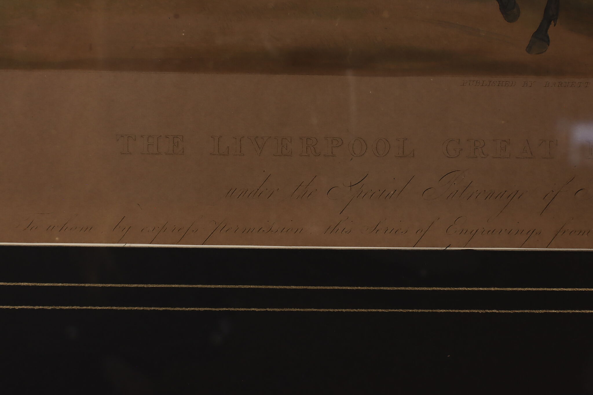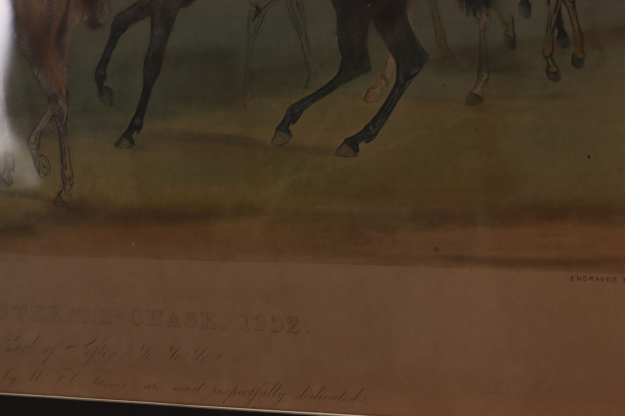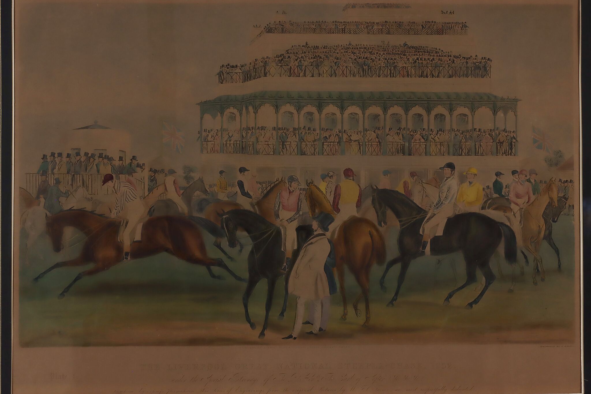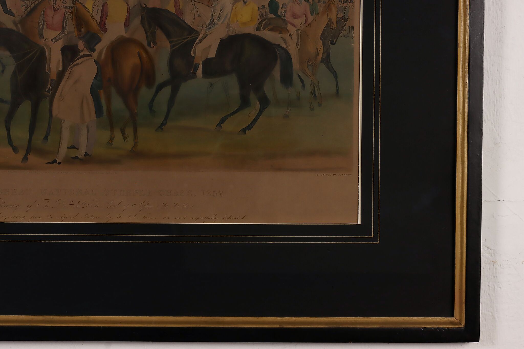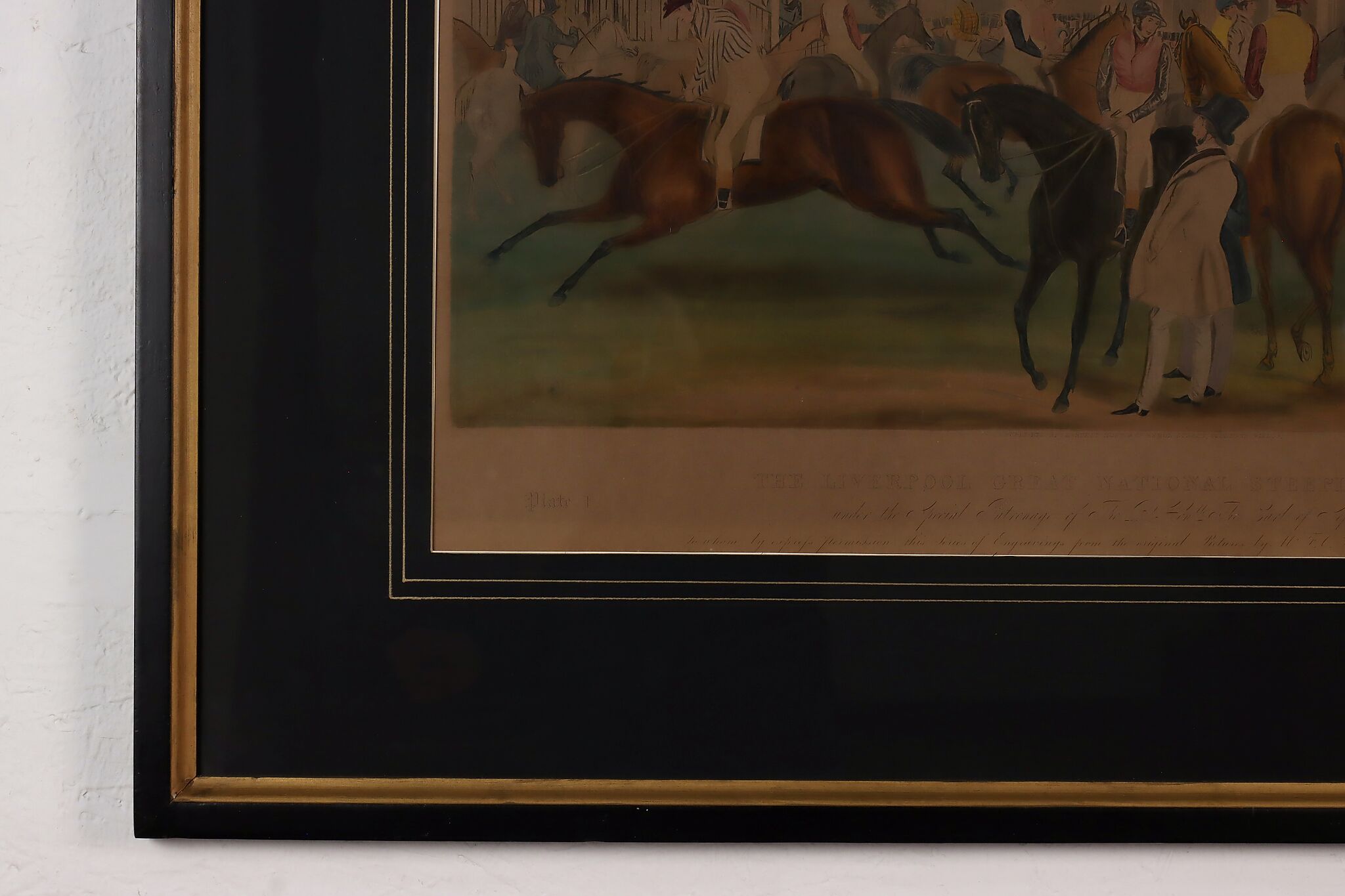 This engraving is Plate One of Francis Calcraft Turner's original "The Liverpool Great National Steeple Chase" series of four paintings. Turner was known for his realistic animal and sport paintings.