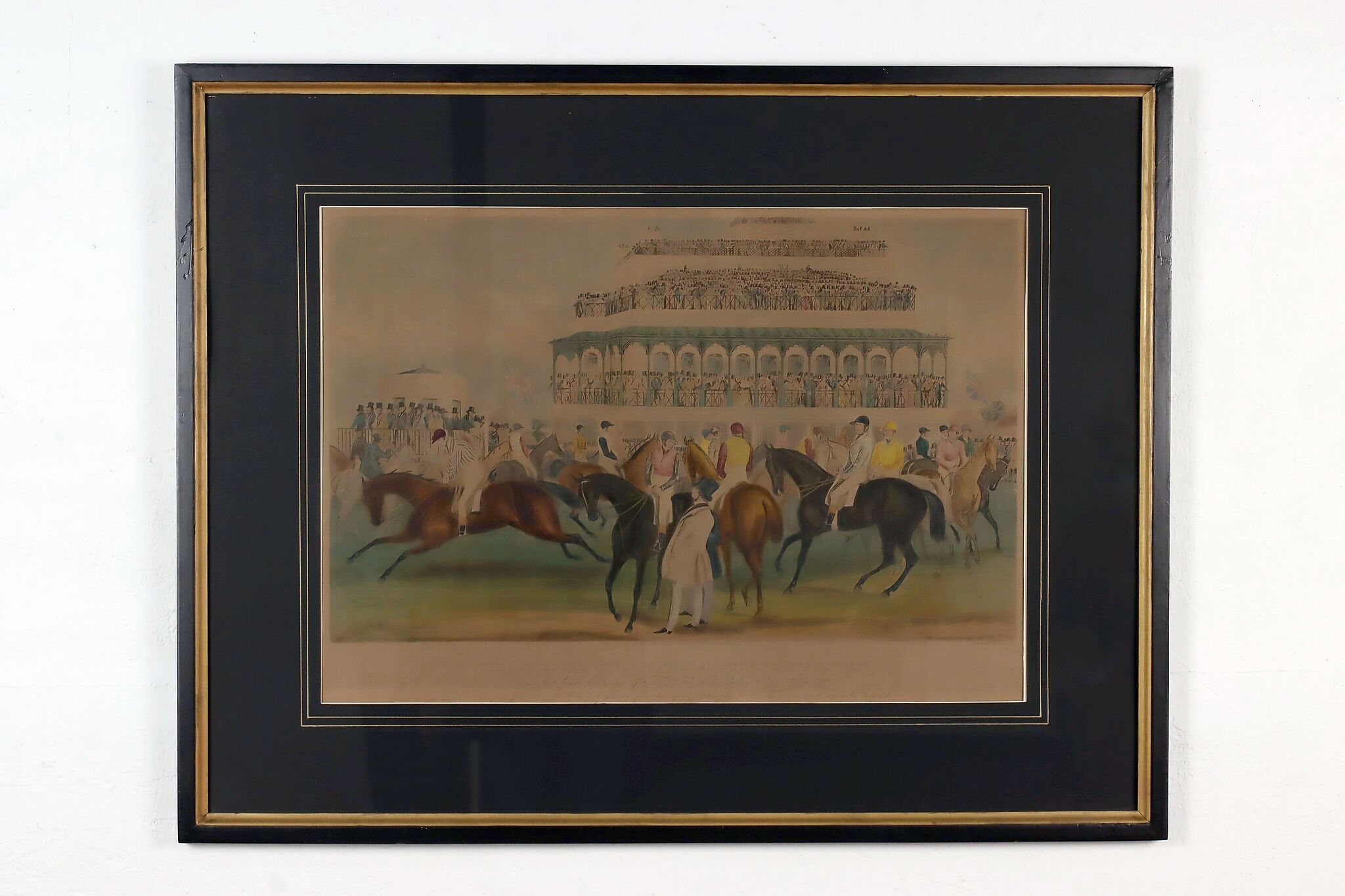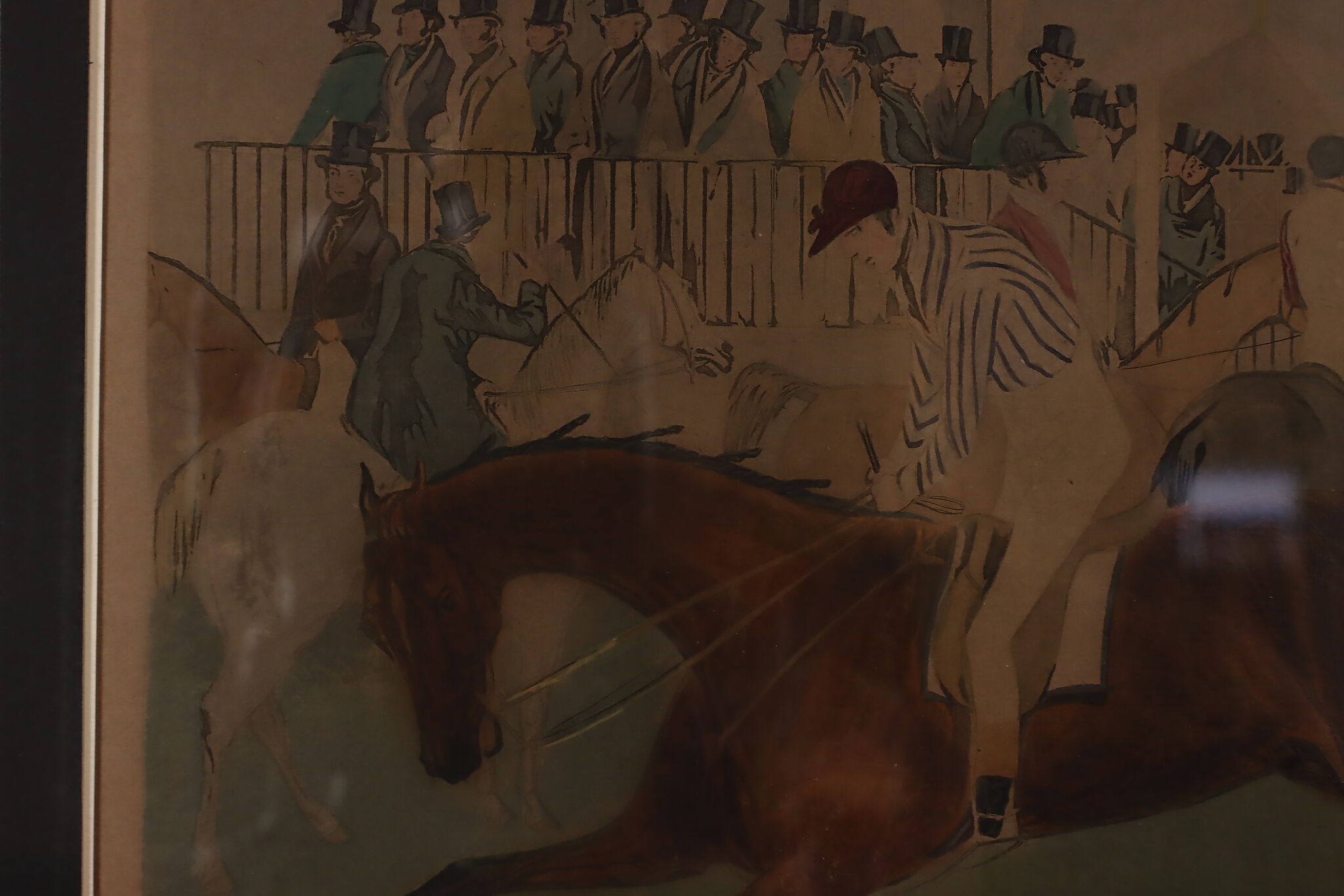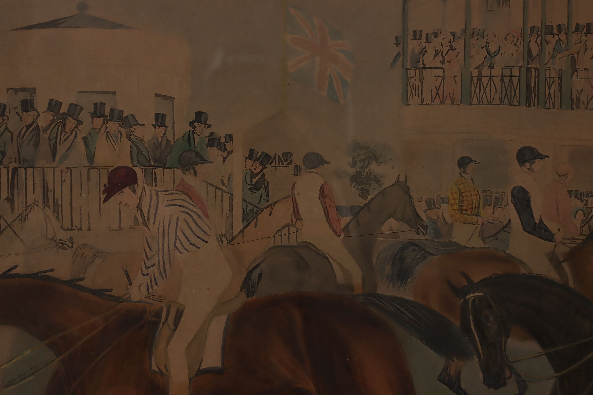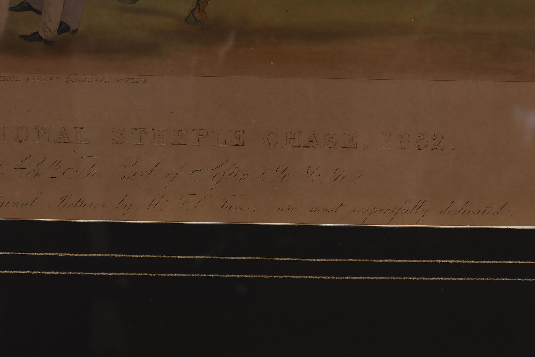 This engraving is Plate One of Francis Calcraft Turner's original "The Liverpool Great National Steeple Chase" series of four paintings. Turner was known for his realistic animal and sport paintings.