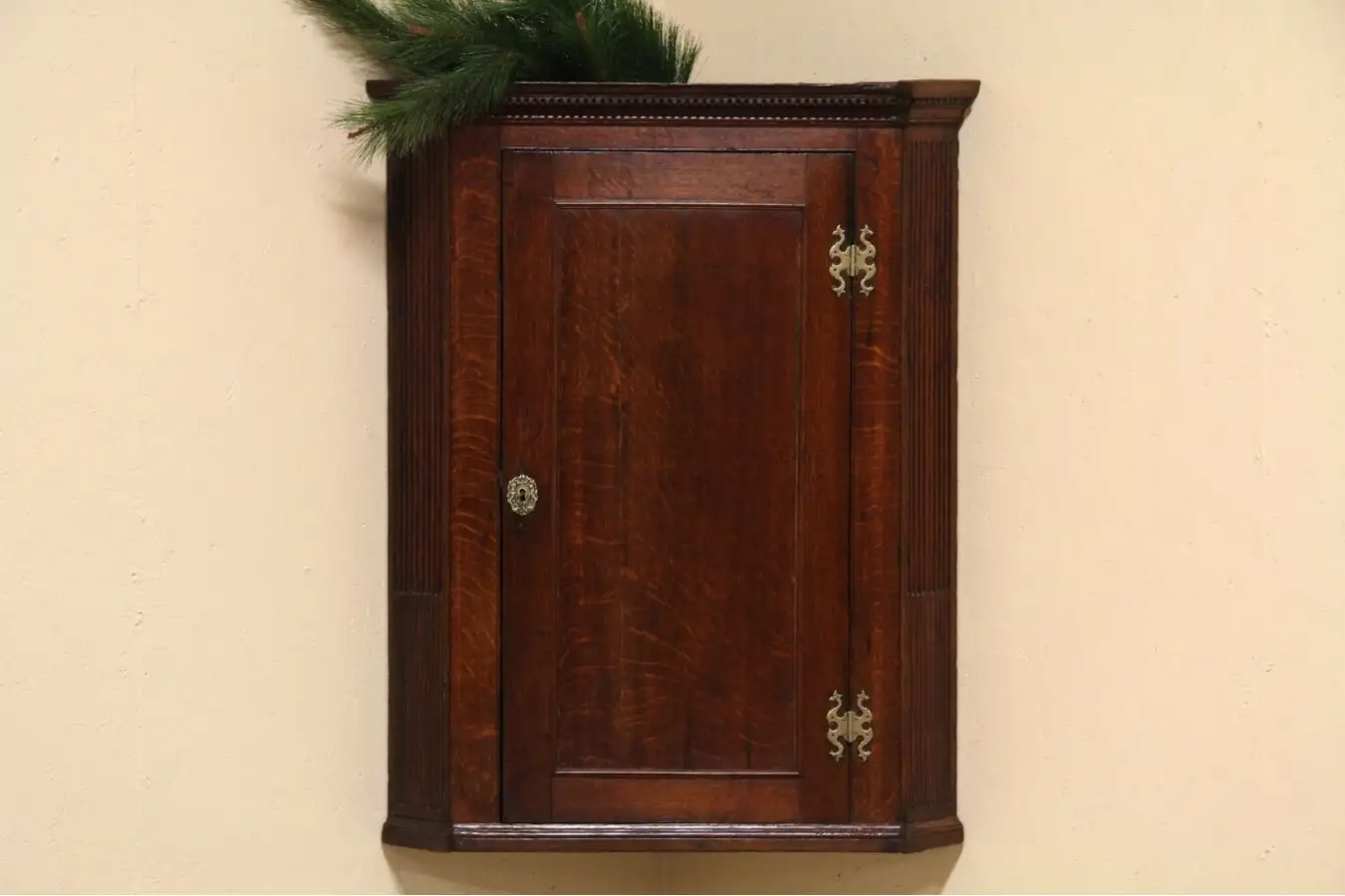 A charming 1860's hanging or standing corner cupboard was hand crafted of solid fine grained quarter sawn oak. Hand carved, the top crown has dentil molding and sides are fluted. Chamfered panels and square nails testify to the age of this beautiful historic piece.