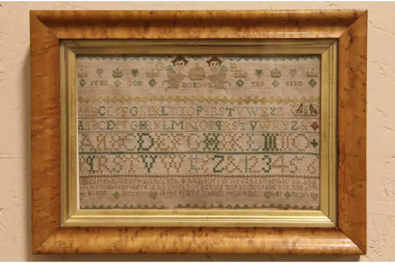 Hand stitched about 1825, an exquisite small sampler is signed "Susan Ameson, her work," and bears a Biblical quote from Ecclesiastes 9:10 plus the motto, "Fear God, Honour the King." Late Georgian period folk art, this exquisite embroidery on a linen panel predates the ascension of Queen Victoria in 1837.