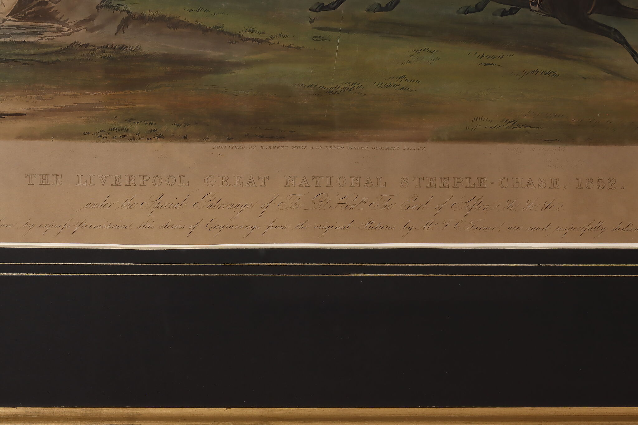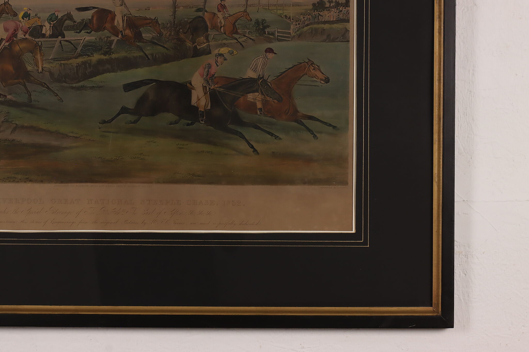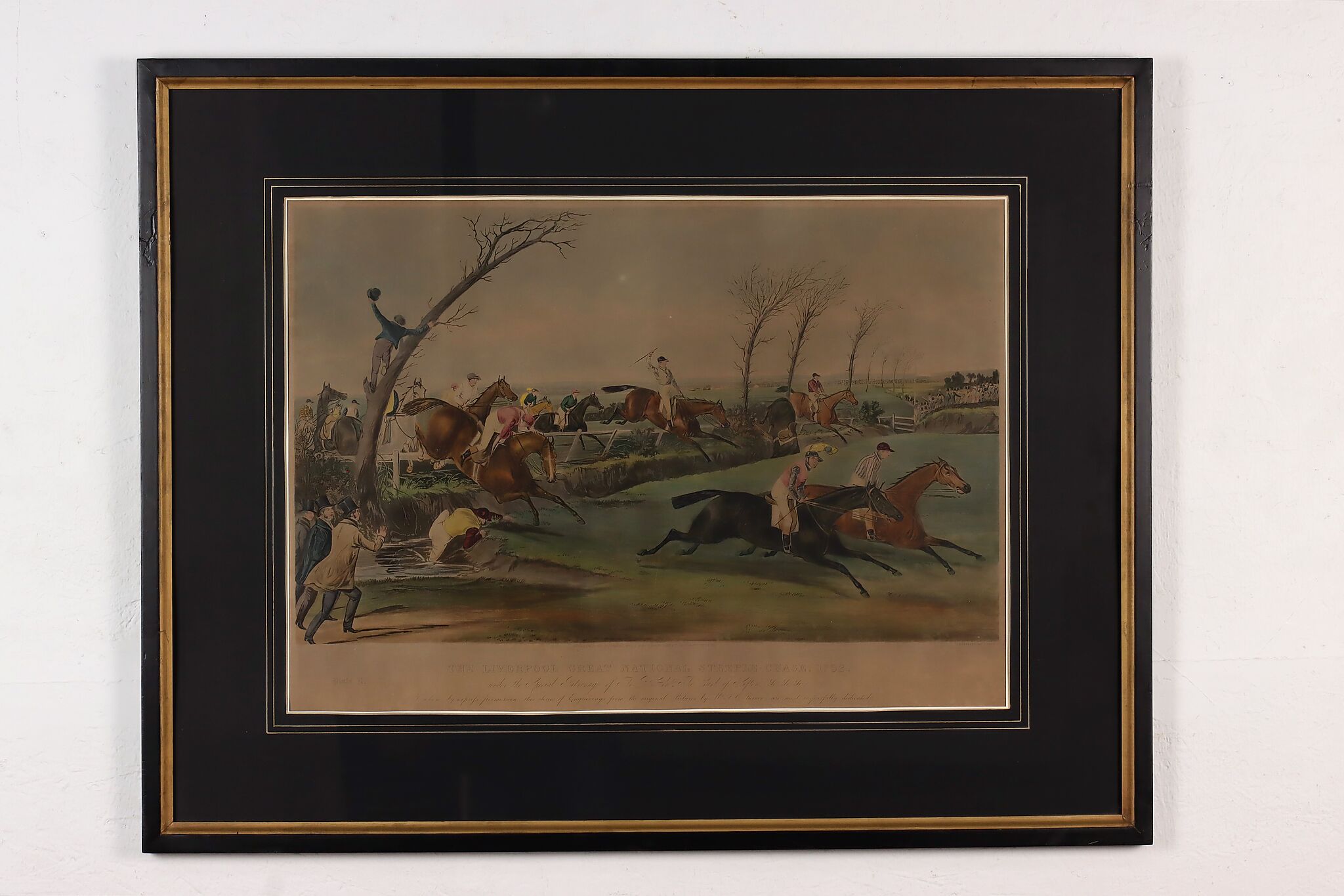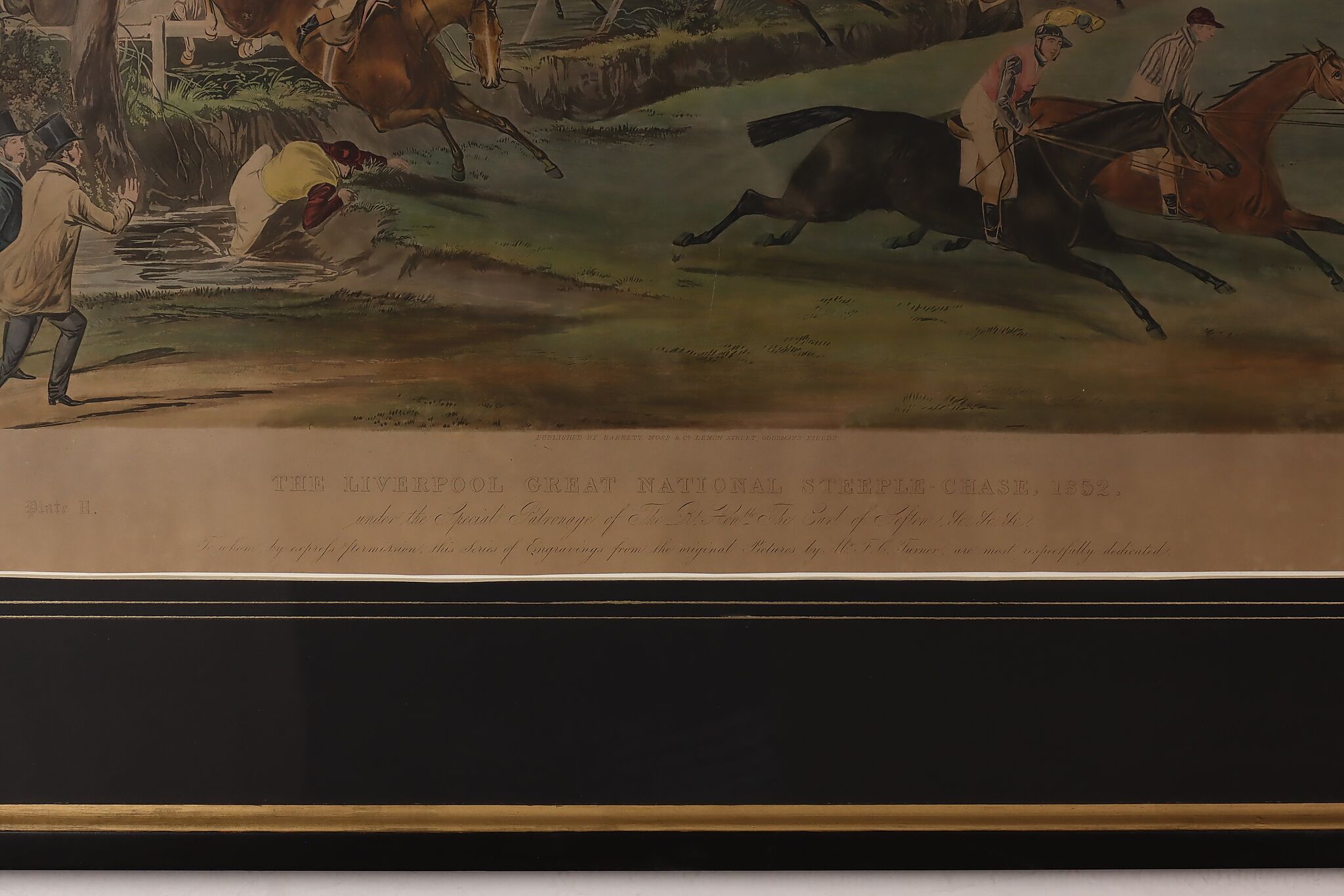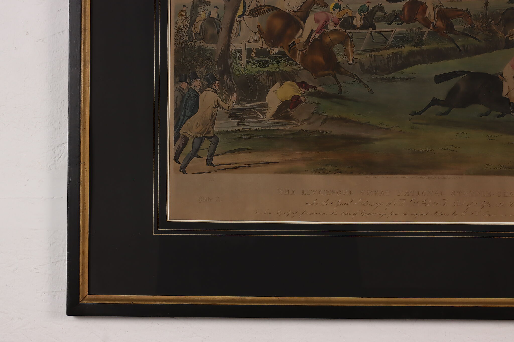 This engraving is plate two of Francis Calcraft Turner's original "The Liverpool Great National Steeple Chase" series of four paintings. Turner was known for his realistic animal and sport paintings.