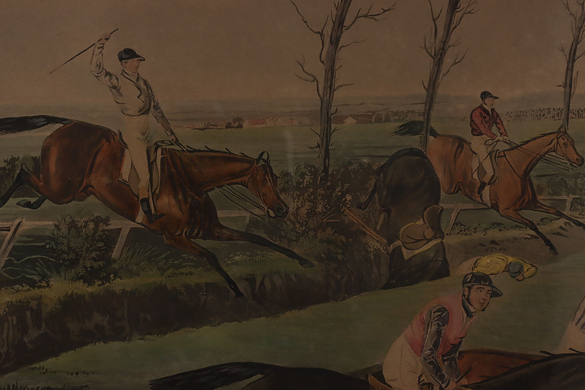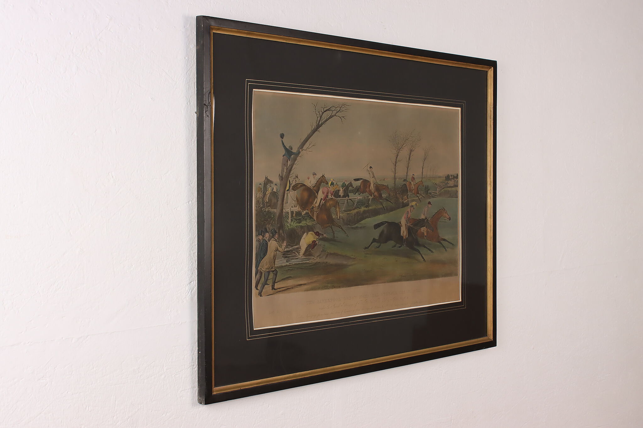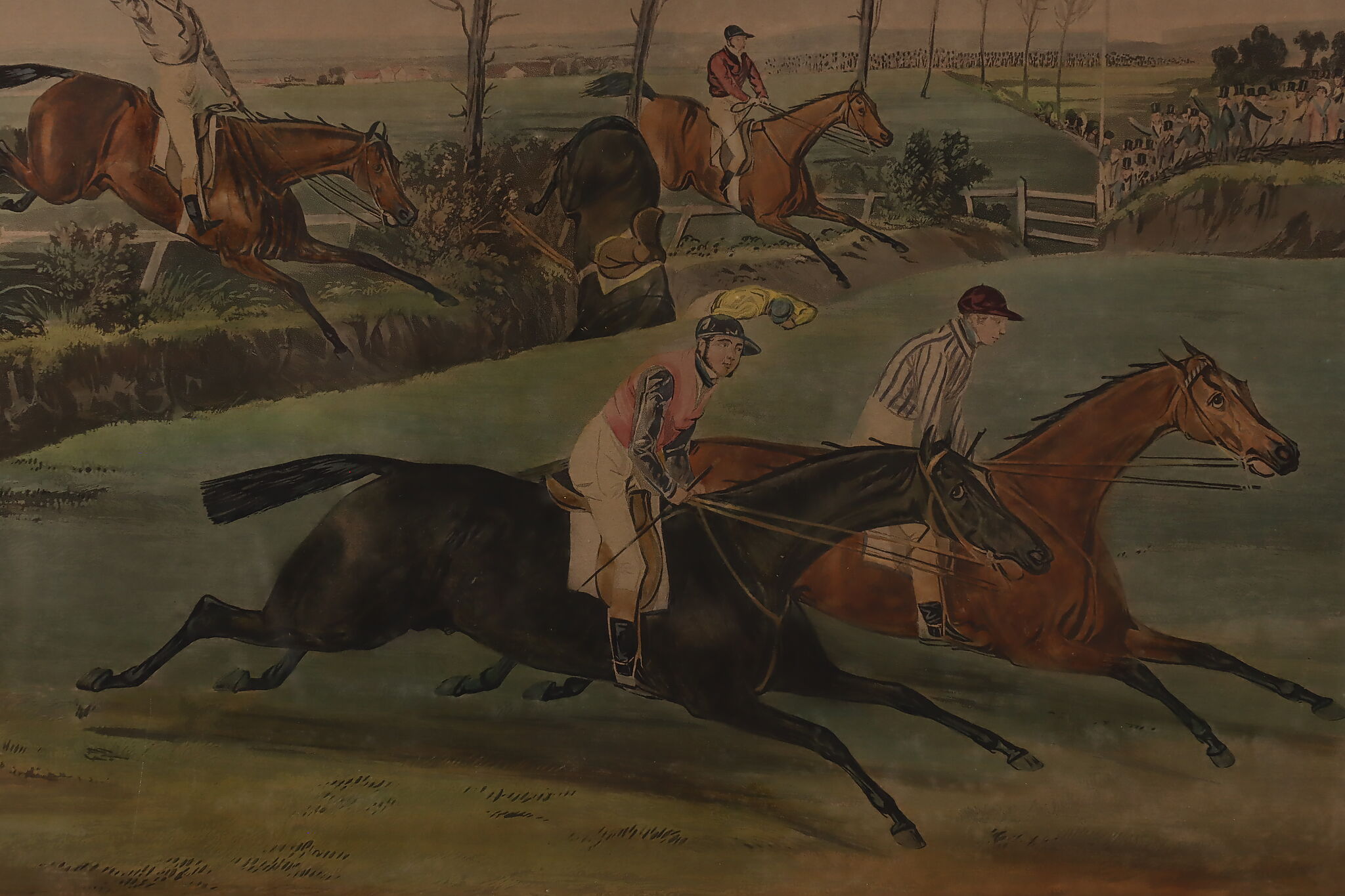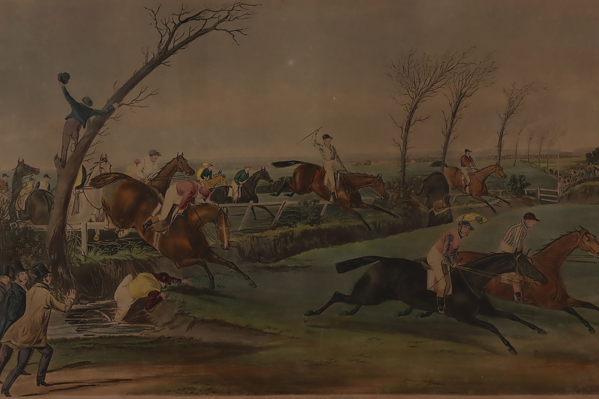 This engraving is plate two of Francis Calcraft Turner's original "The Liverpool Great National Steeple Chase" series of four paintings. Turner was known for his realistic animal and sport paintings.