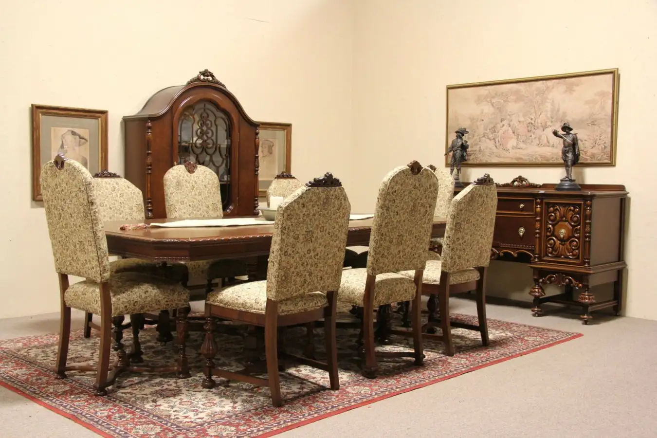 An assembled set or group of English Tudor design walnut dining furniture from about 1925 includes a table with three leaves, sideboard or server, china or display cabinet plus two sets of four matched chairs.