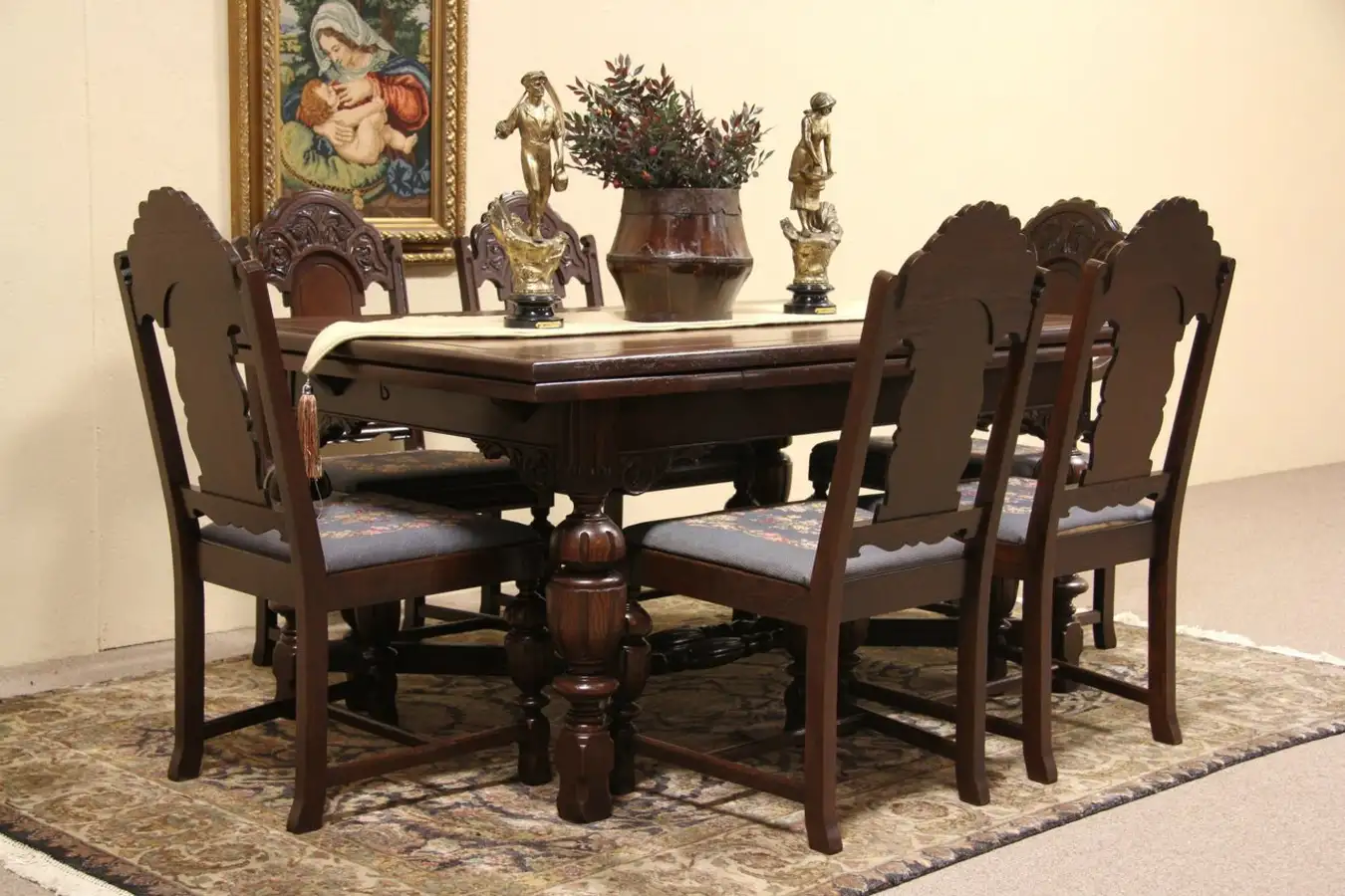Carved of solid oak in the English Tudor manner about 1925, this wonderful country house dining set includes a table with draw leaves and six chairs.