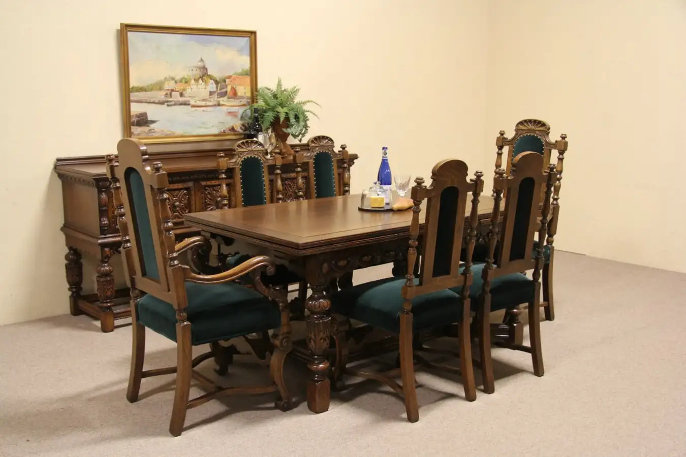 Richly carved in the English Tudor manner about 1925, this dining set includes a table with 2 pull out leaves, sideboard and six chairs.