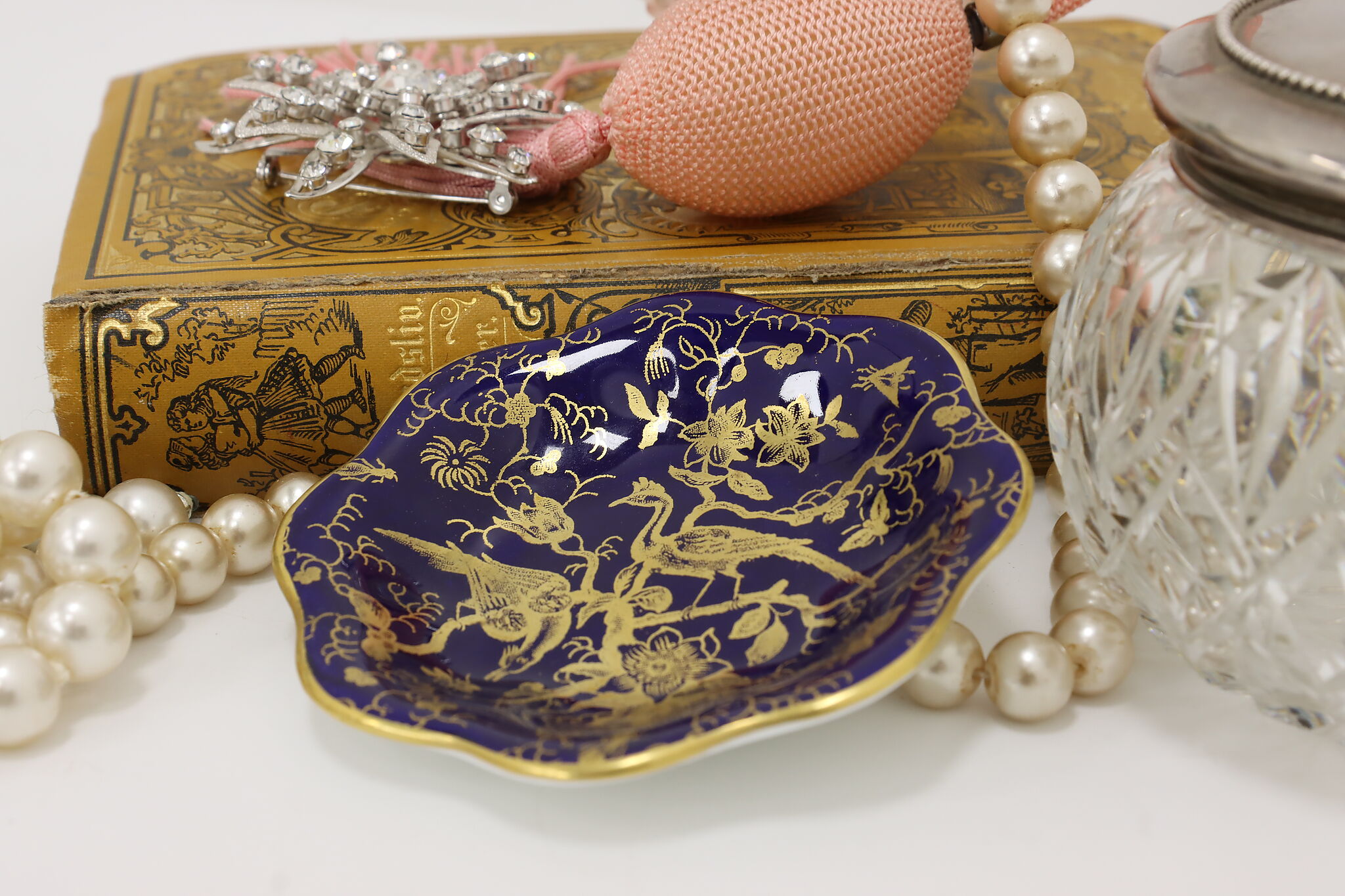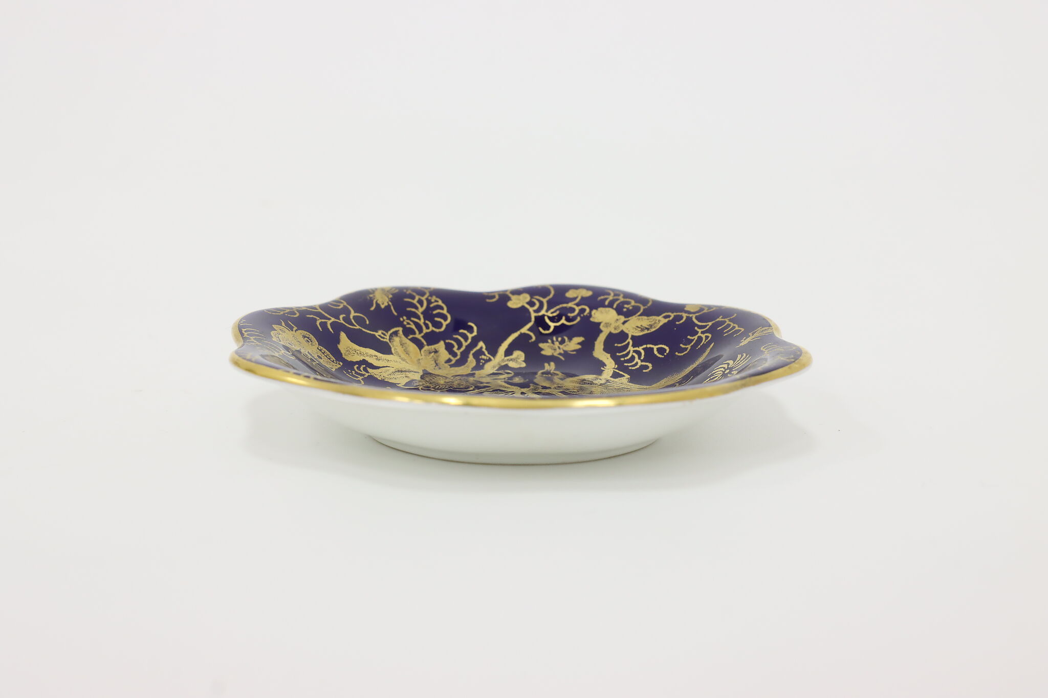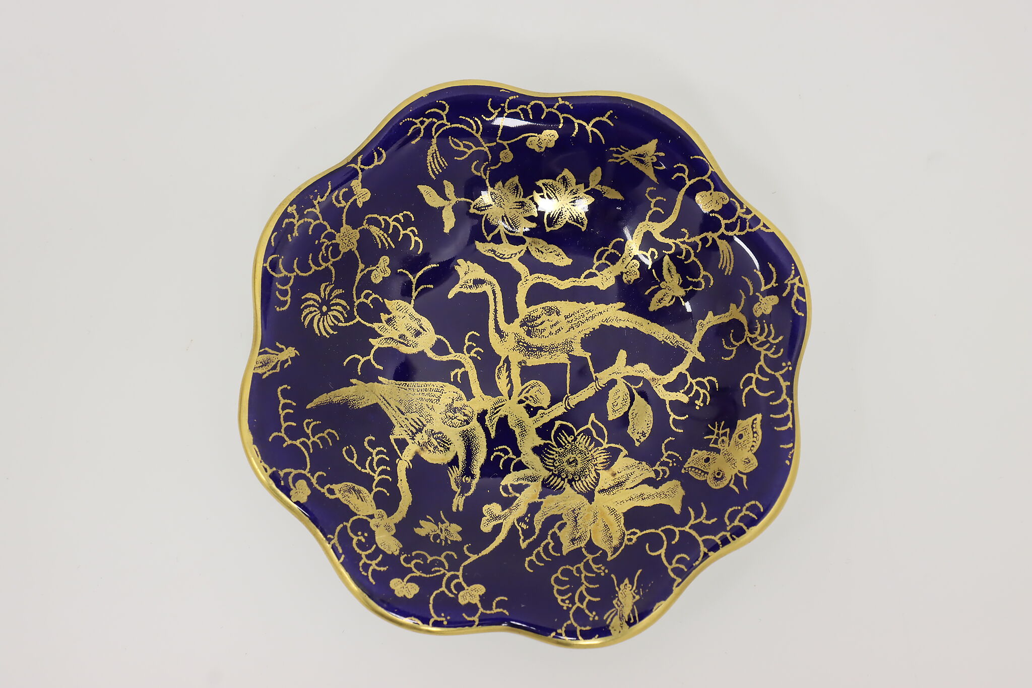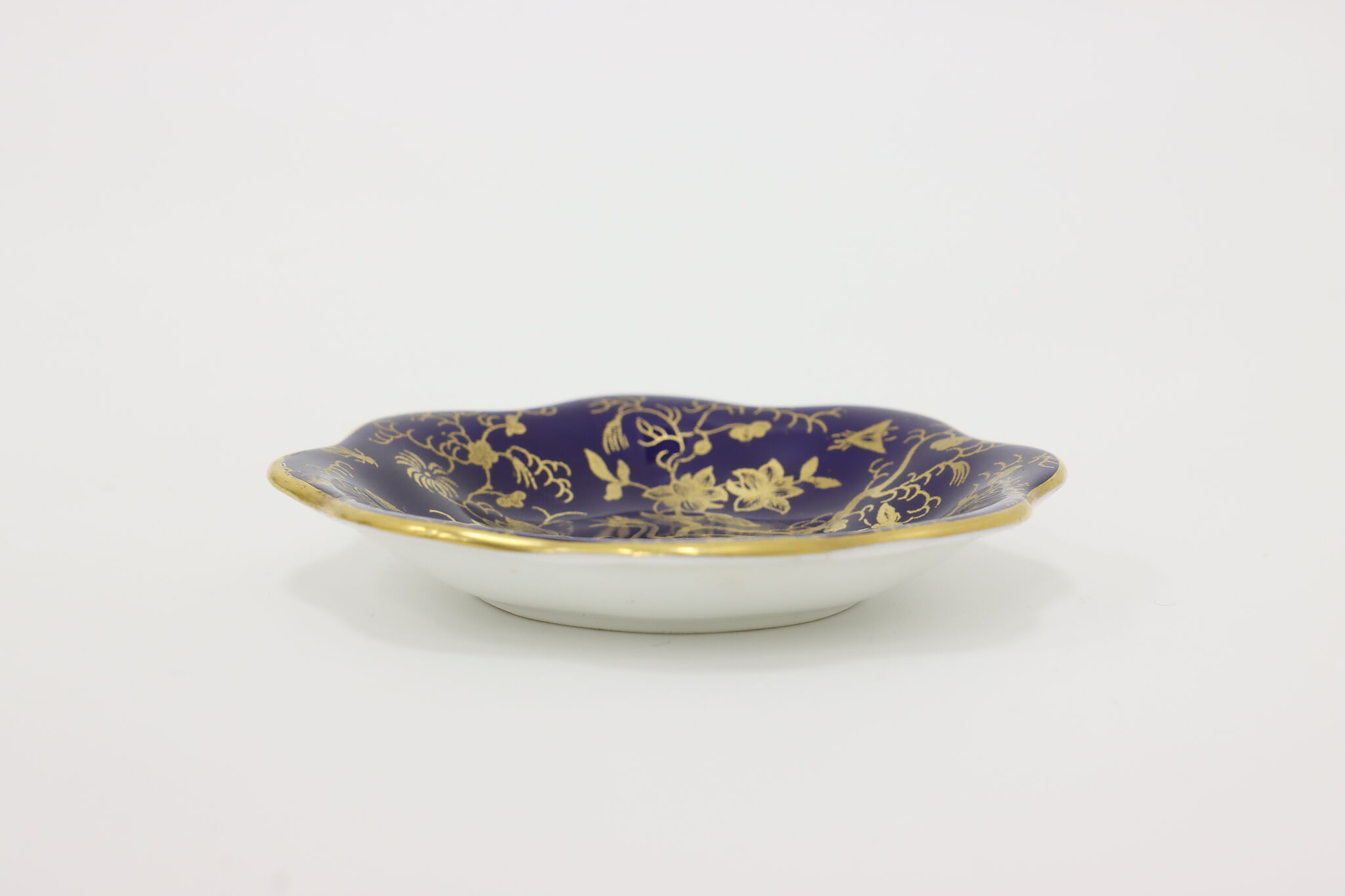 A darling English trinket or ring dish has peacock, butterflies, and floral motifs.