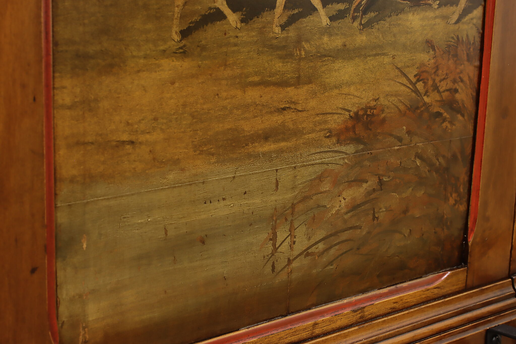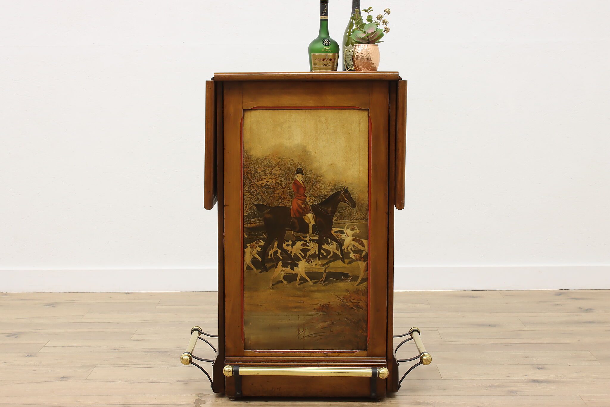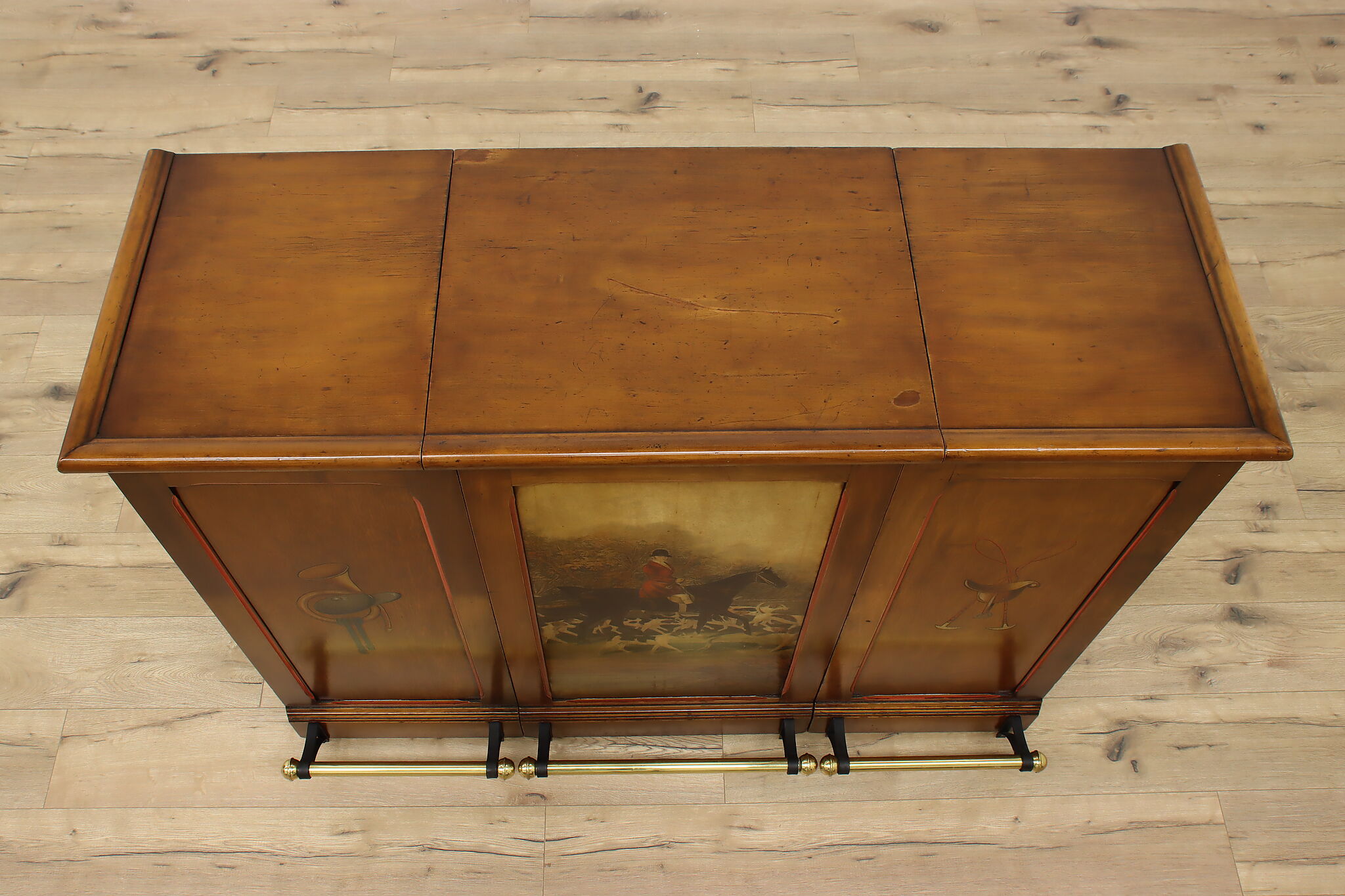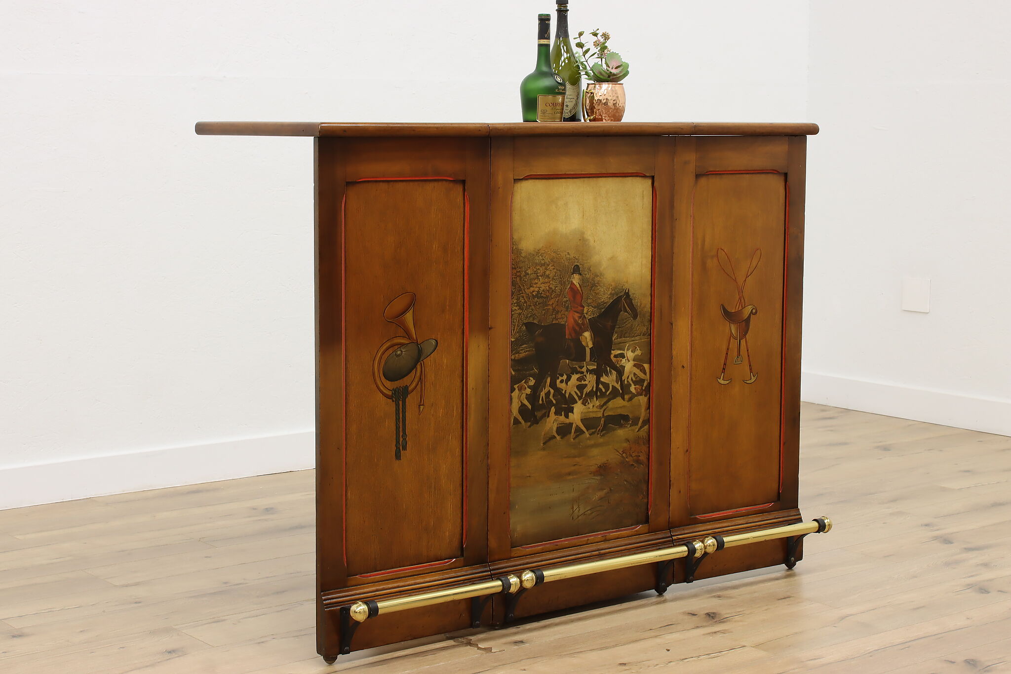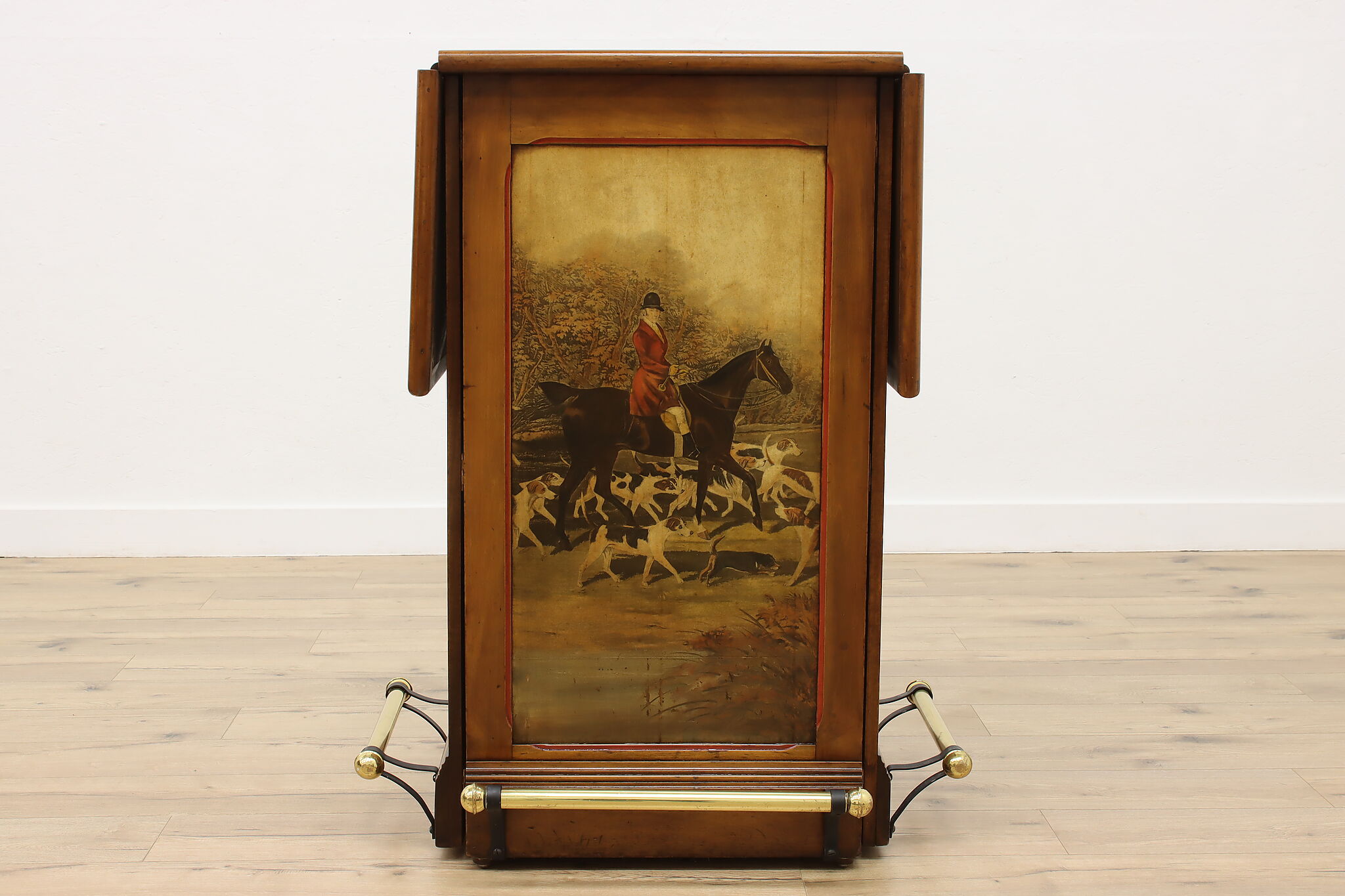 This unique folding bar cabinet has drop leaves supported by swing out doors to extend your serving area! It has also been beautifully decorated with a scene of a traditional English fox hunt.