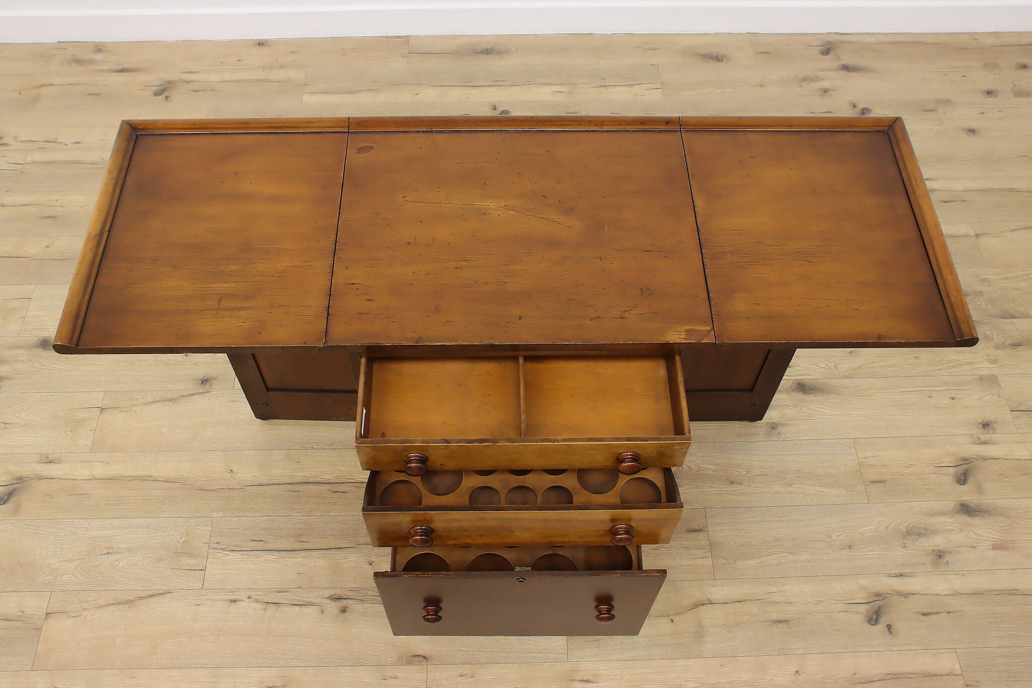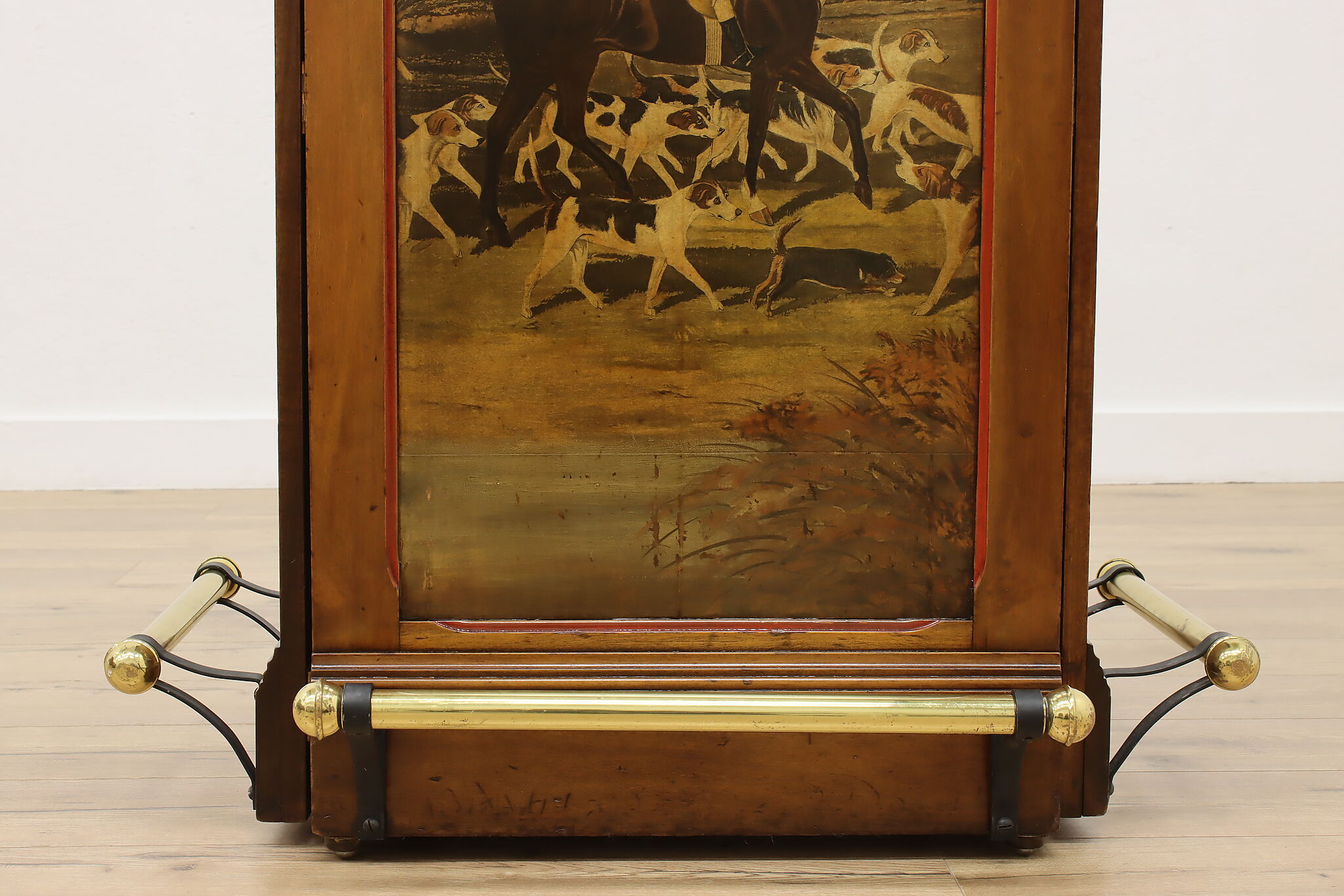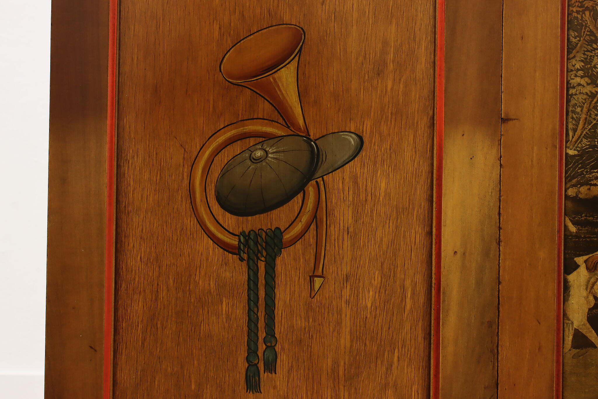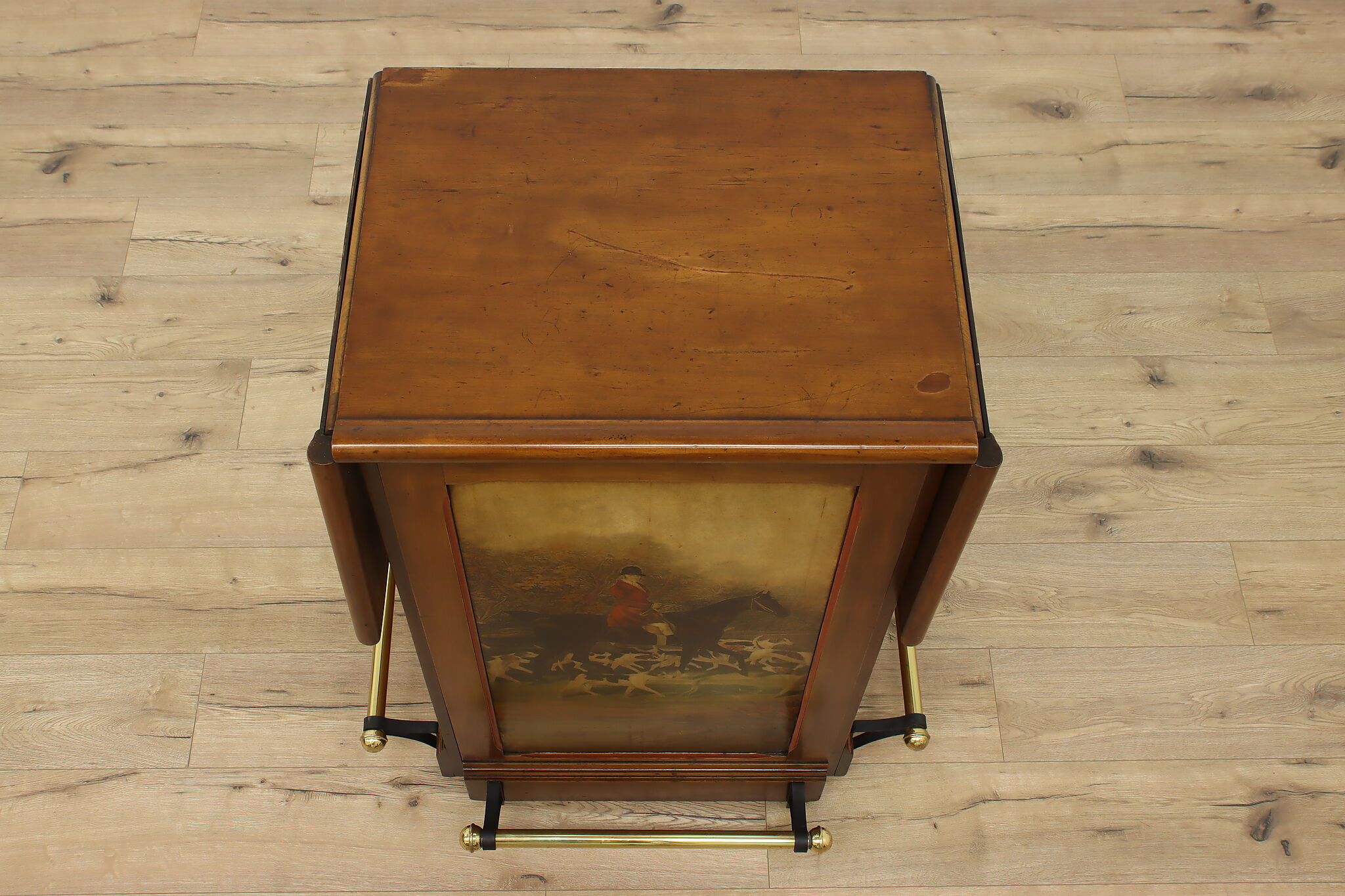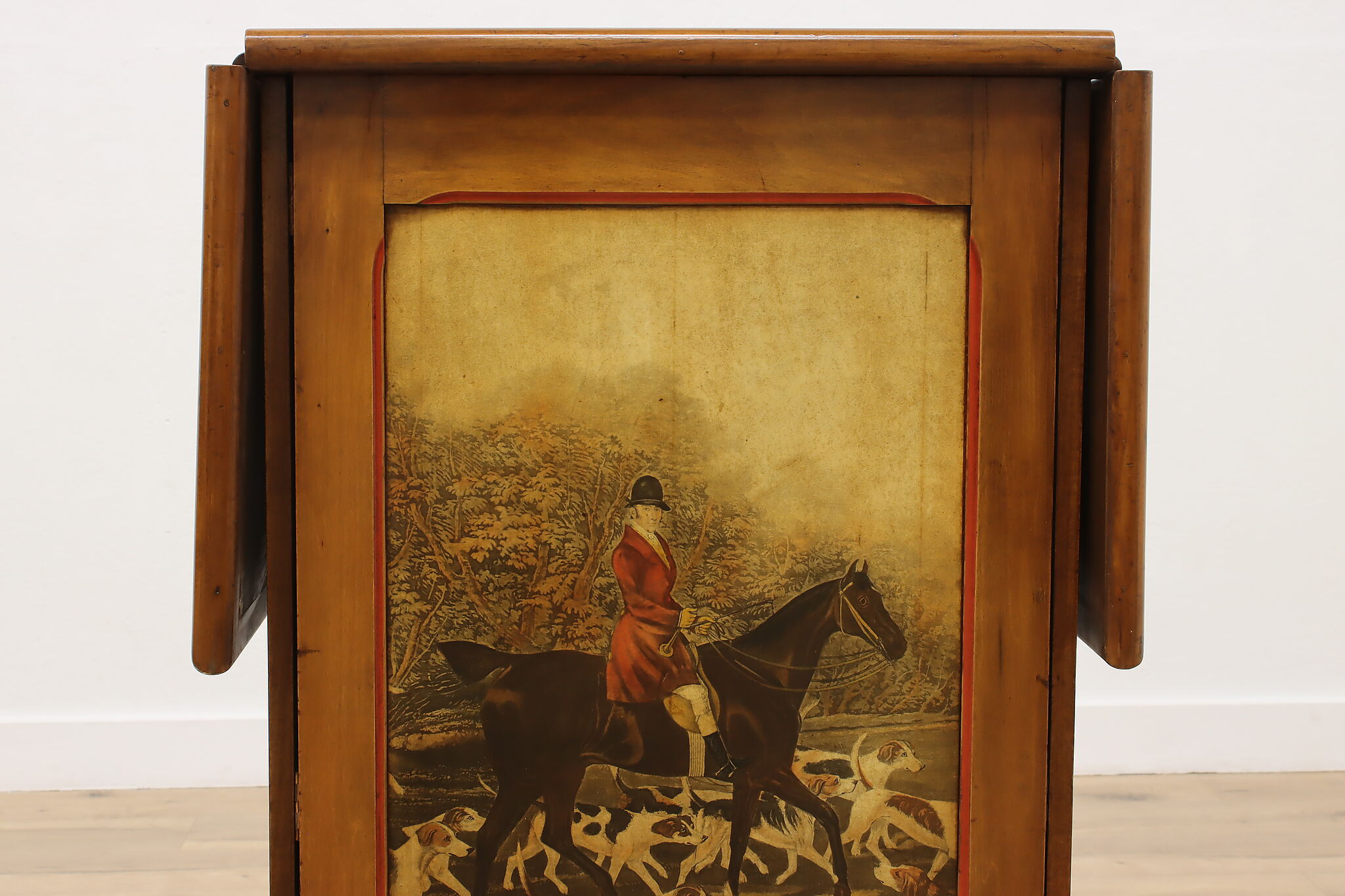 This unique folding bar cabinet has drop leaves supported by swing out doors to extend your serving area! It has also been beautifully decorated with a scene of a traditional English fox hunt.