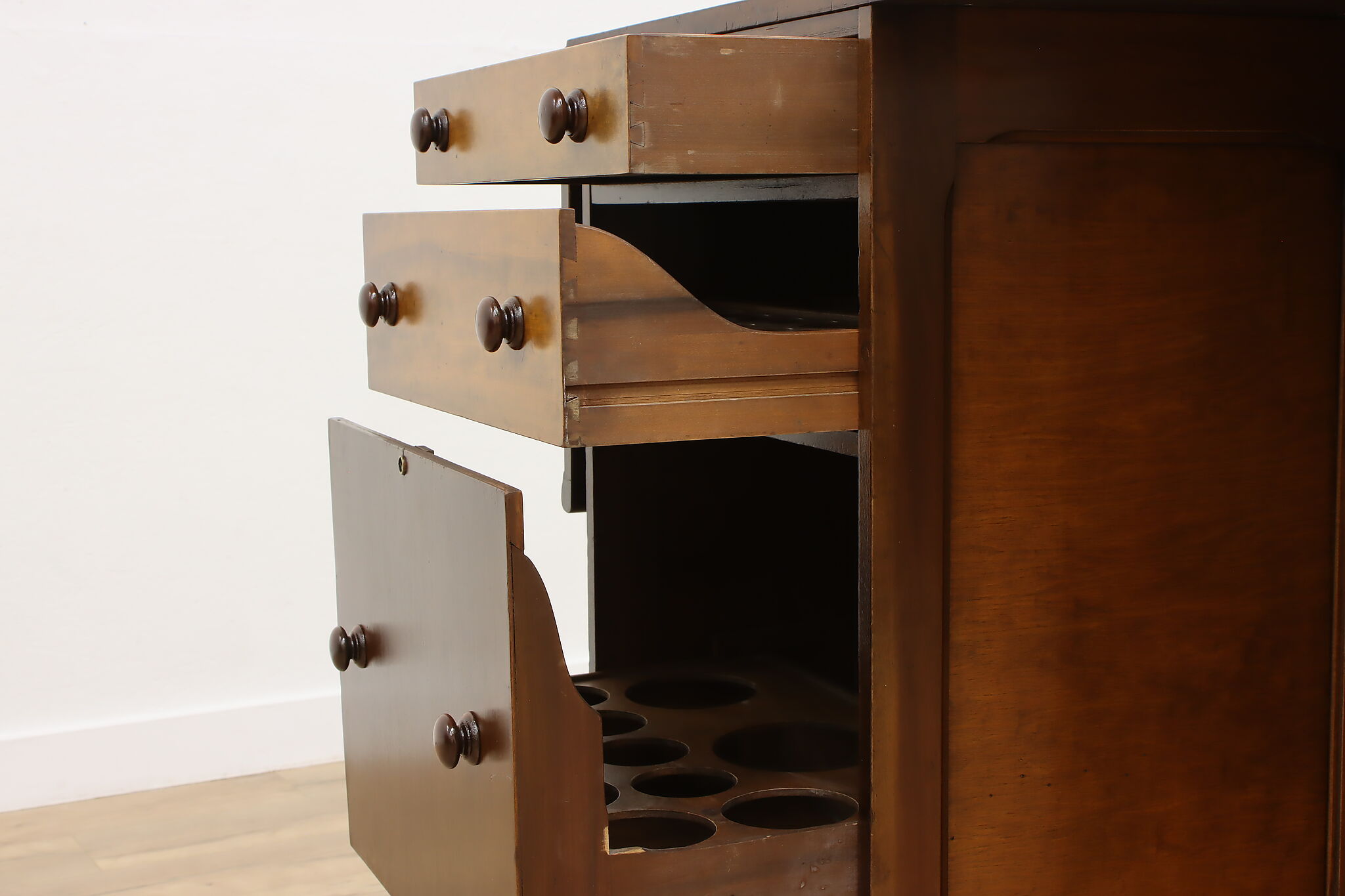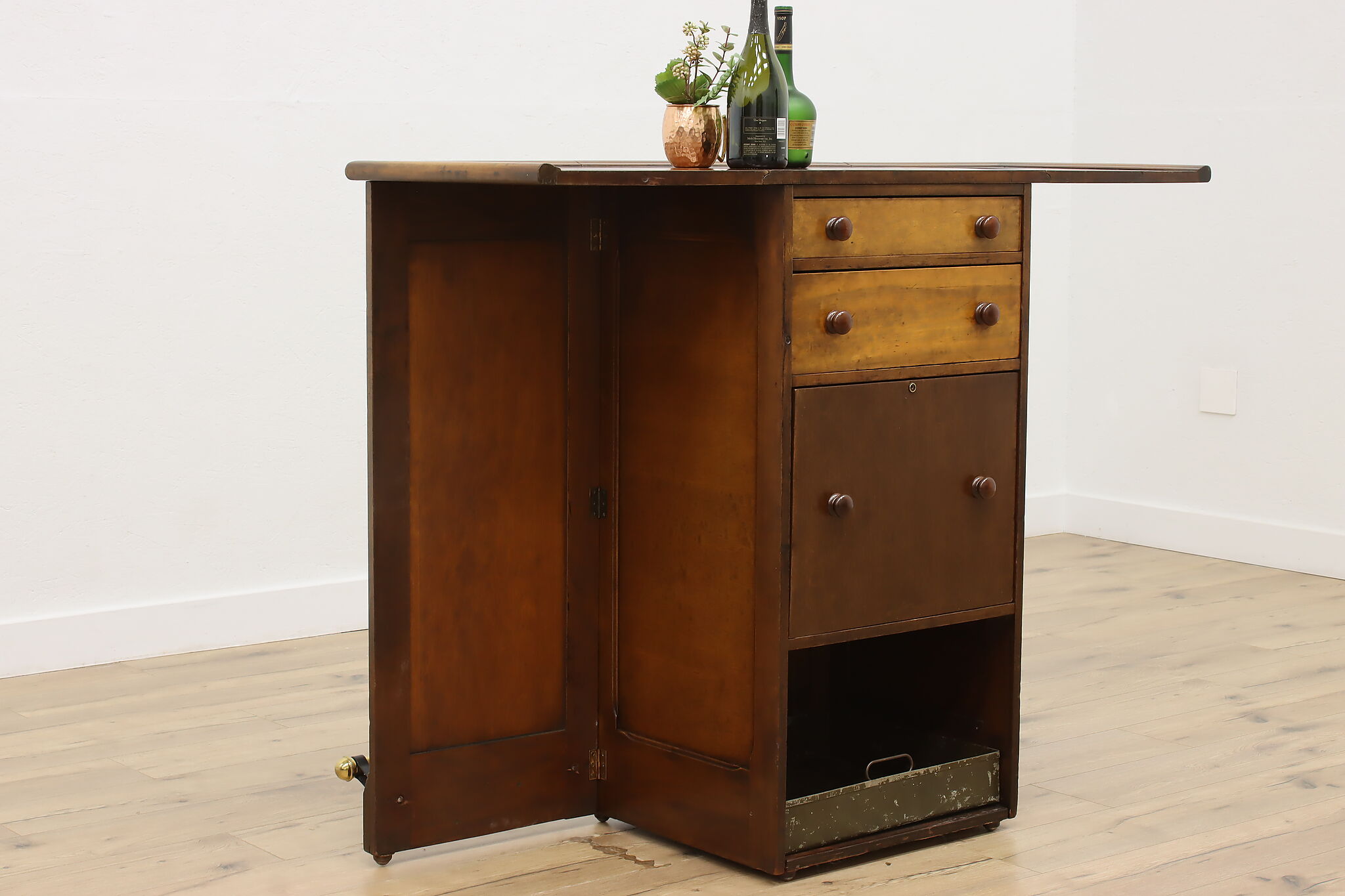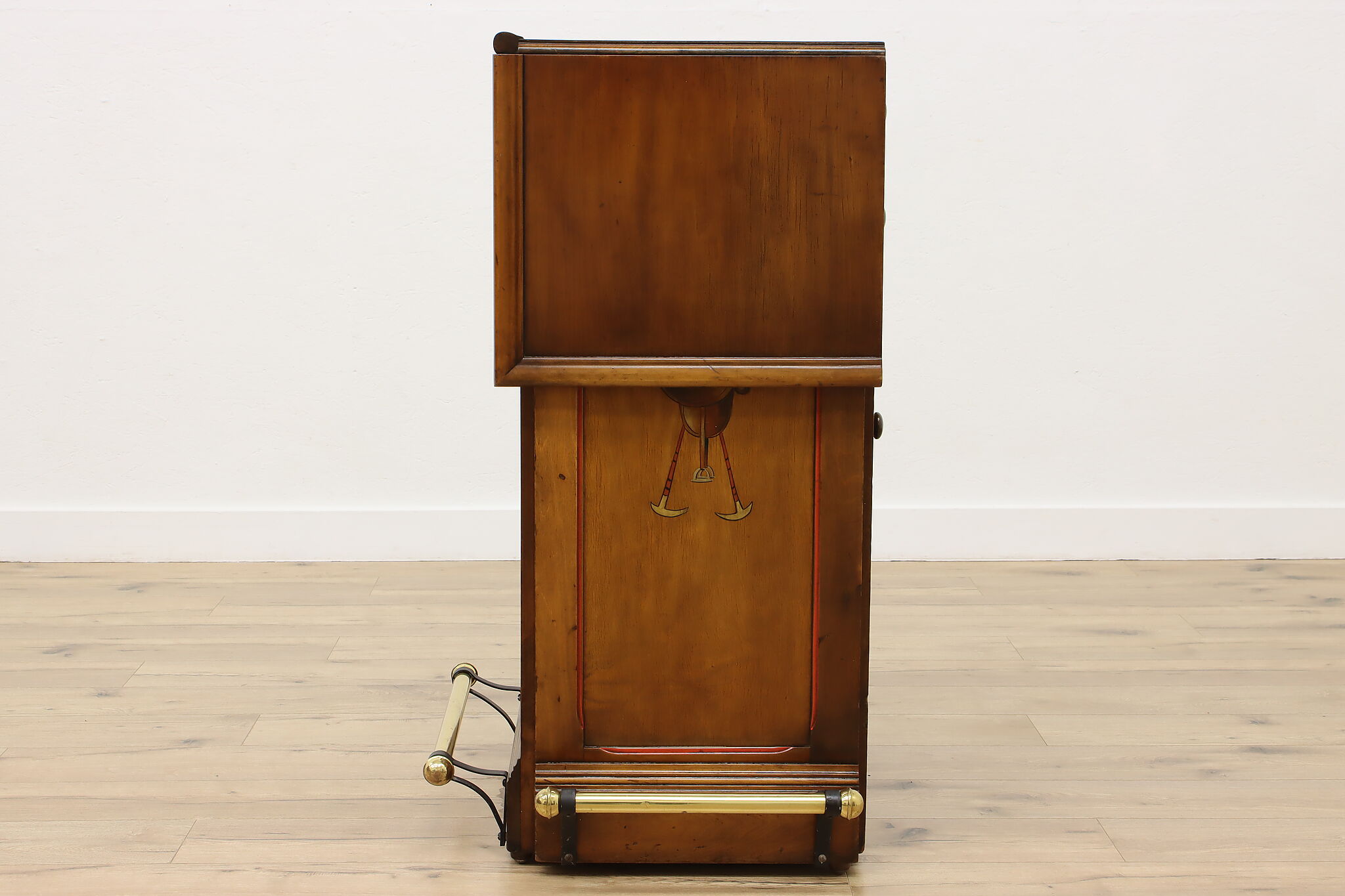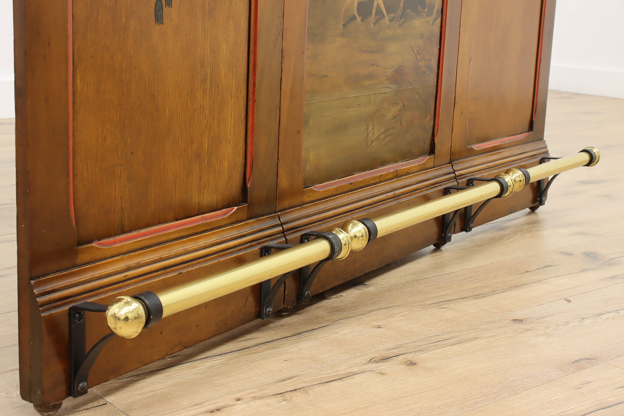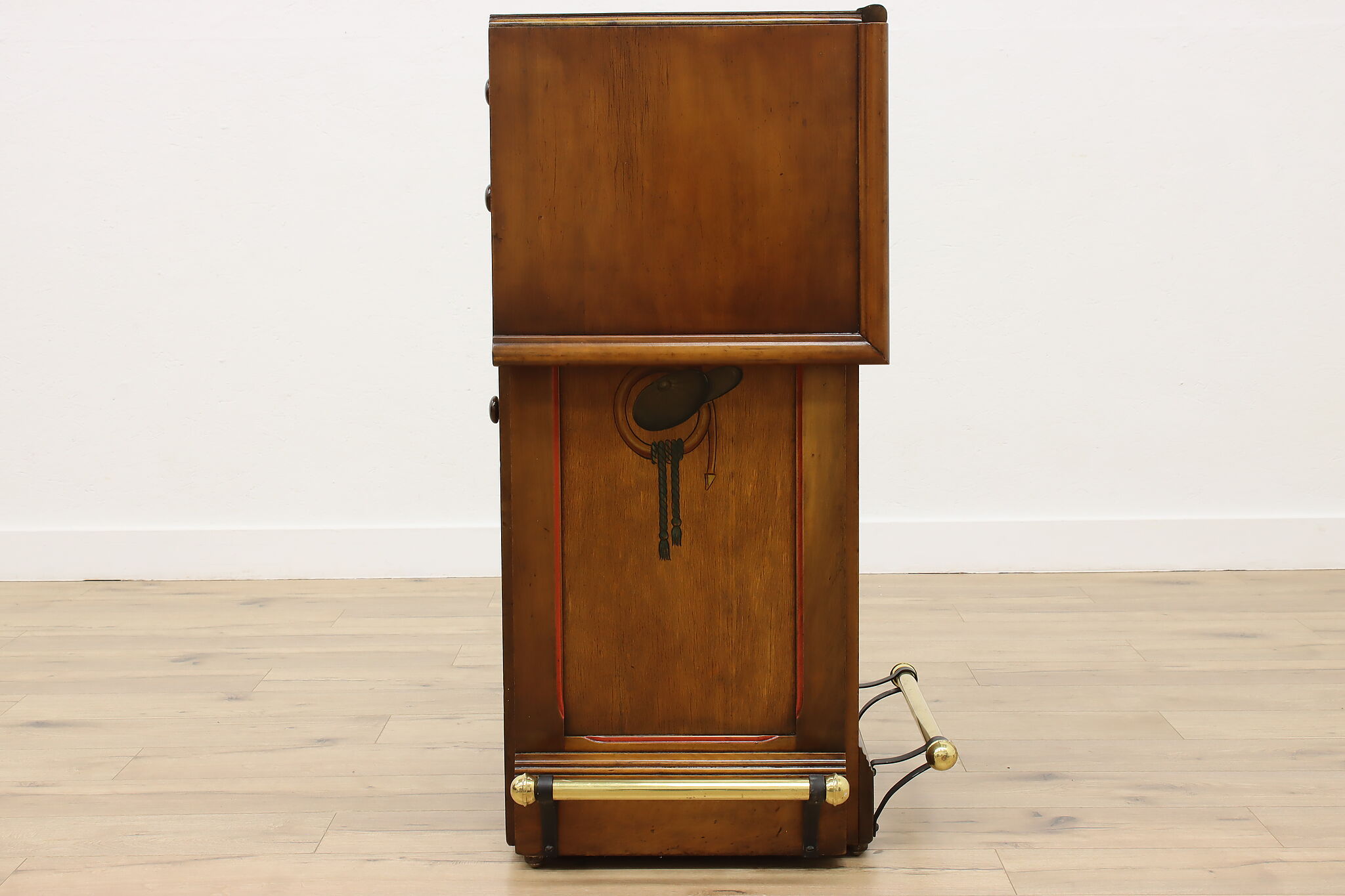 This unique folding bar cabinet has drop leaves supported by swing out doors to extend your serving area! It has also been beautifully decorated with a scene of a traditional English fox hunt.