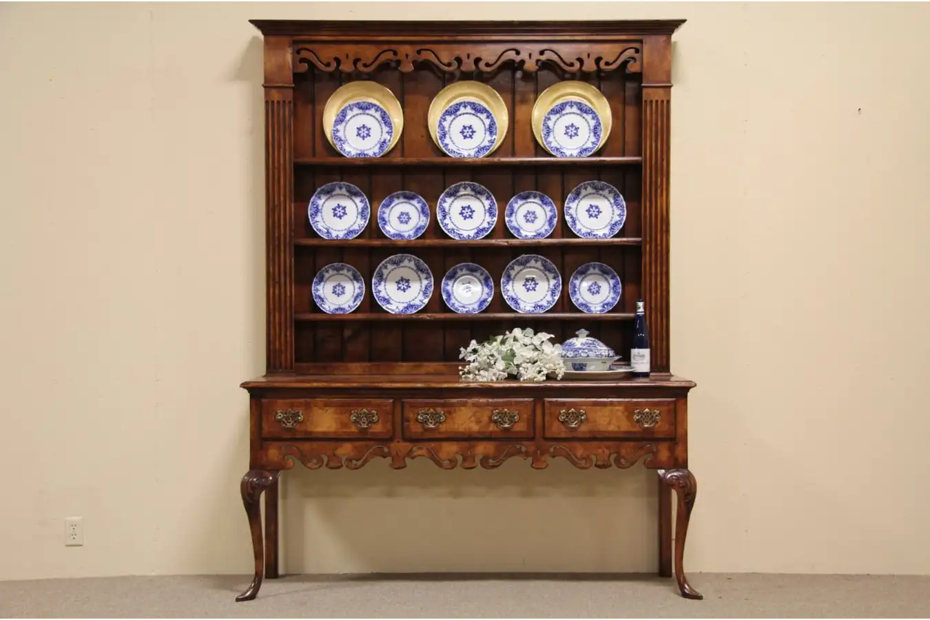 Graceful legs are delicate, drawers have hand cut dovetails. The upper display section has shelves with plate grooves and wide wainscoting. Drawer fronts and top are banded on this expertly hand crafted vintage furniture.