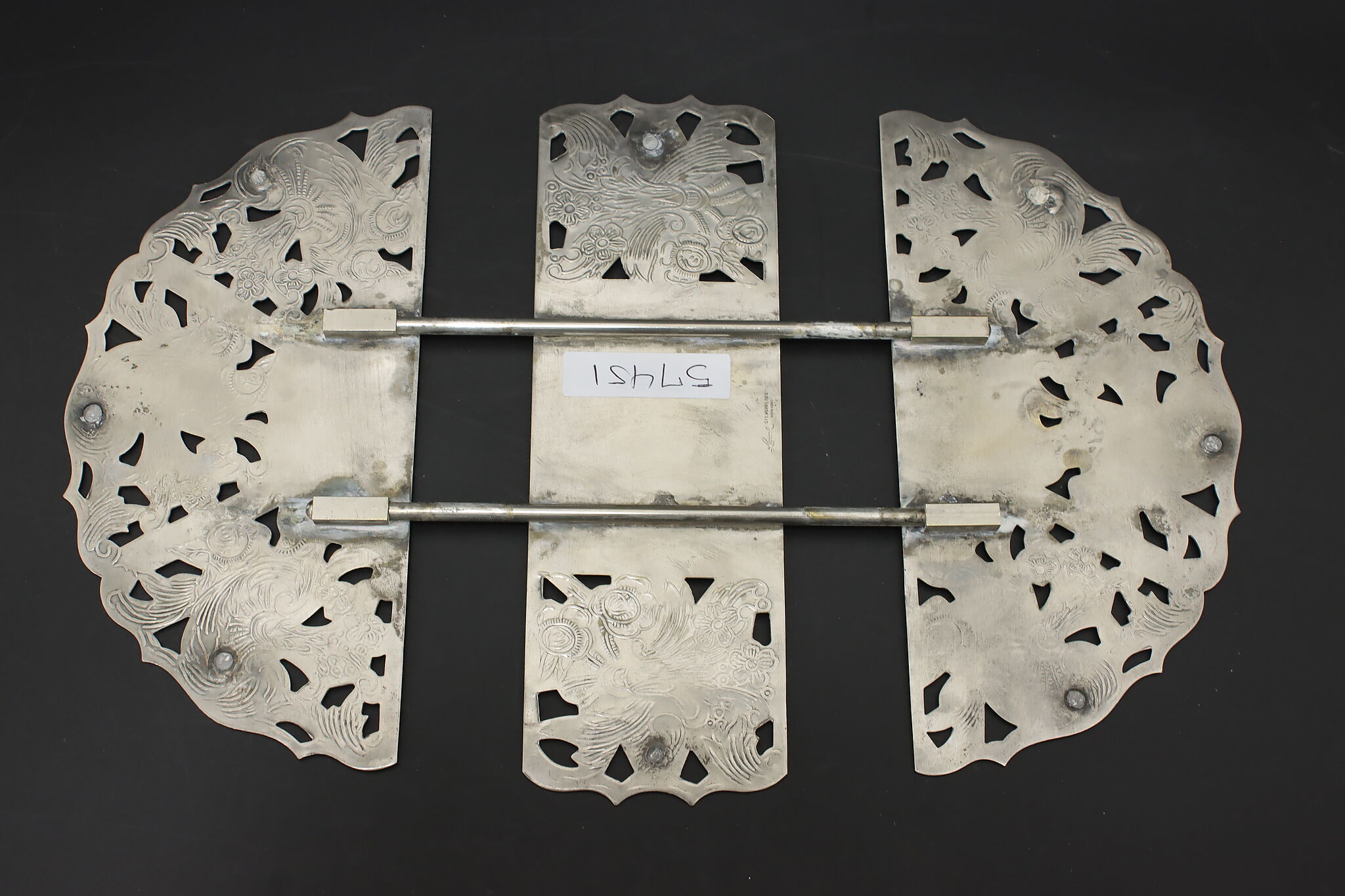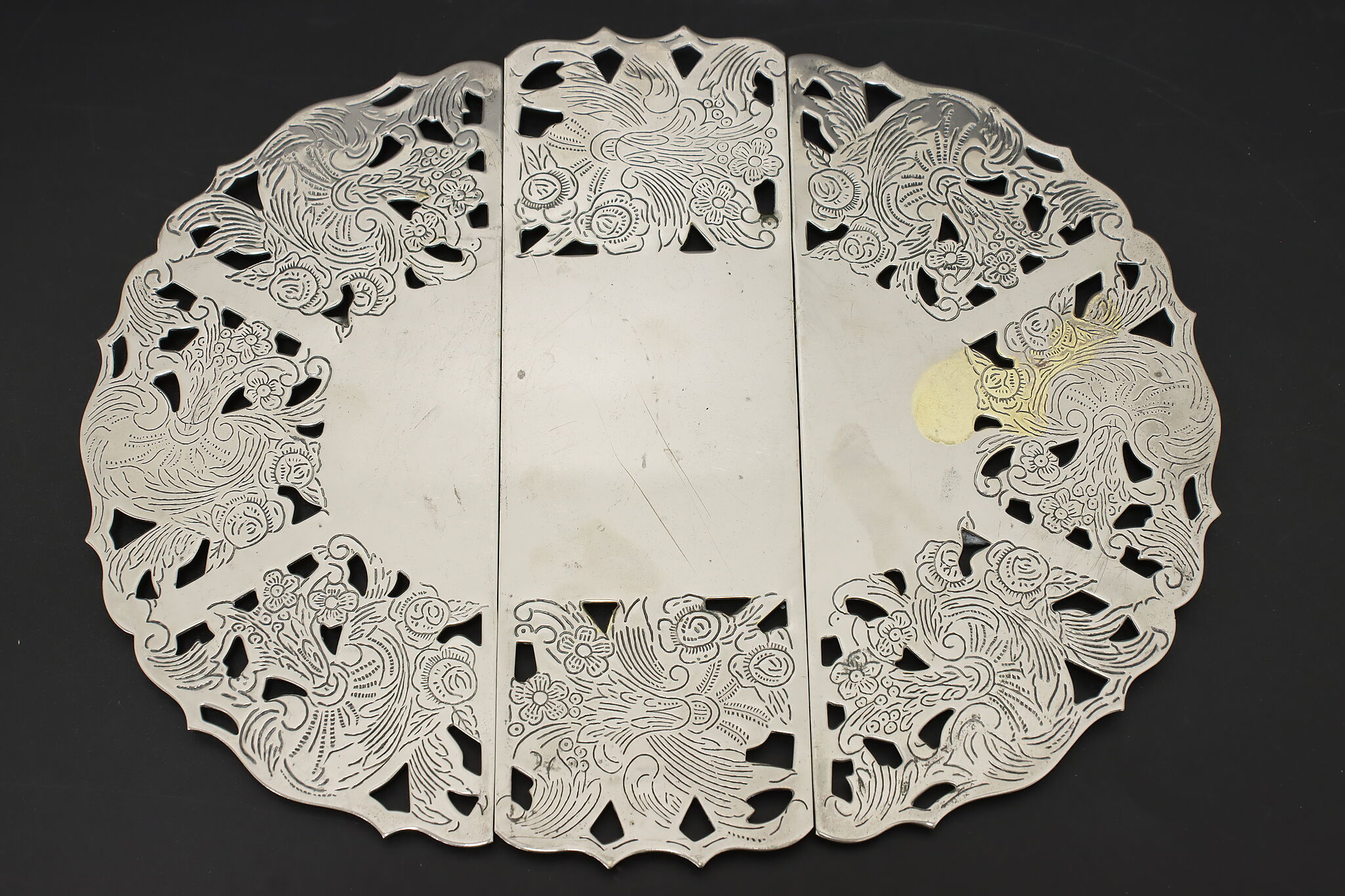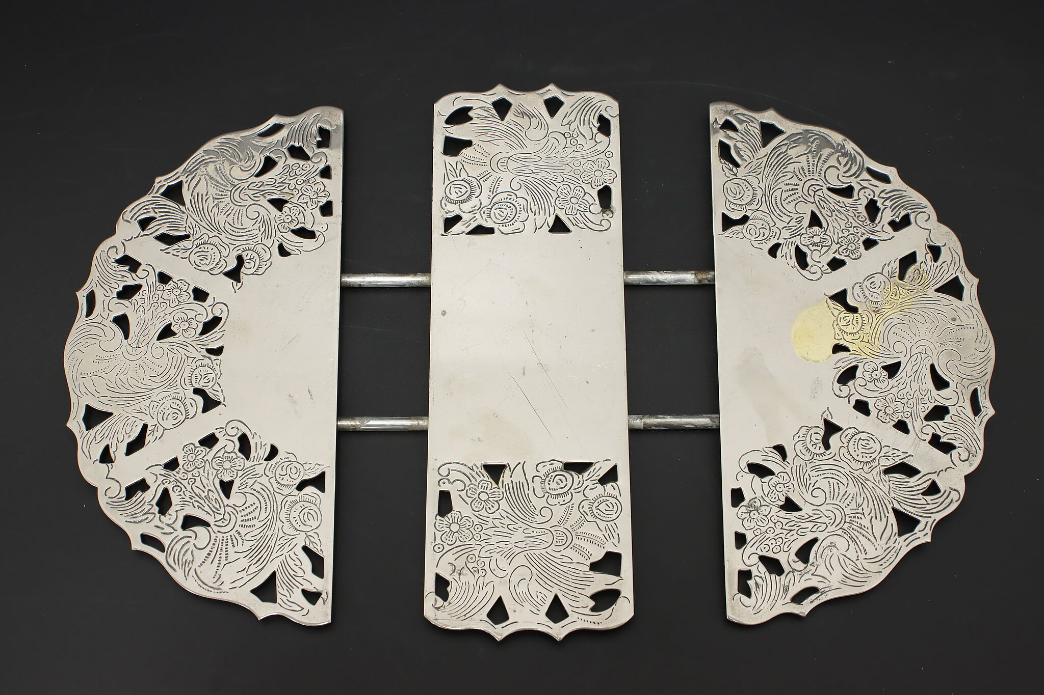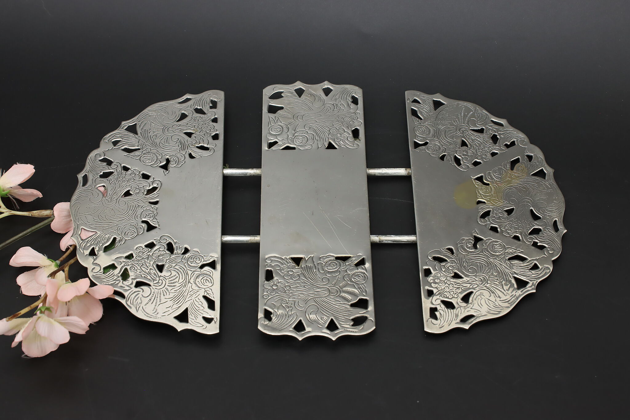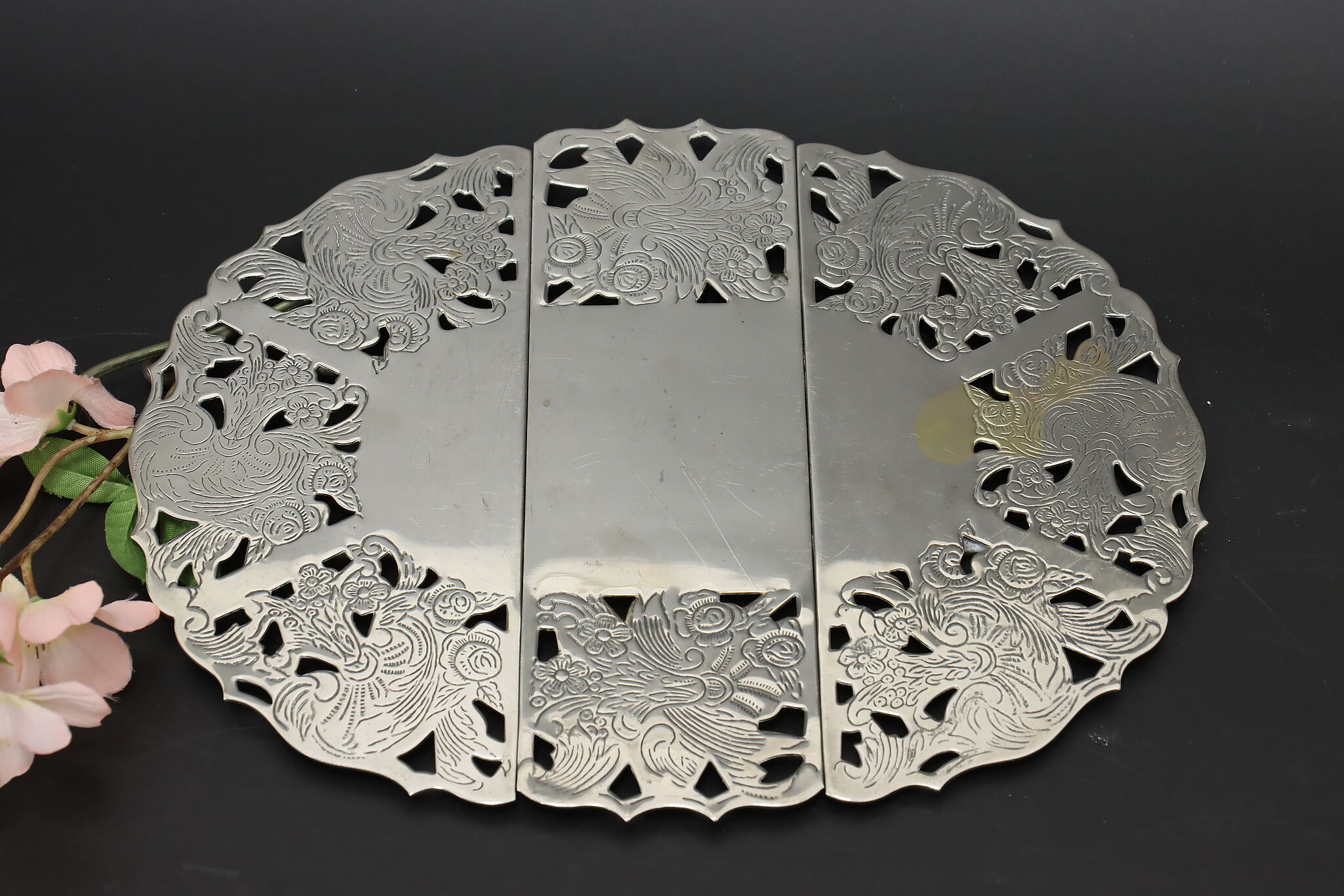 A wonderfully engraved tabletop trivet expands to fit all of your hot dishes.